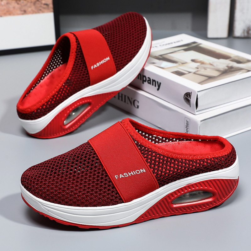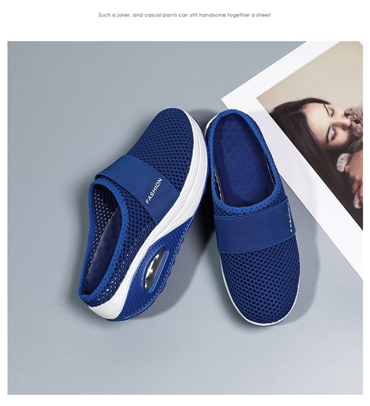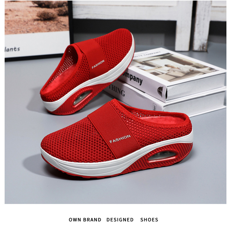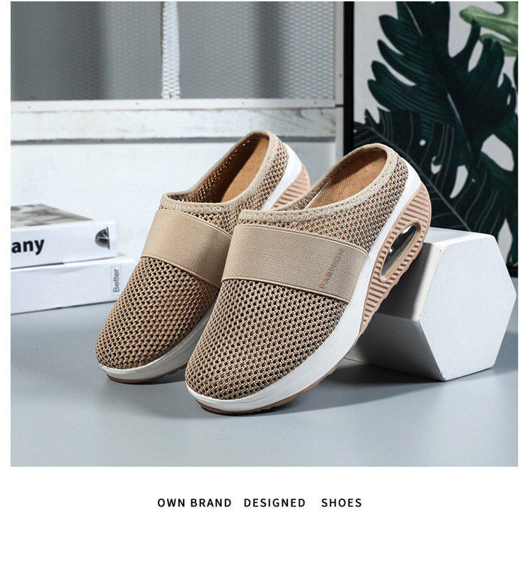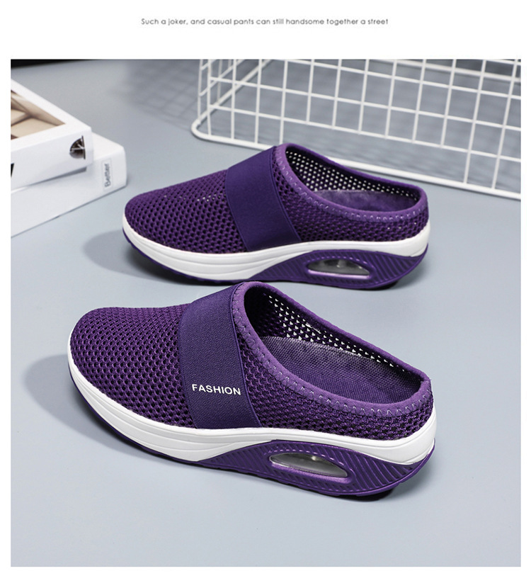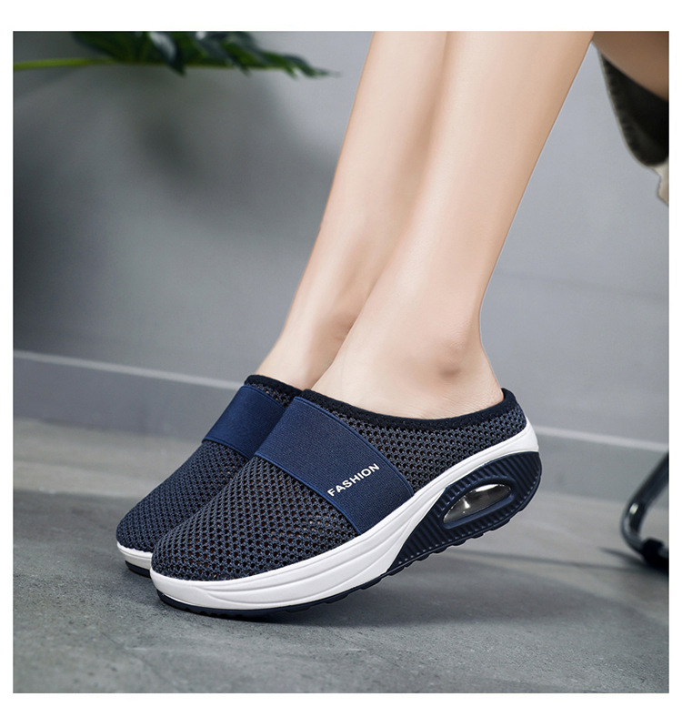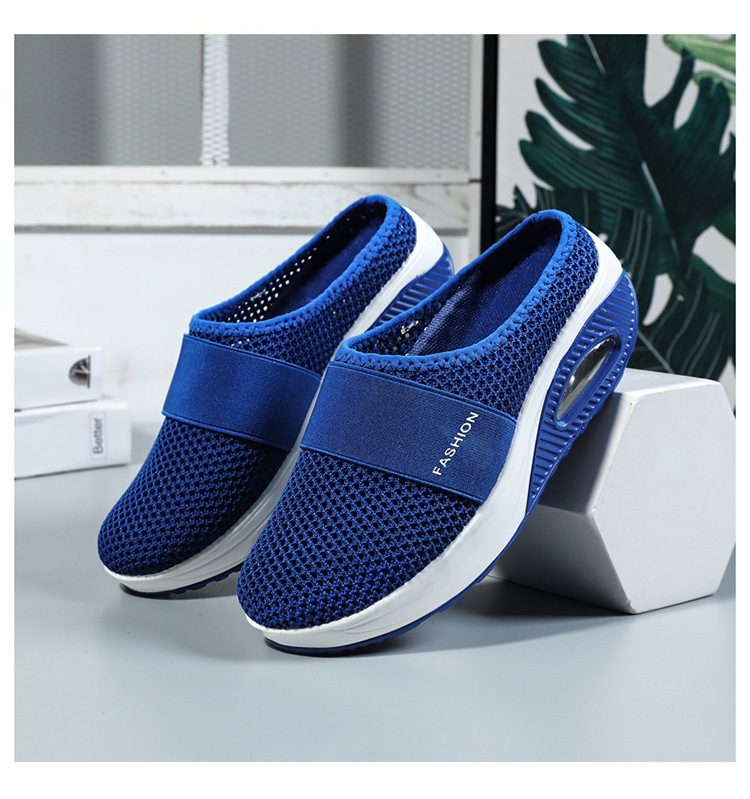 여성을위한 Fujian 제조 업체 크로스 보더 대형 메쉬 슬리퍼 여름 하프 슬리퍼 에어 쿠션 캐주얼 스포츠 신발 플라이 짠 메쉬