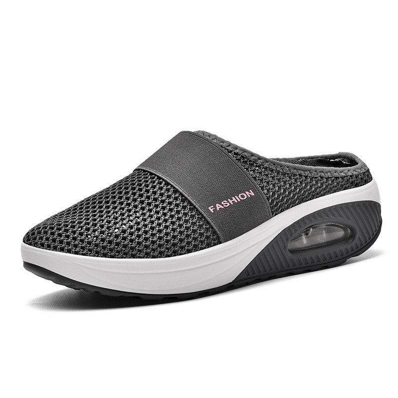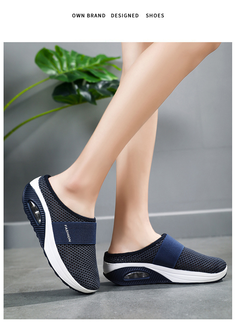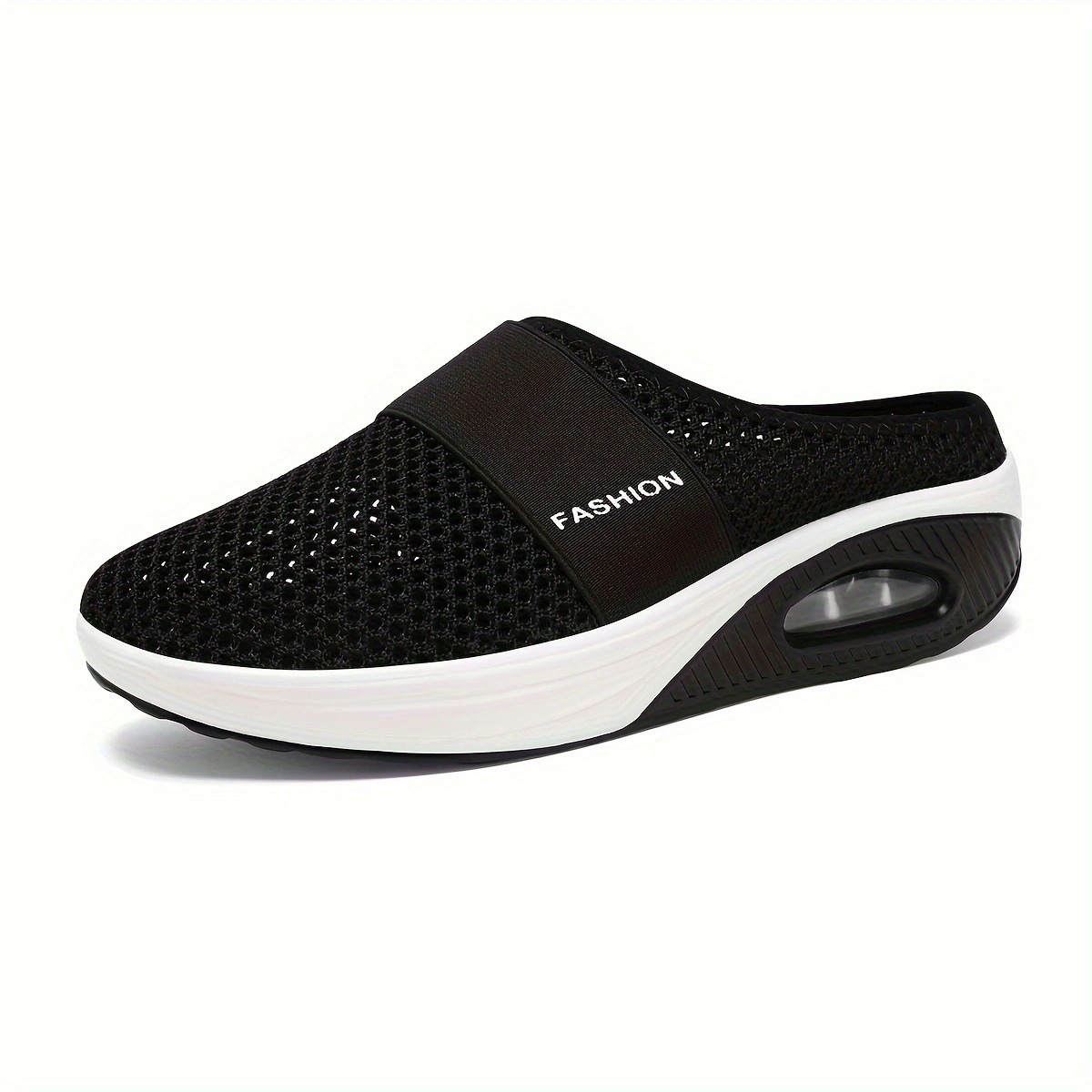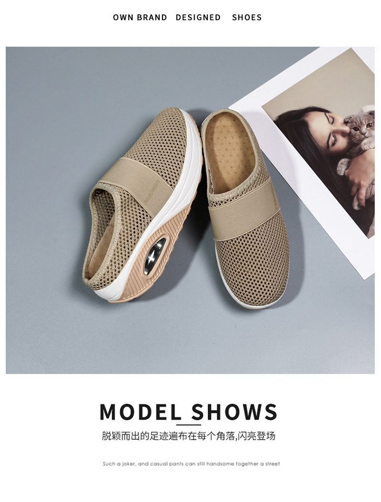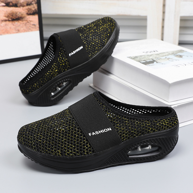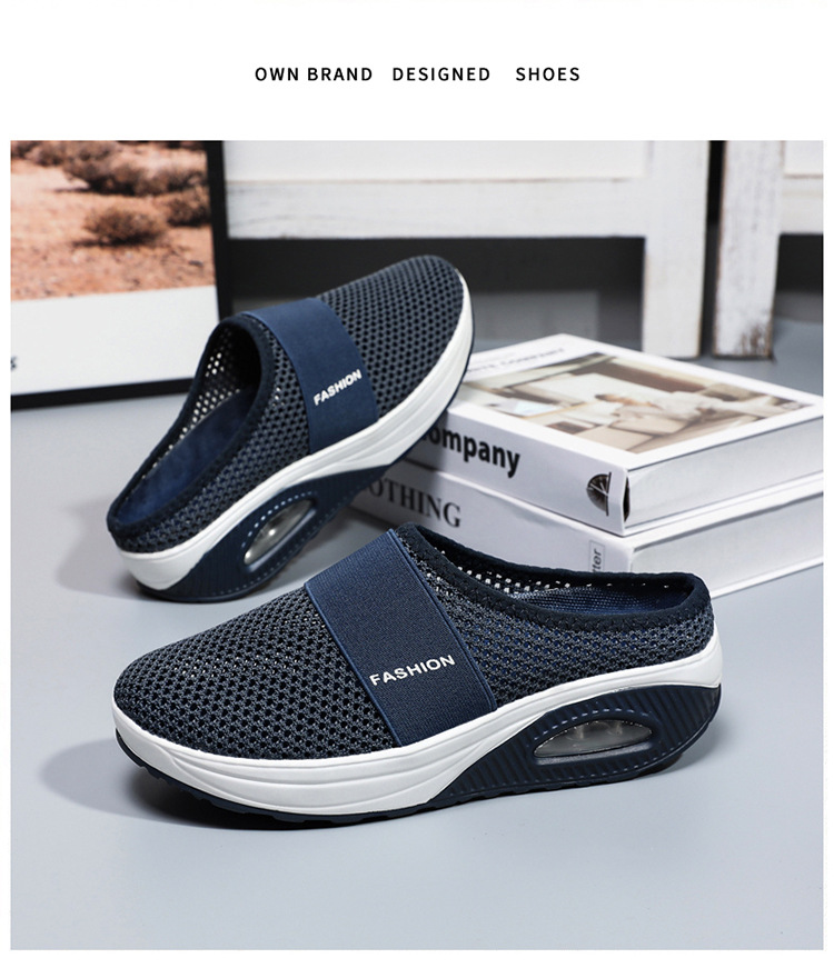 여성을위한 Fujian 제조 업체 크로스 보더 대형 메쉬 슬리퍼 여름 하프 슬리퍼 에어 쿠션 캐주얼 스포츠 신발 플라이 짠 메쉬