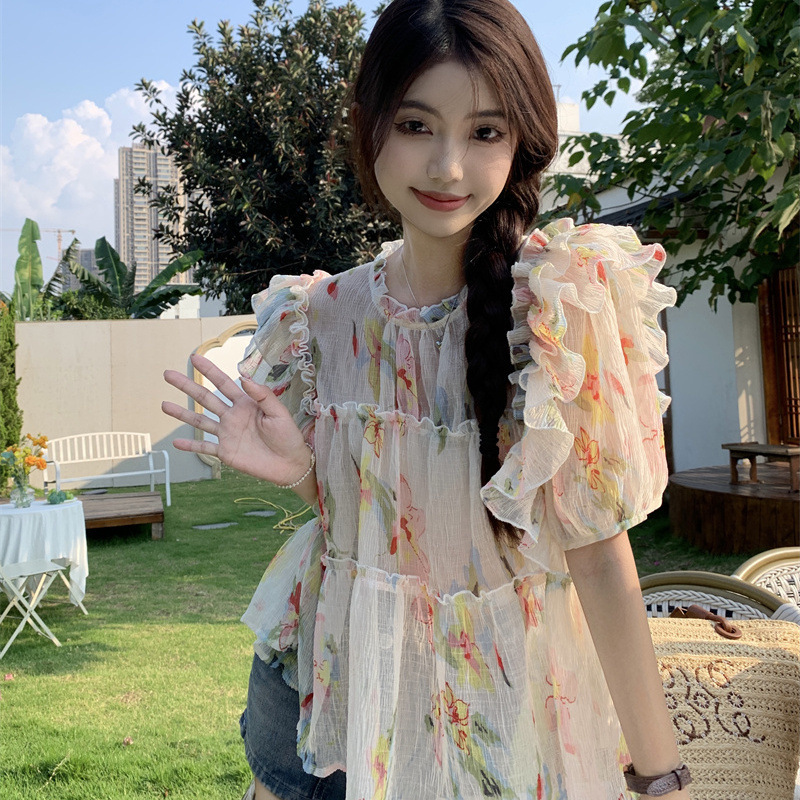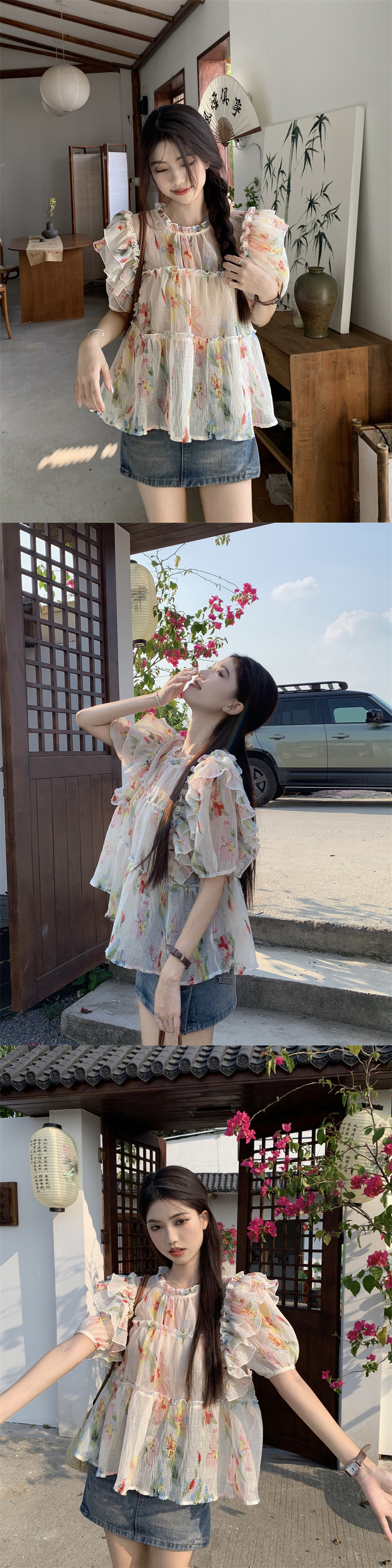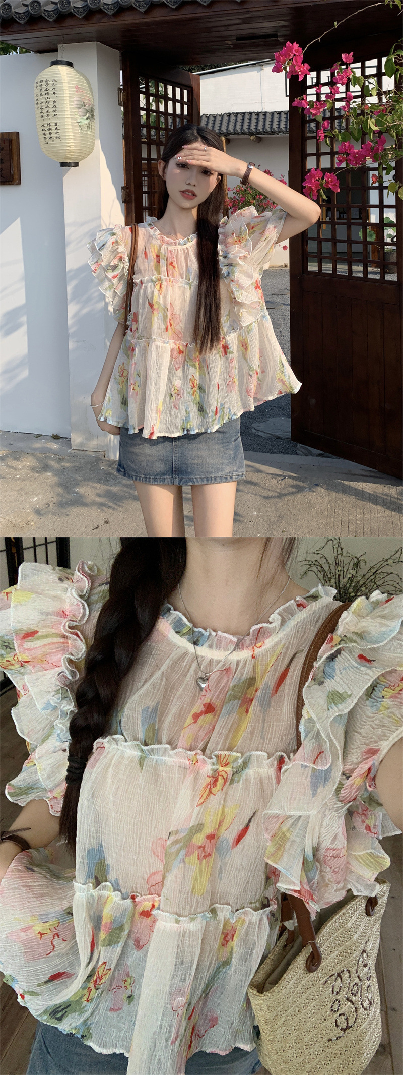 여성을위한 귀 스플 라이스 플라잉 슬리브 쉬폰 셔츠 여름 새로운 달콤한 질감 꽃 디자인 루즈 탑