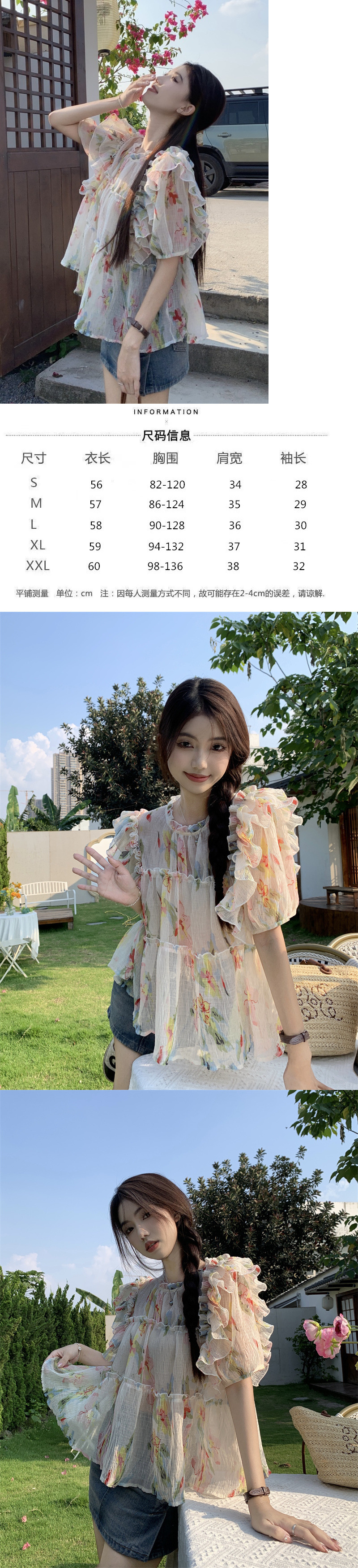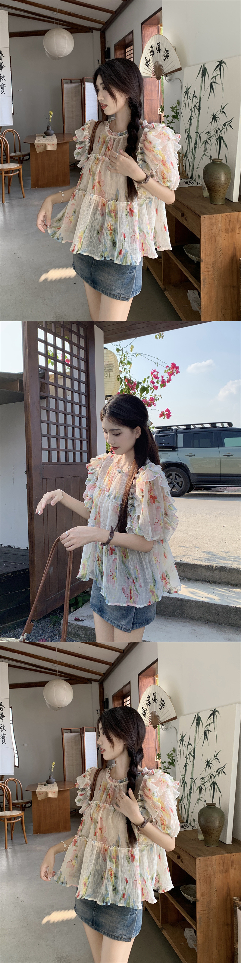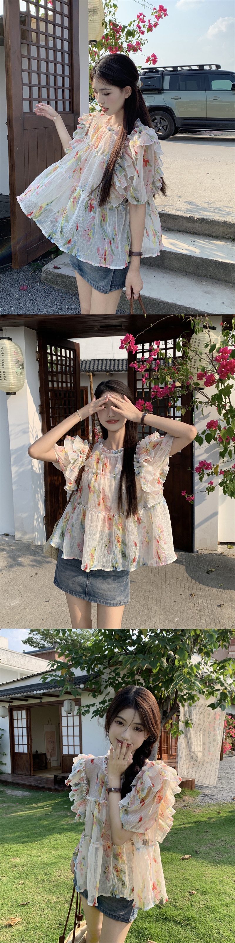 여성을위한 귀 스플 라이스 플라잉 슬리브 쉬폰 셔츠 여름 새로운 달콤한 질감 꽃 디자인 루즈 탑
