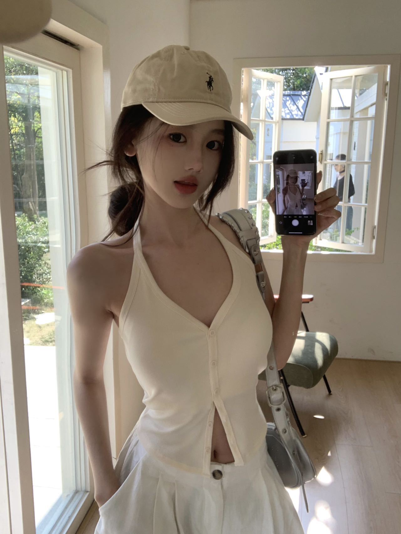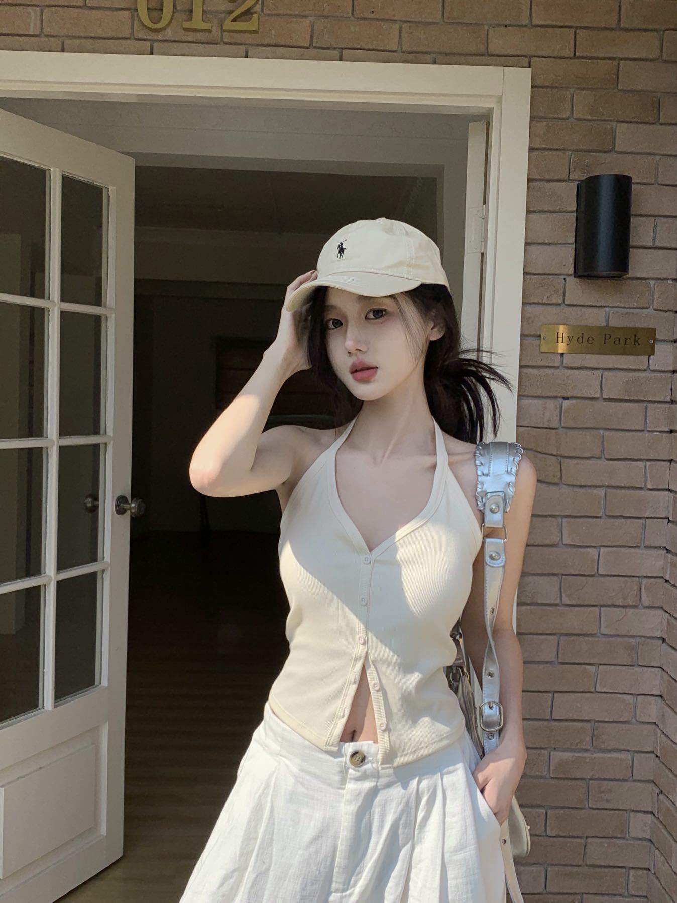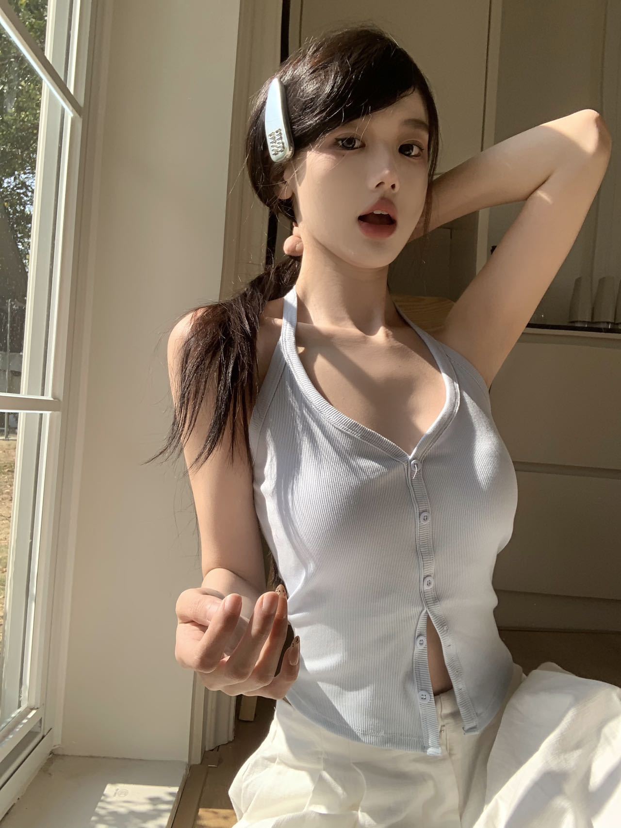디자인 홀터넥 브이넥 싱글 브레스트 가슴 패드 탑, 다용도 민소매 여름 핫걸 슬림 아우터 백리스 슬링스토어 가기