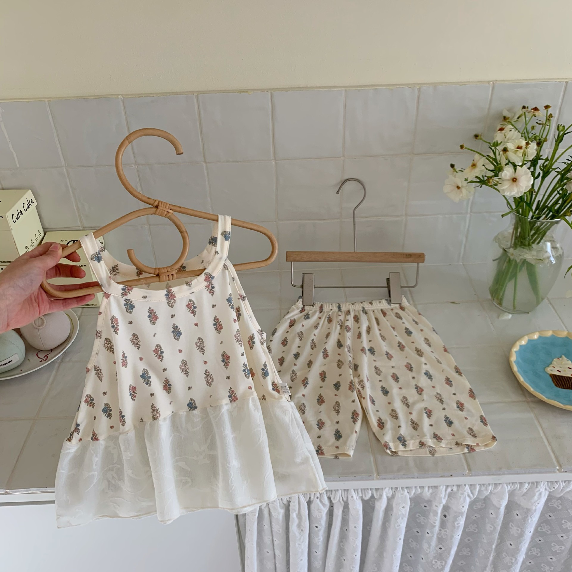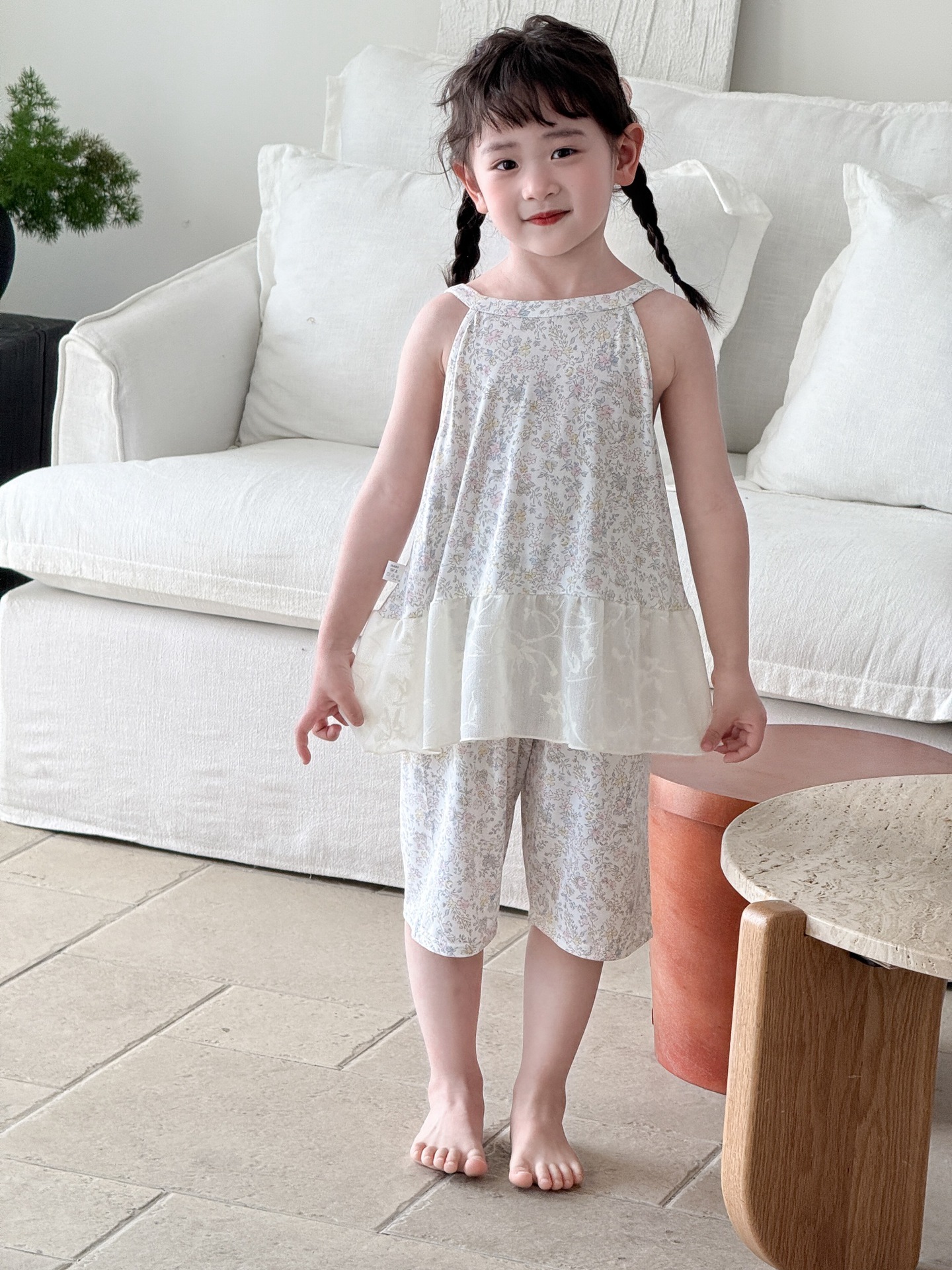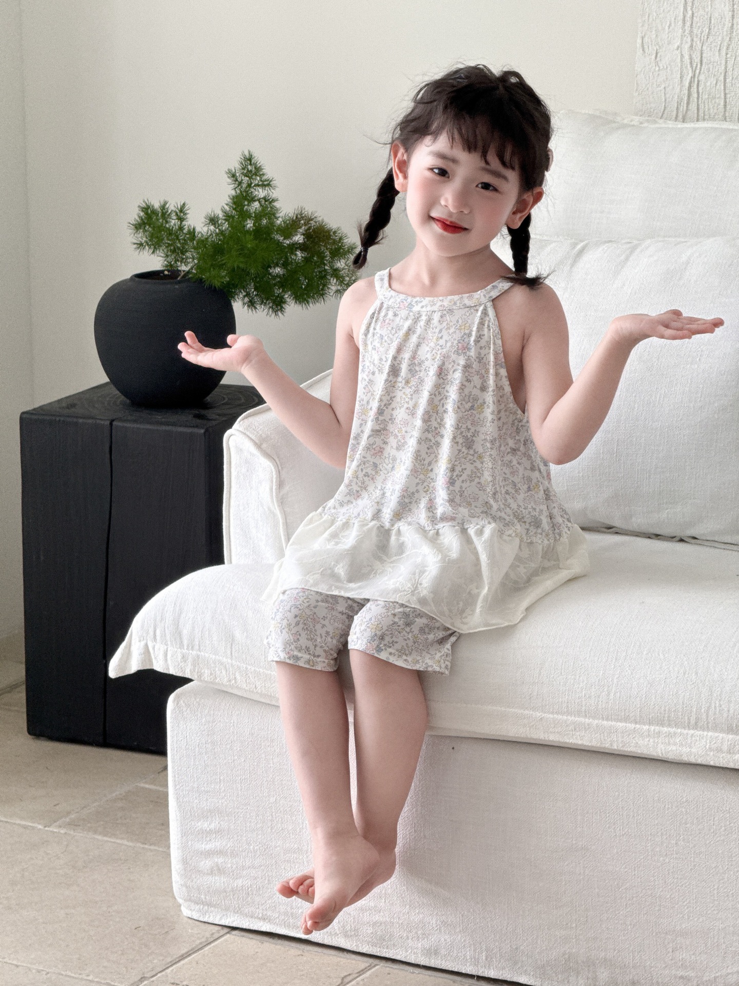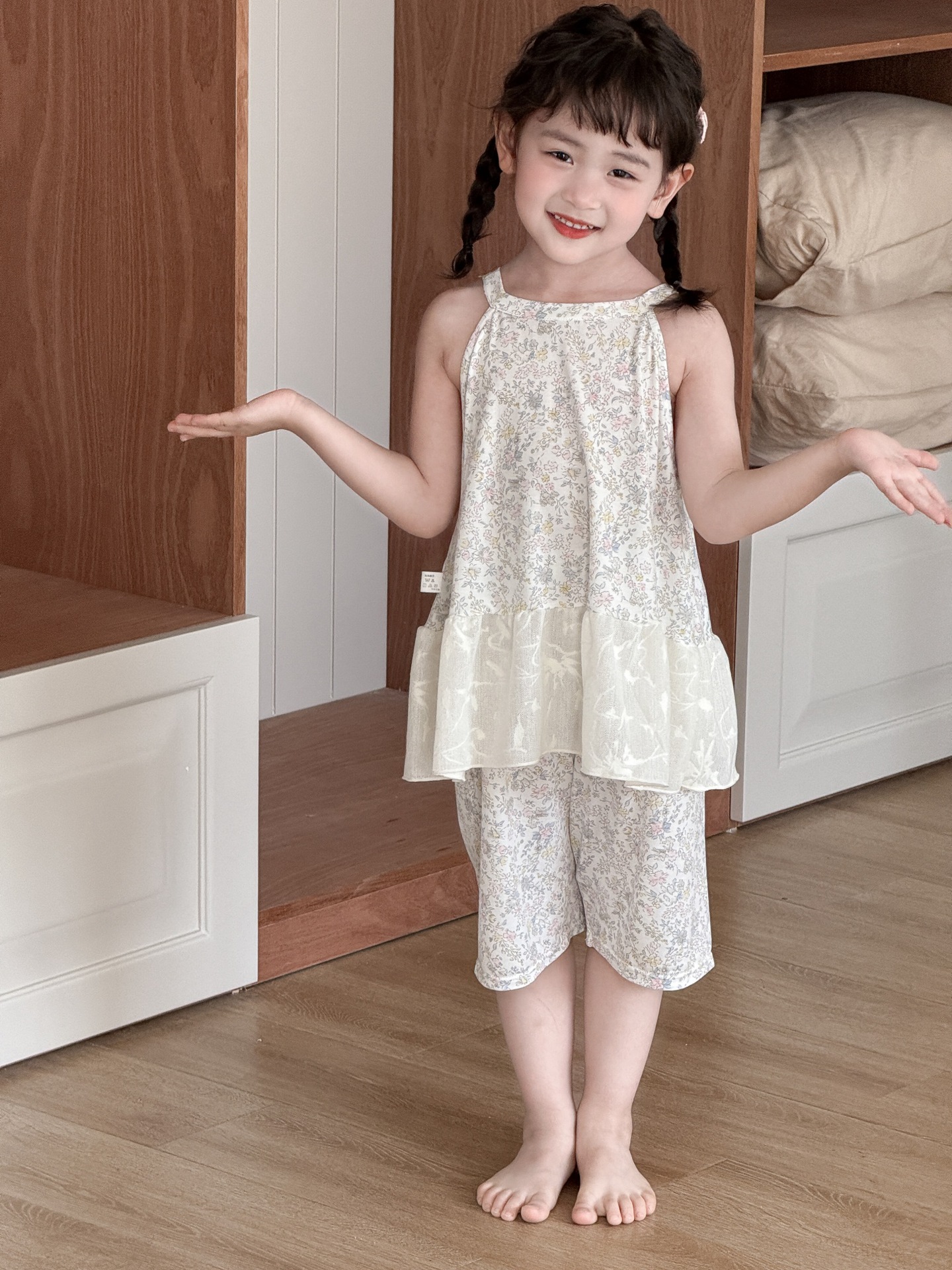 여아용 모달 잠옷, 여름 얇은 멜빵 잠옷, 포레스트 꽃무늬 탑, 와이드 팬츠 세트, 민소매 꽃무늬스토어 가기