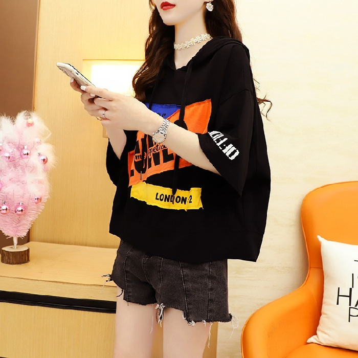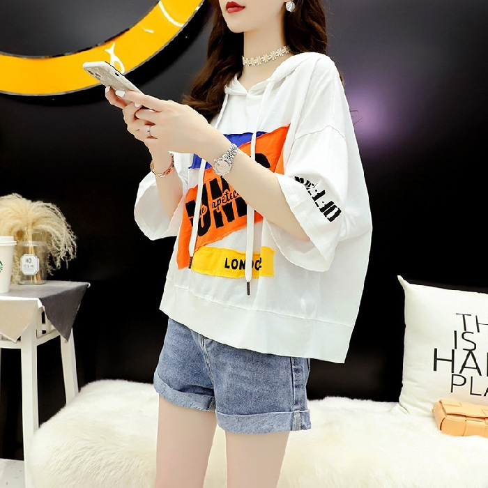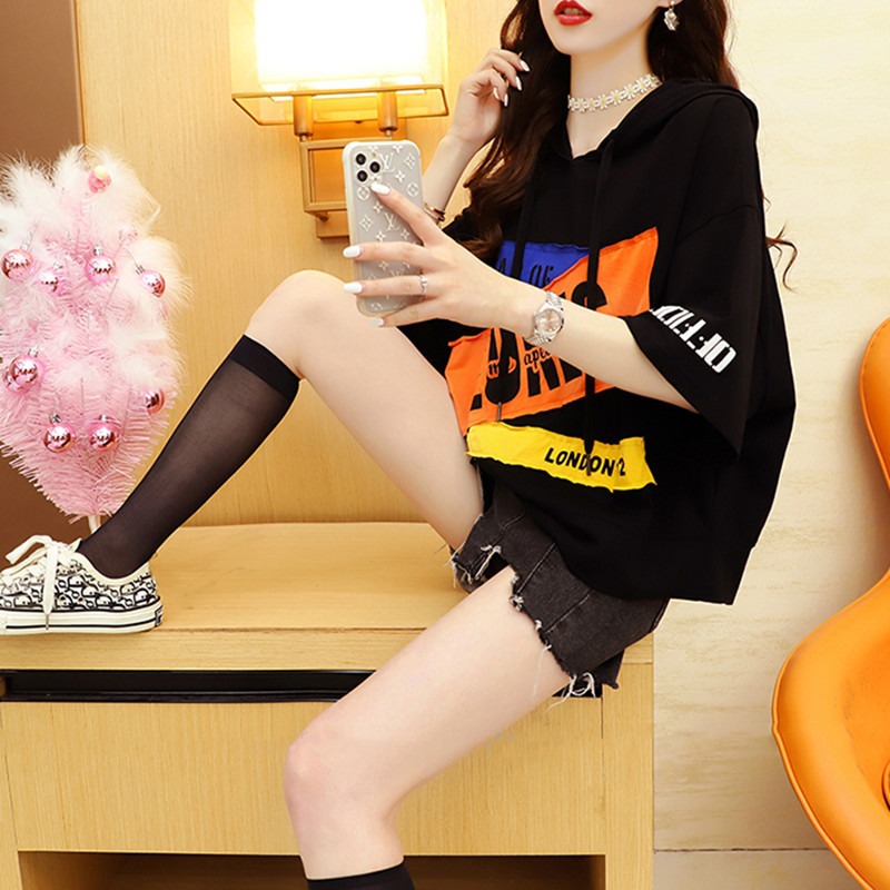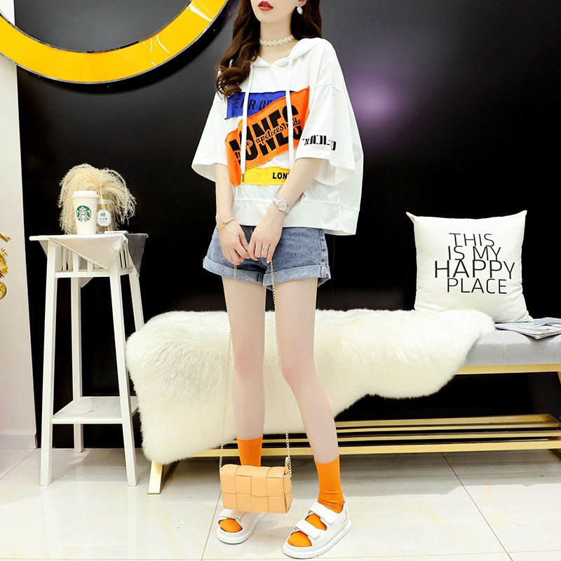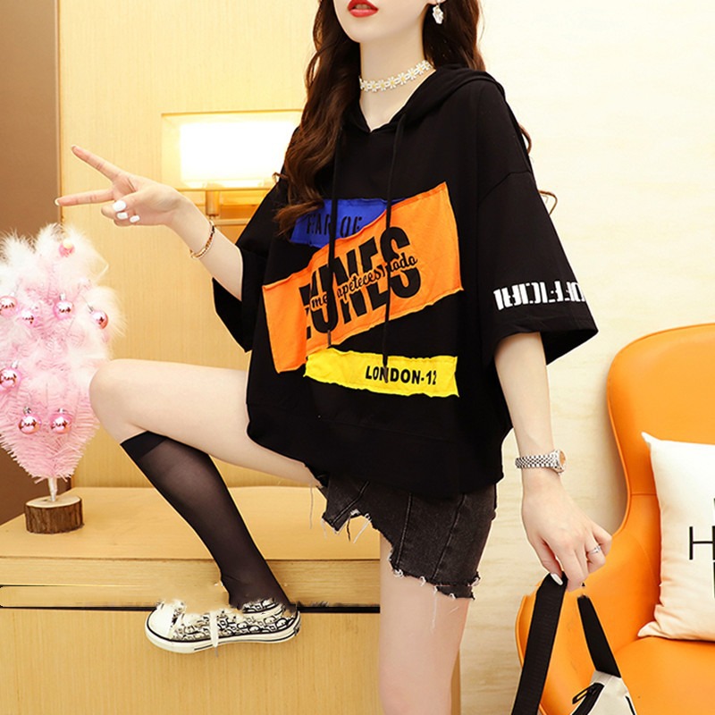 홍콩 스타일 프라이드 스트리트 올드 패셔너블 쇼트 탑 한국 스타일 Ins 학생 플러스 사이즈 느슨한 후드 반팔 티셔츠스토어 가기