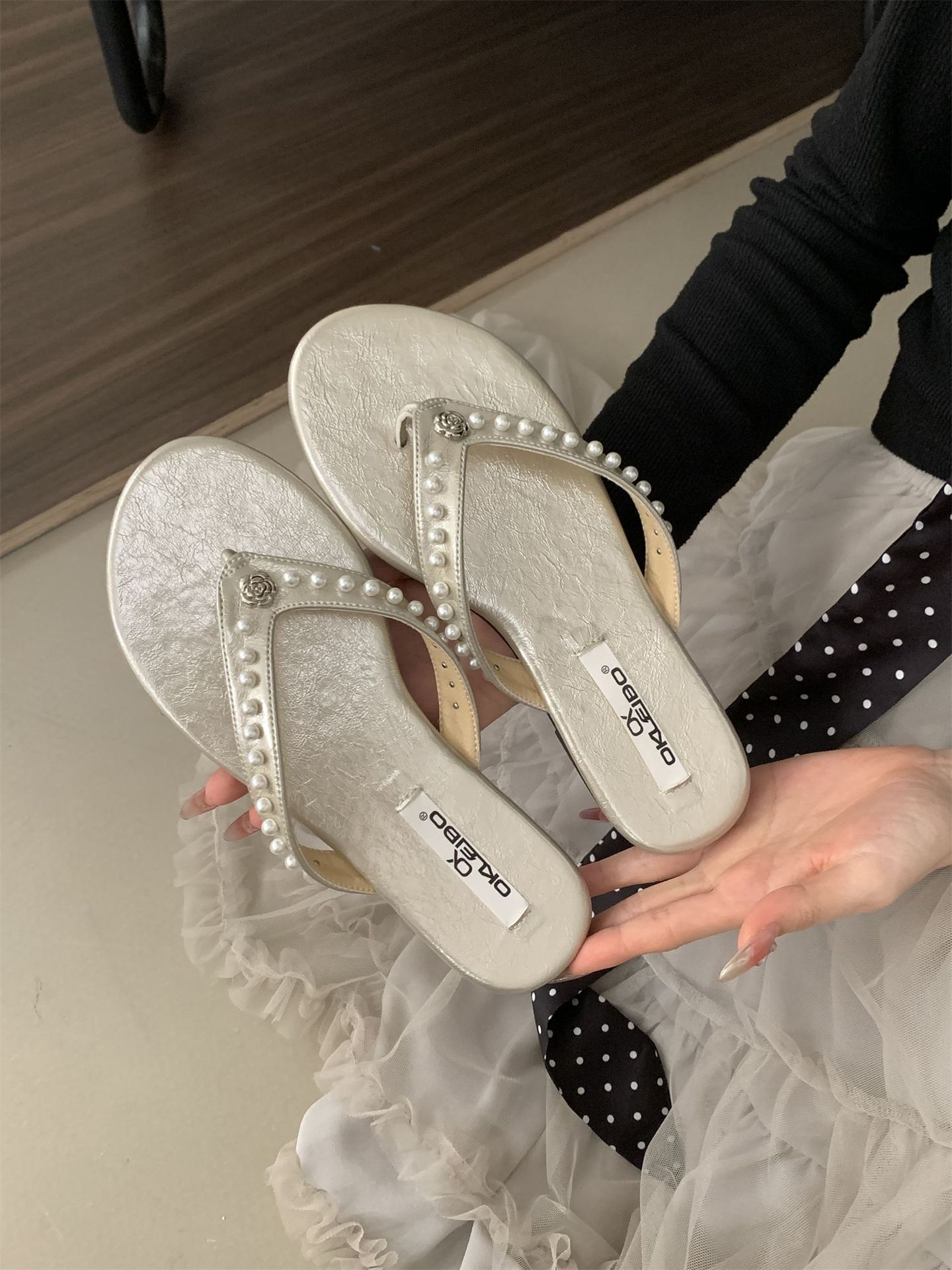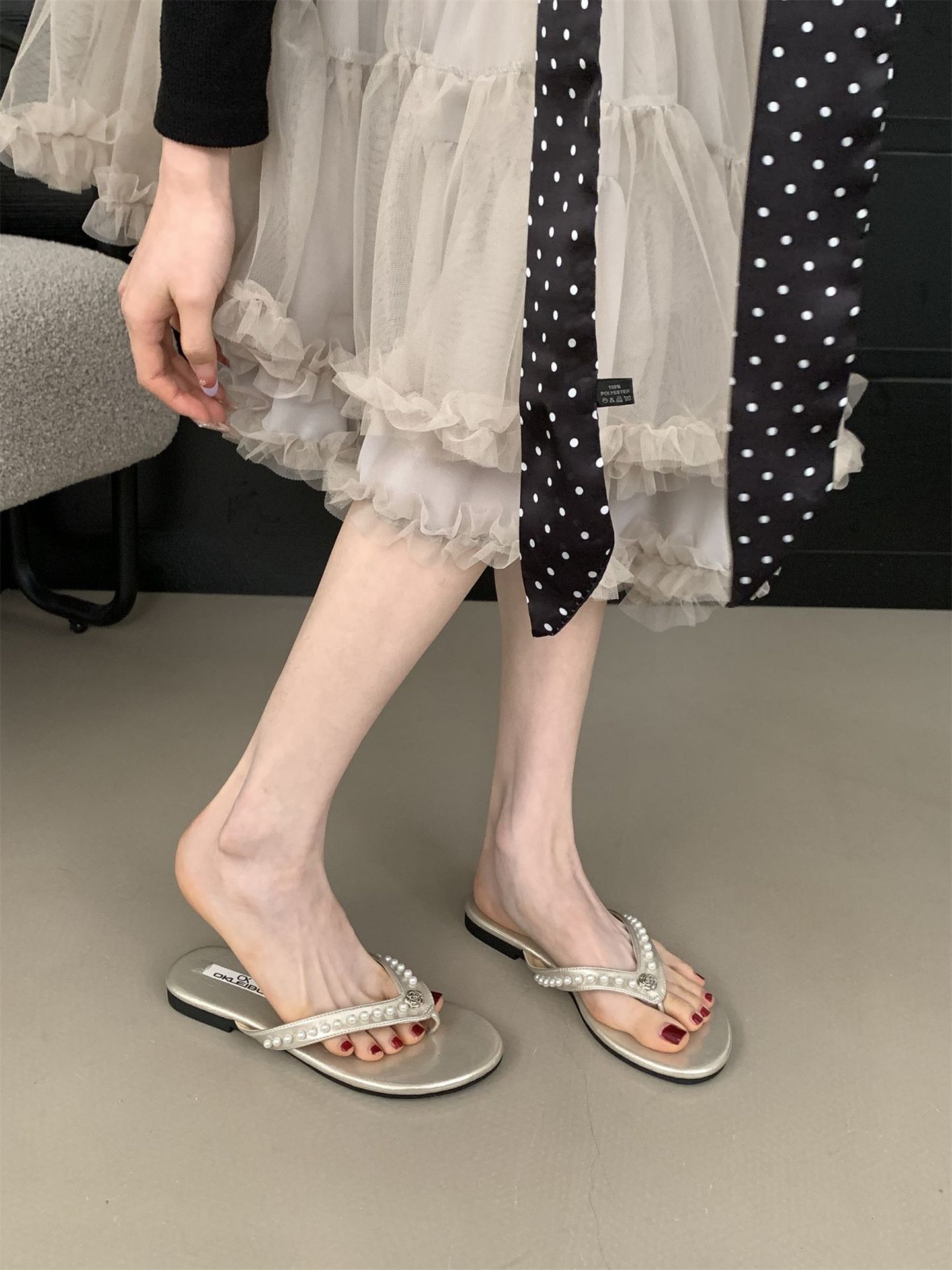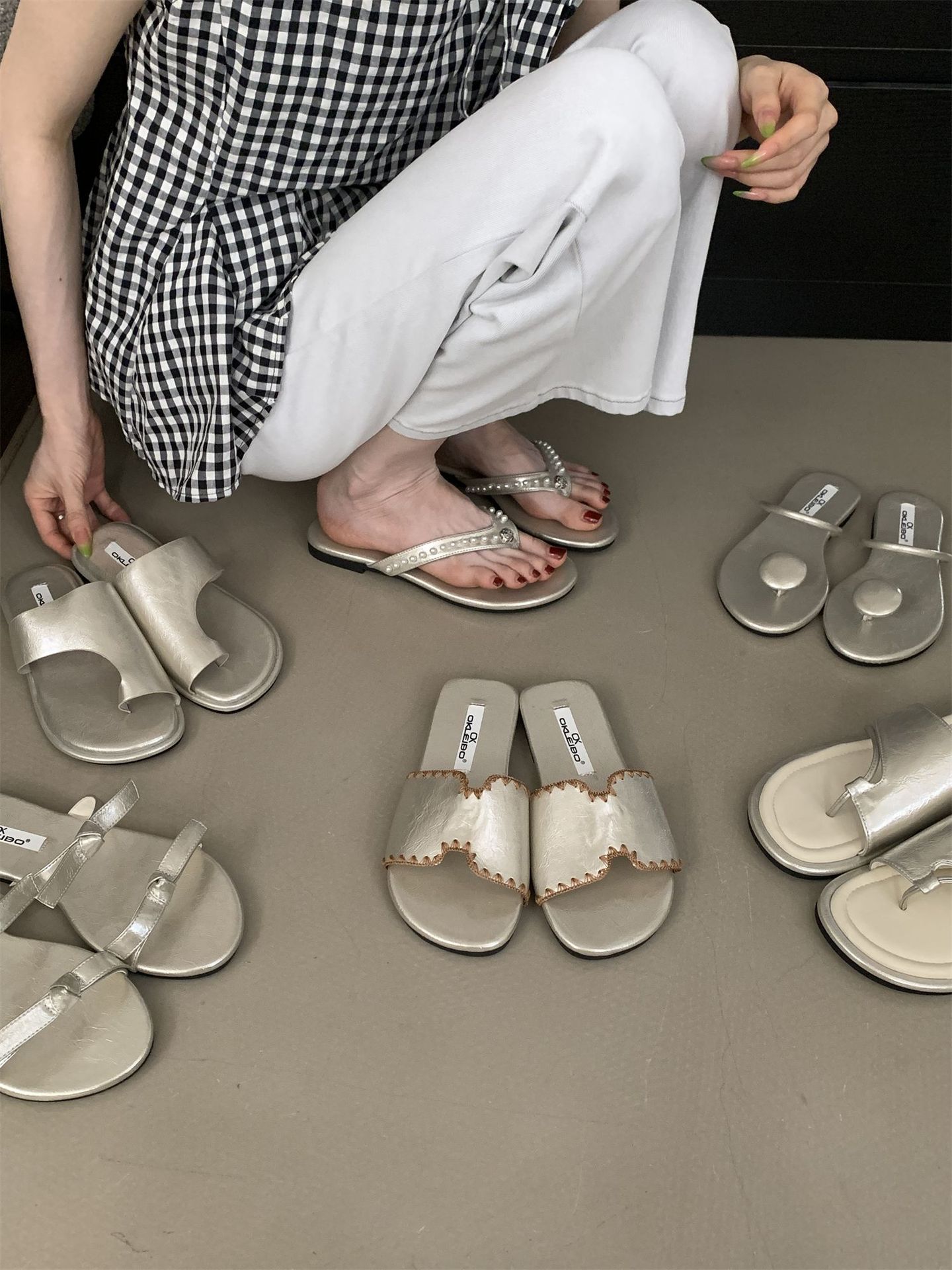 샴페인 플랫 오픈 발가락 슬리퍼 2025 여름 의상 원피스 활 슬리퍼 비치 샌들스토어 가기