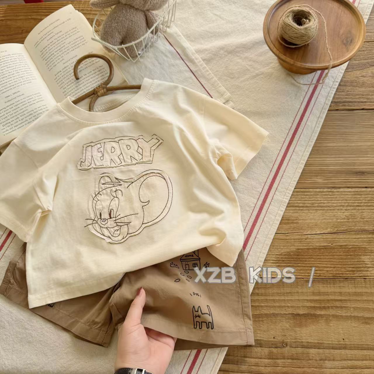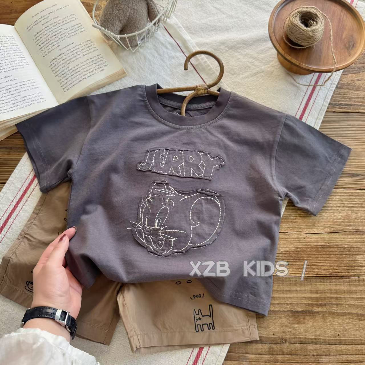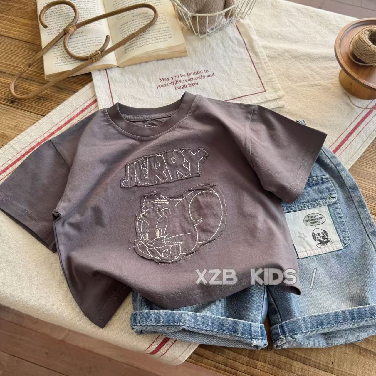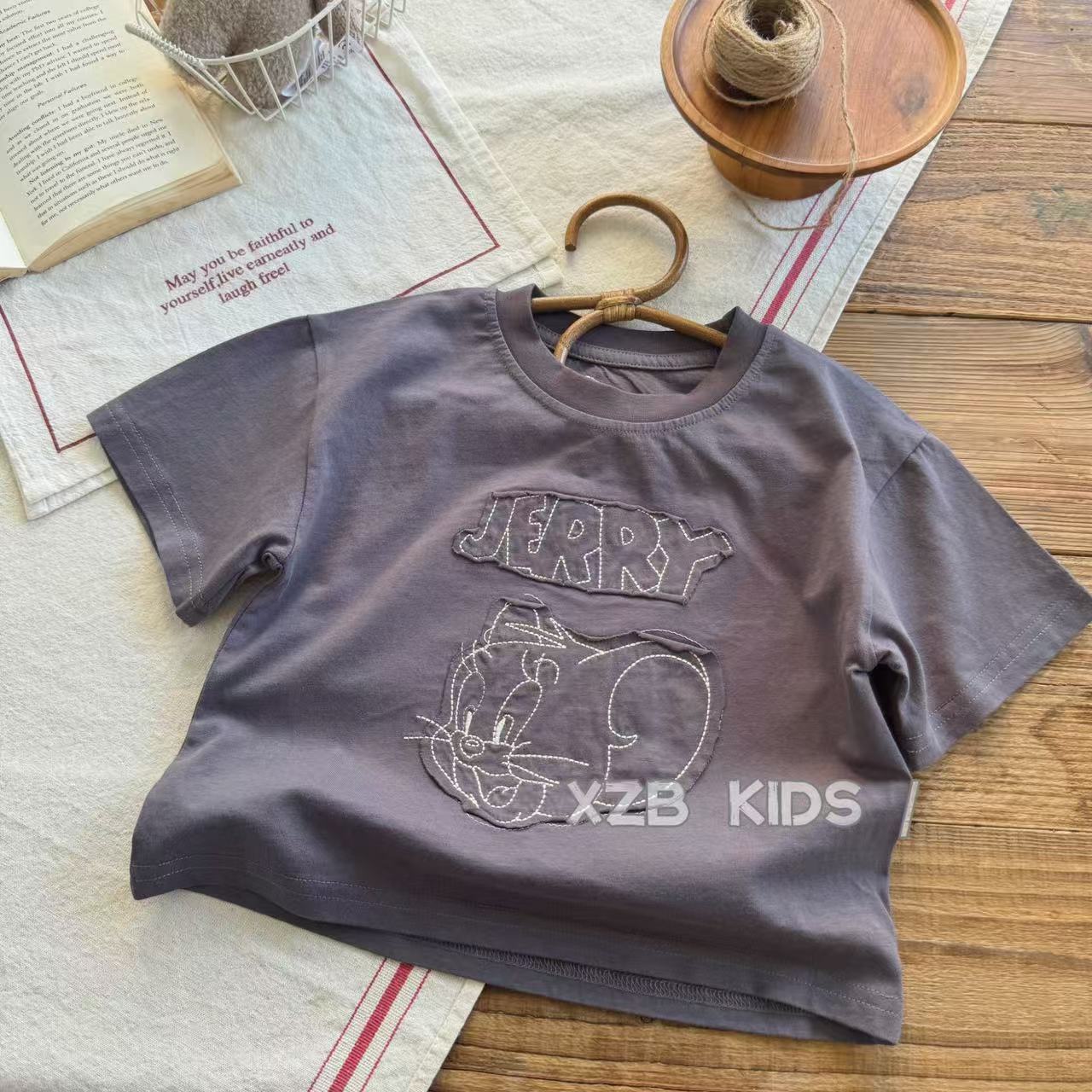 순수 코튼 여름 새로운 스타일 만화 스타일 남성과 여성의 중소형 아동복 아기 고양이와 쥐 입체 스티커 반팔 티셔츠