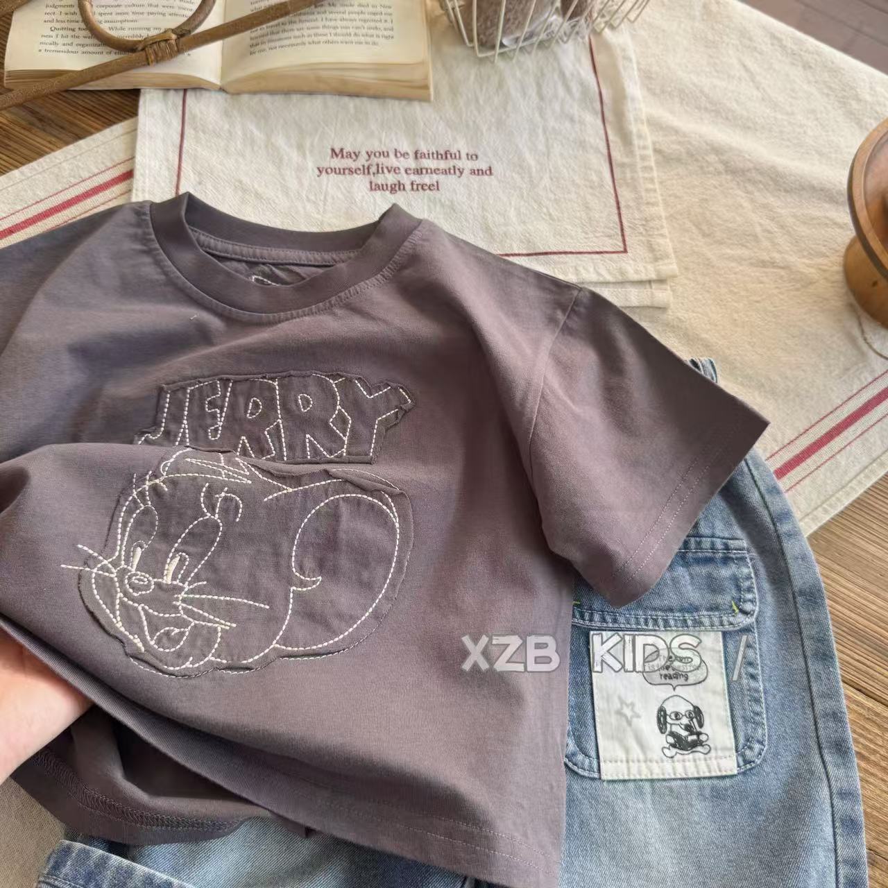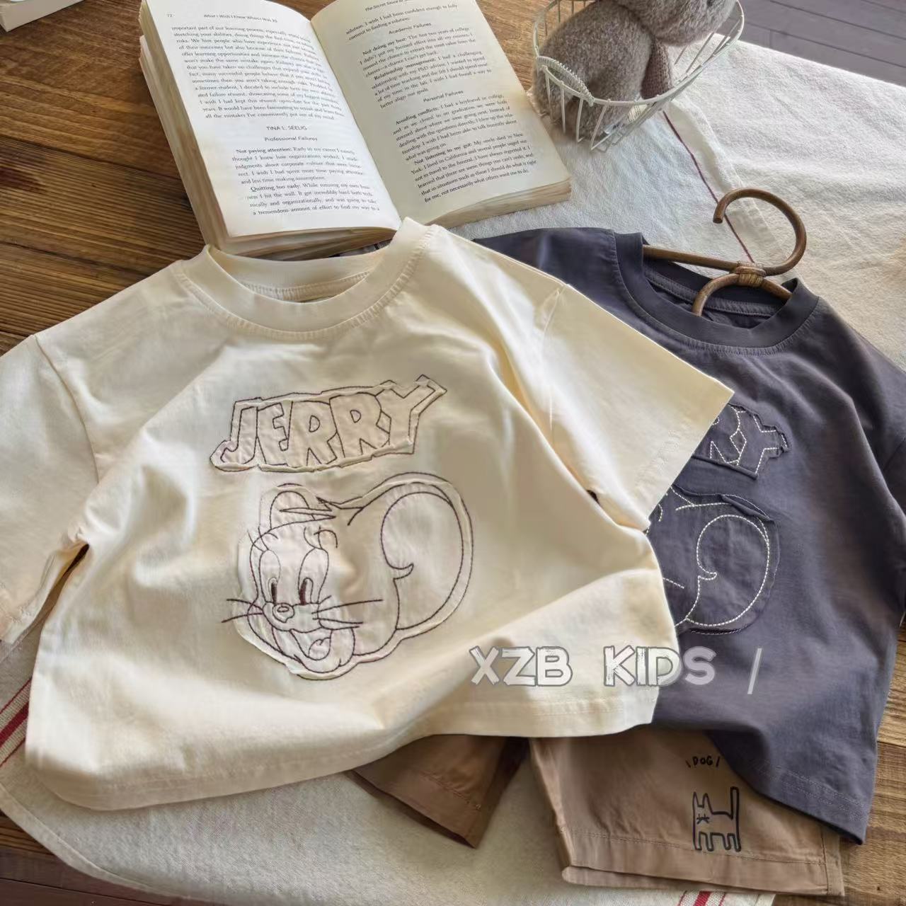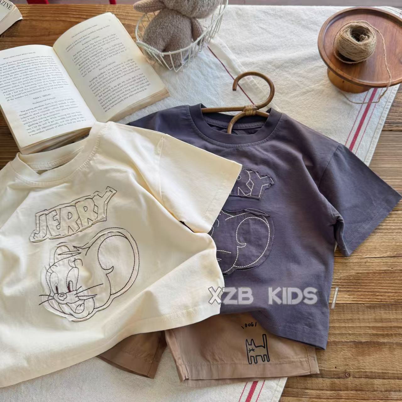 순수 코튼 여름 새로운 스타일 만화 스타일 남성과 여성의 중소형 아동복 아기 고양이와 쥐 입체 스티커 반팔 티셔츠스토어 가기