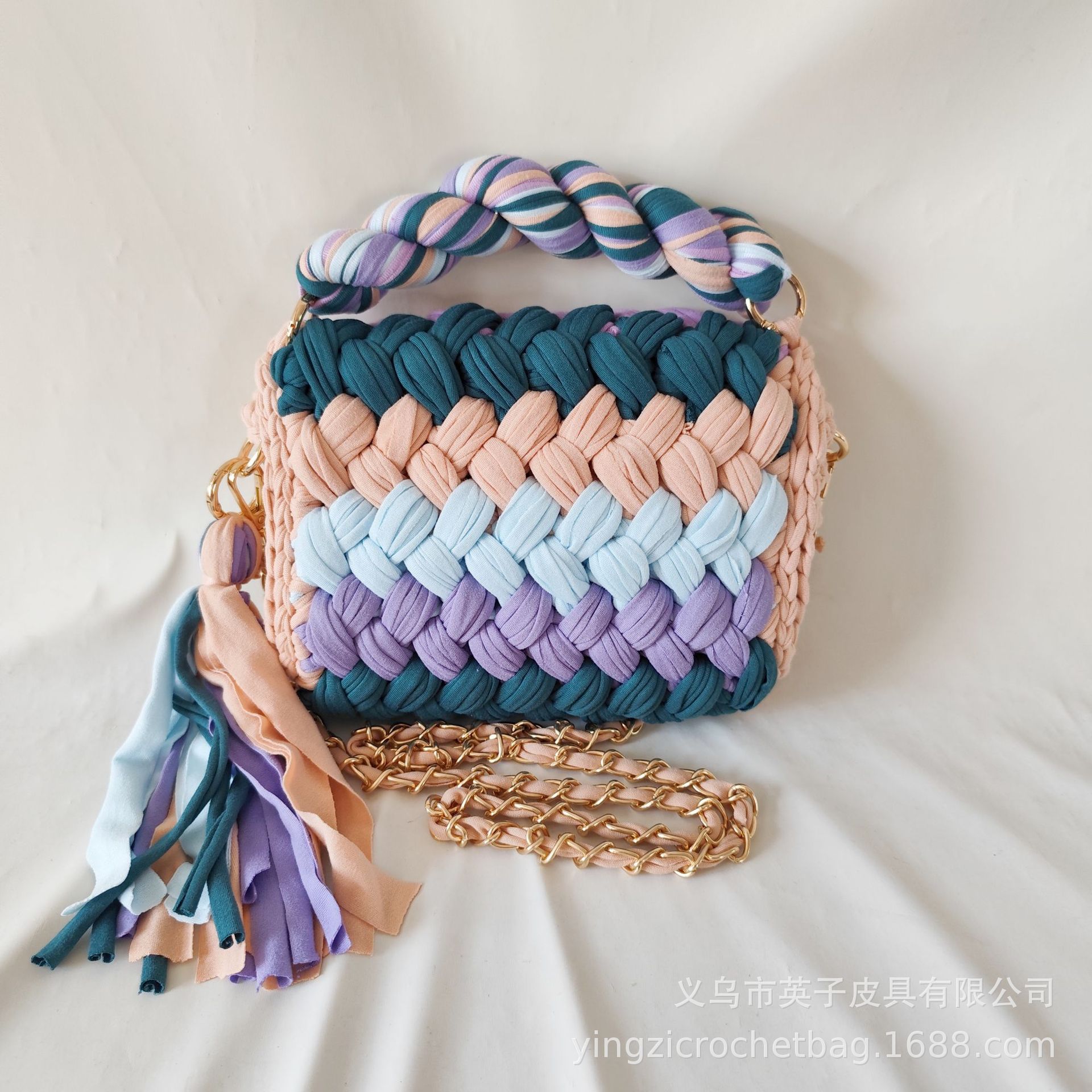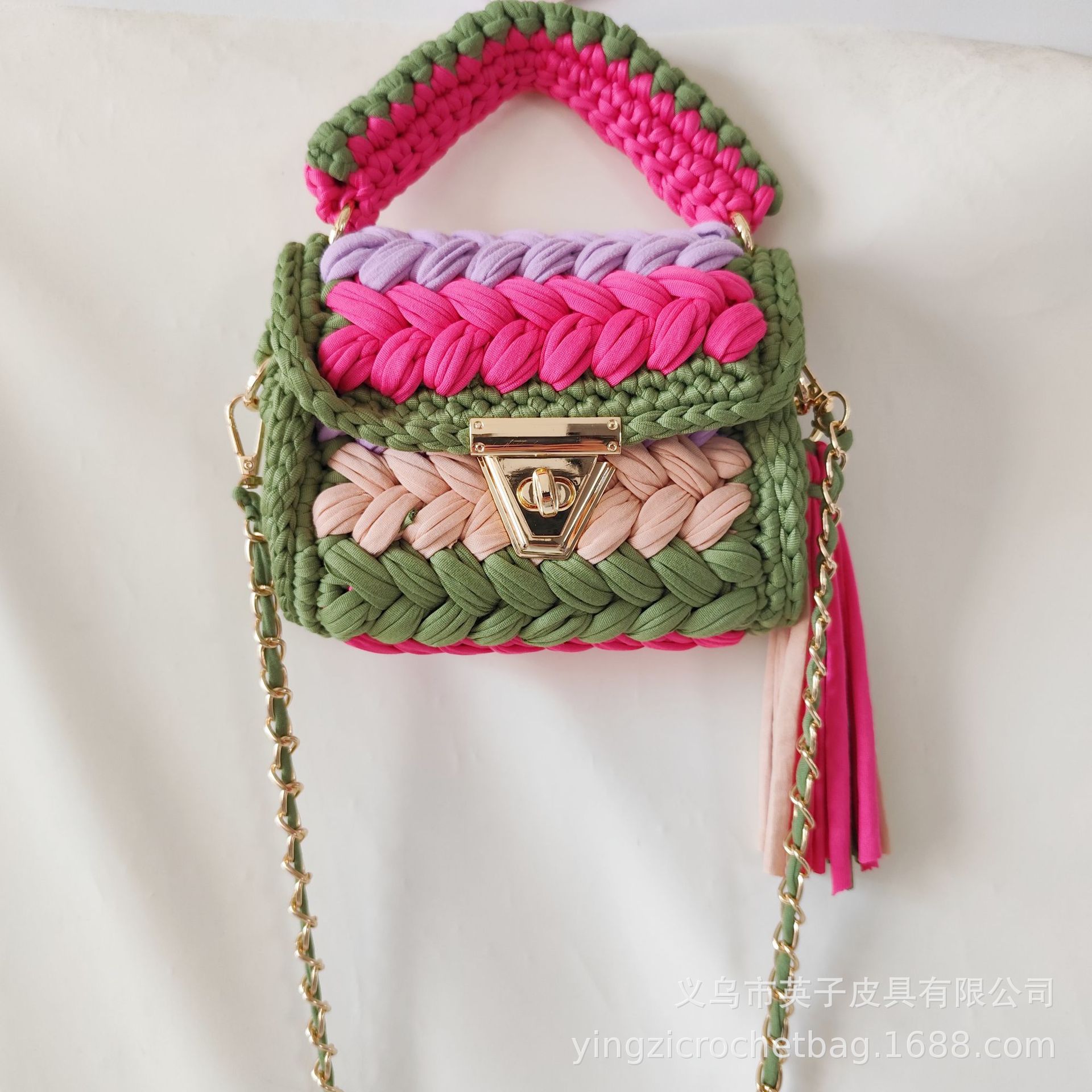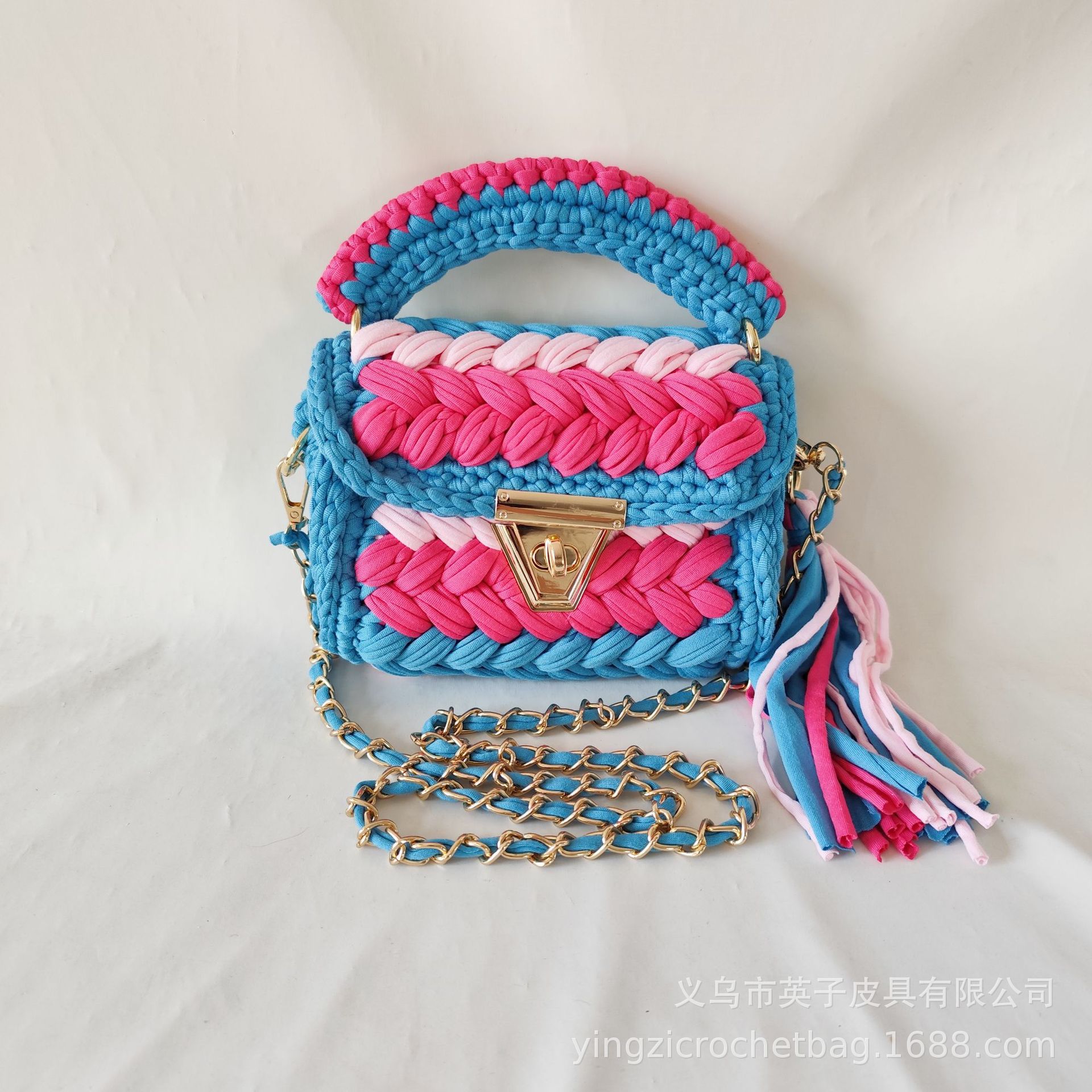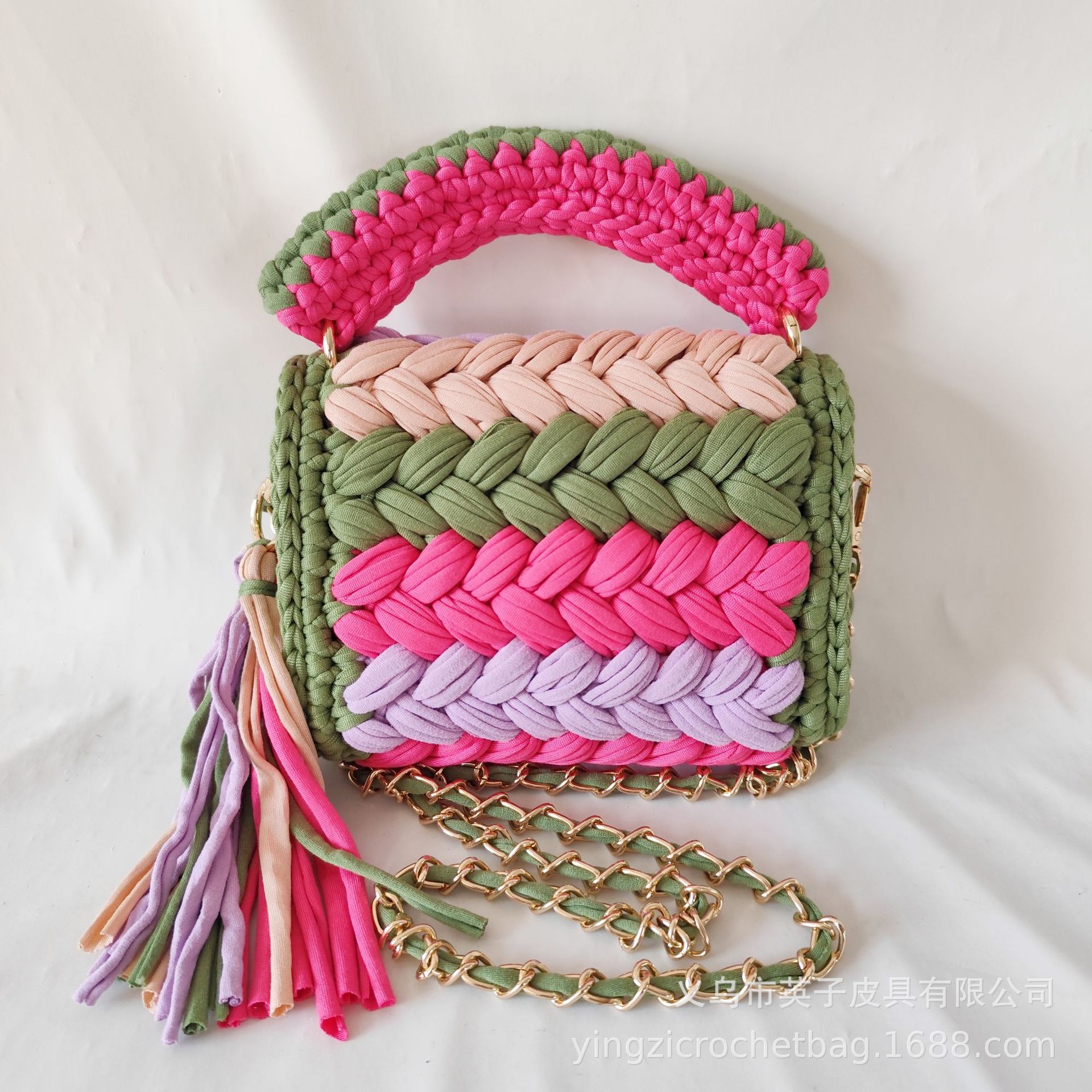 2025 새로운 손으로 짠 대비 색상 스티칭 컬러 체인 술 핸드백 메신저 가방