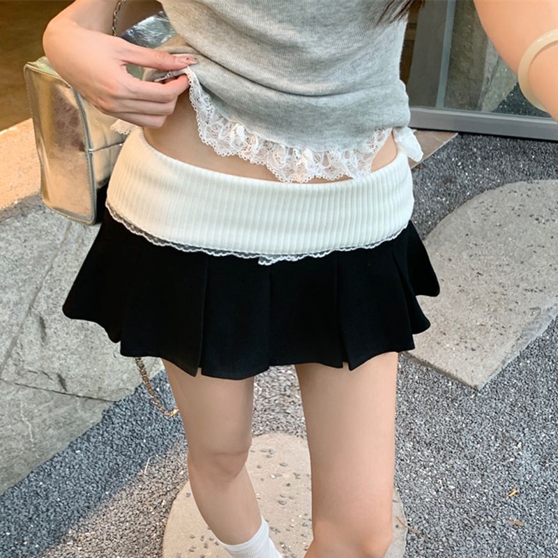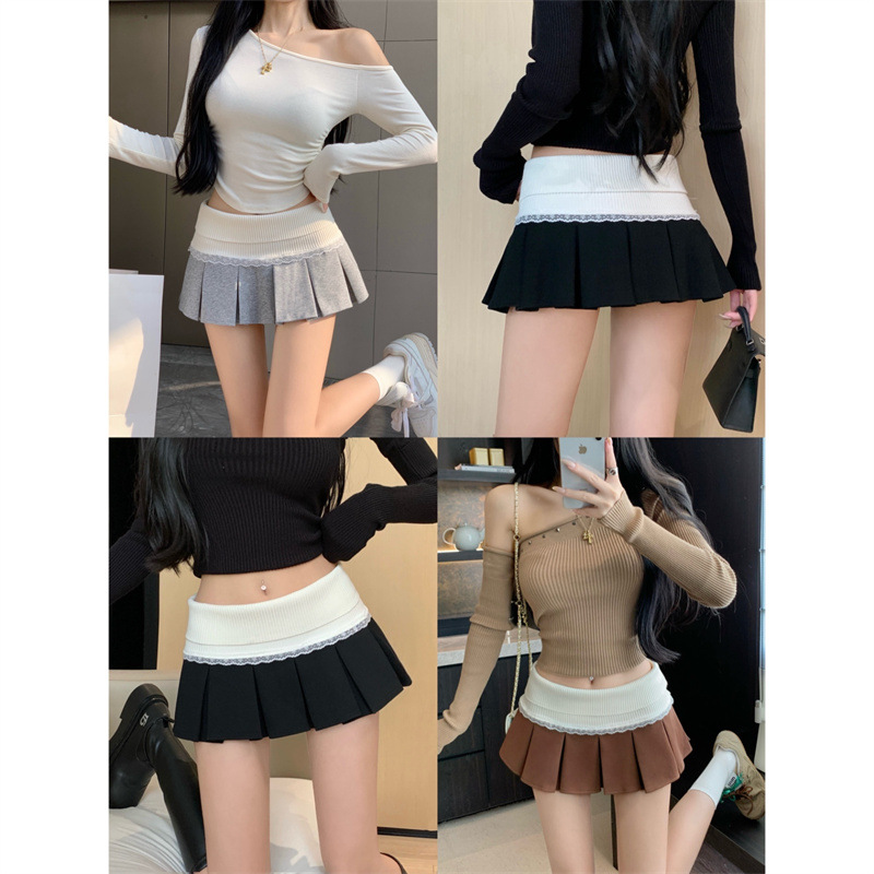 Sweet Hot Girl JK 스타일 하이 웨이스트 니트 레이스 스플 라이스 플리츠 스커트 2025 여름 대학 스타일 스커트 슬리밍 짧은 스커트스토어 가기