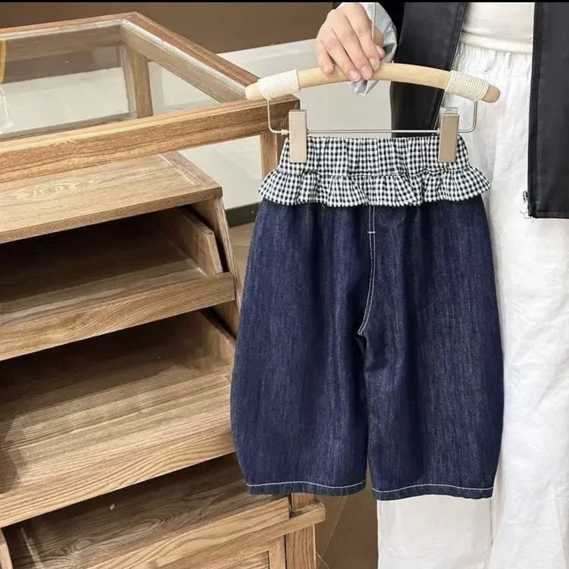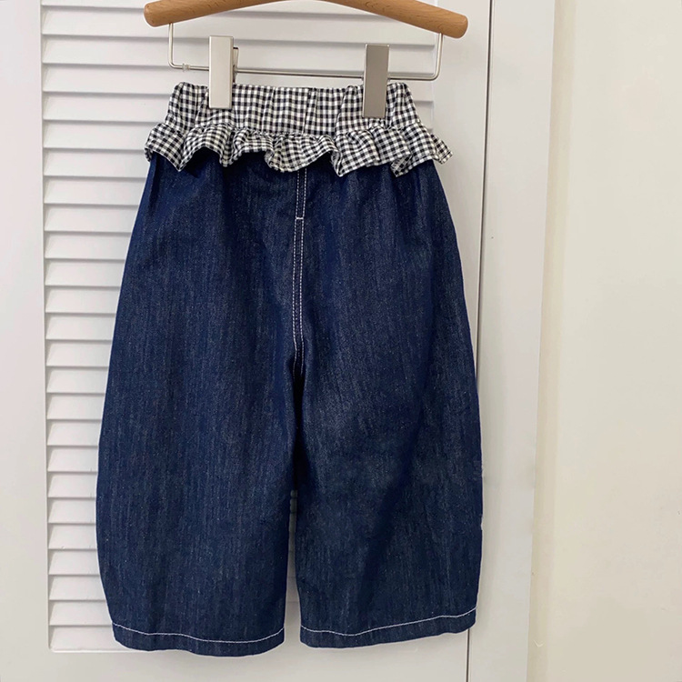 아동용 와이드 팬츠 여름 신작 허리 스플리싱 체크 무늬 한국식 소녀의 부드럽고 얇은 청바지 유행