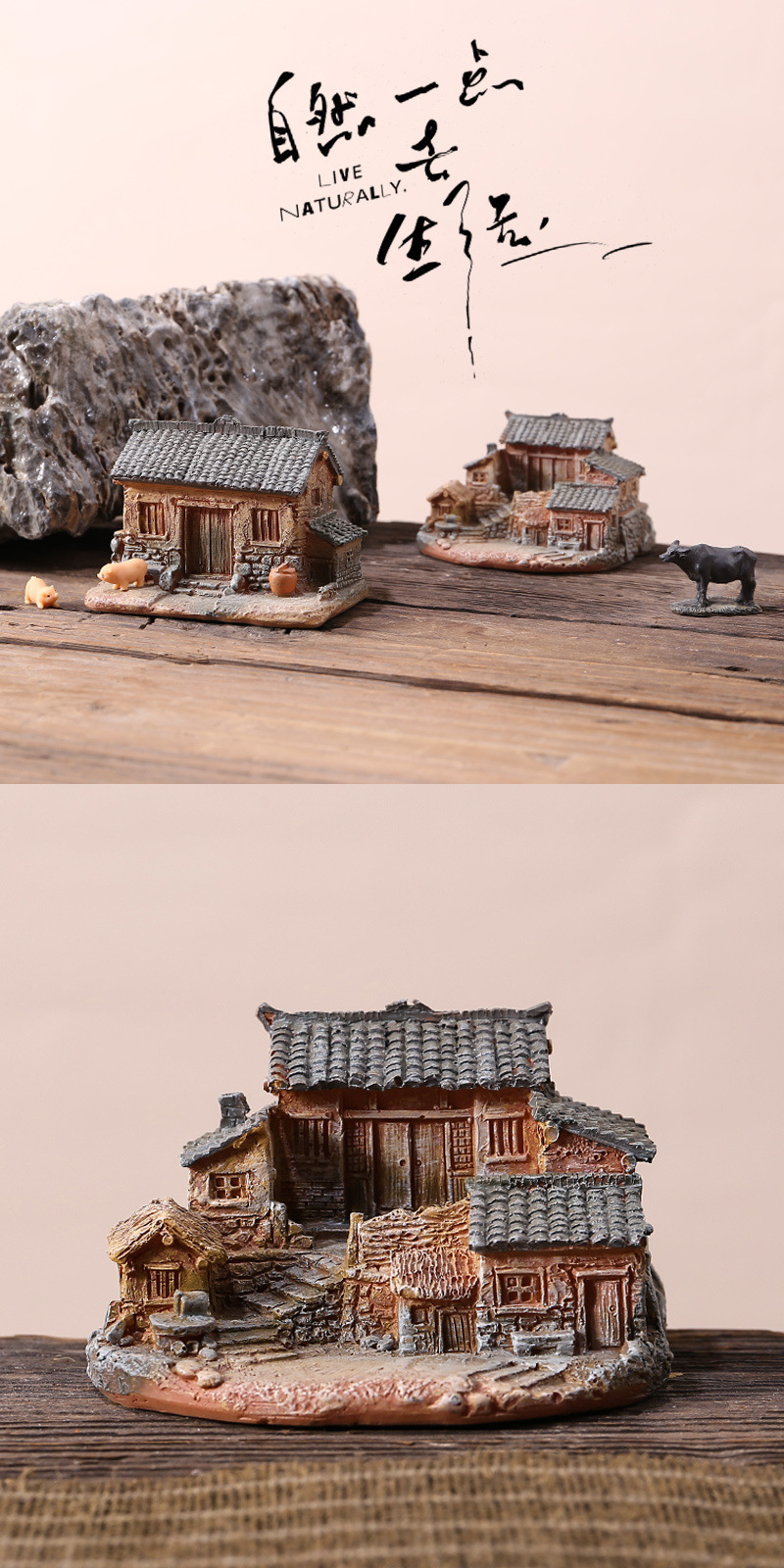 목가적이고 시골의 오래된 집 장식품, 작은 모델, 데스크탑 창의적인 마이크로 조경, 안뜰 화분, 분재 장식