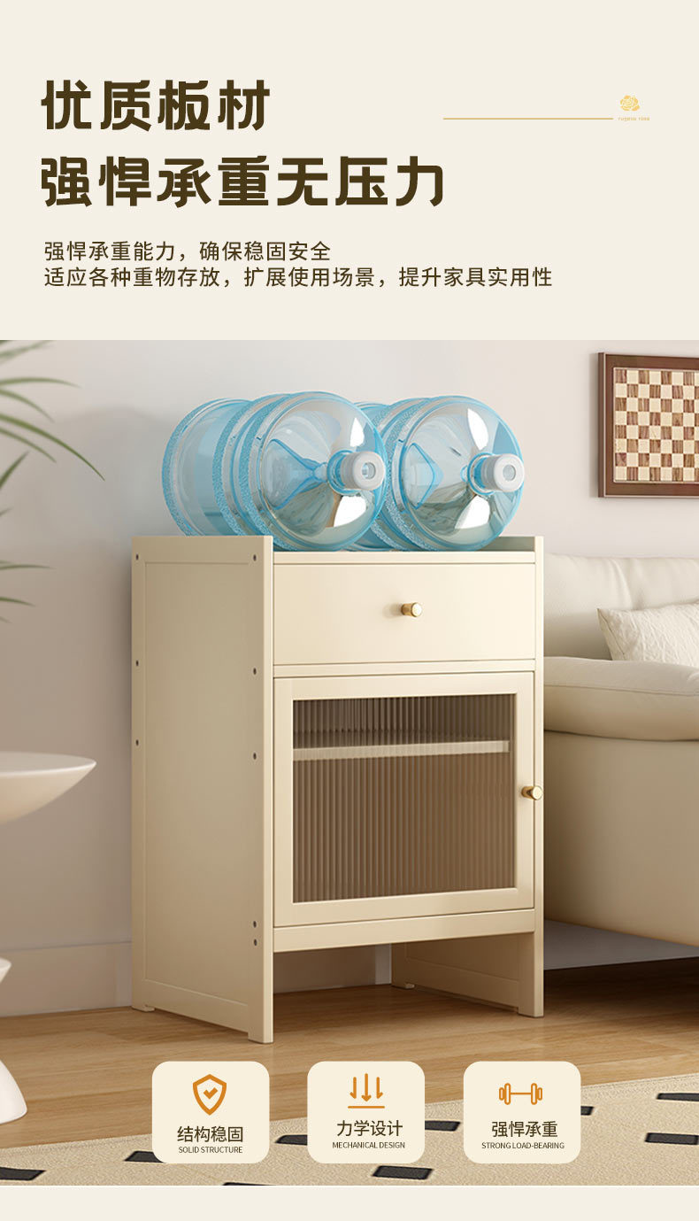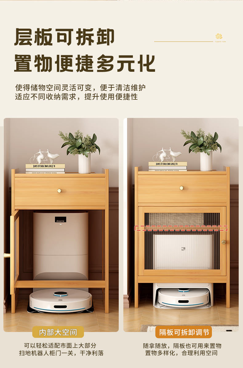 로봇청소기 수납선반, 거실 공간 활용 유물, 다기능 TV 캐비닛 옆 정수기, 화분 꽃꽂이