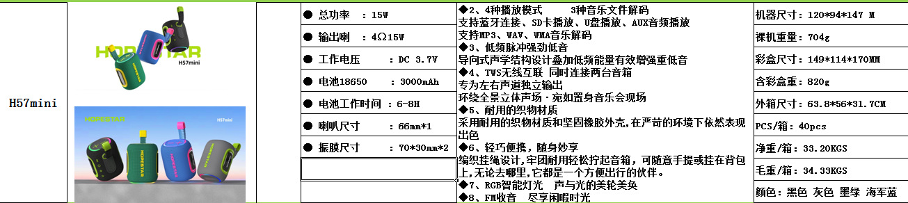 HOPESTAR H57mini 휴대용 무선 블루투스 스피커 컬러 라이트 카드 H57 스포츠 오디오