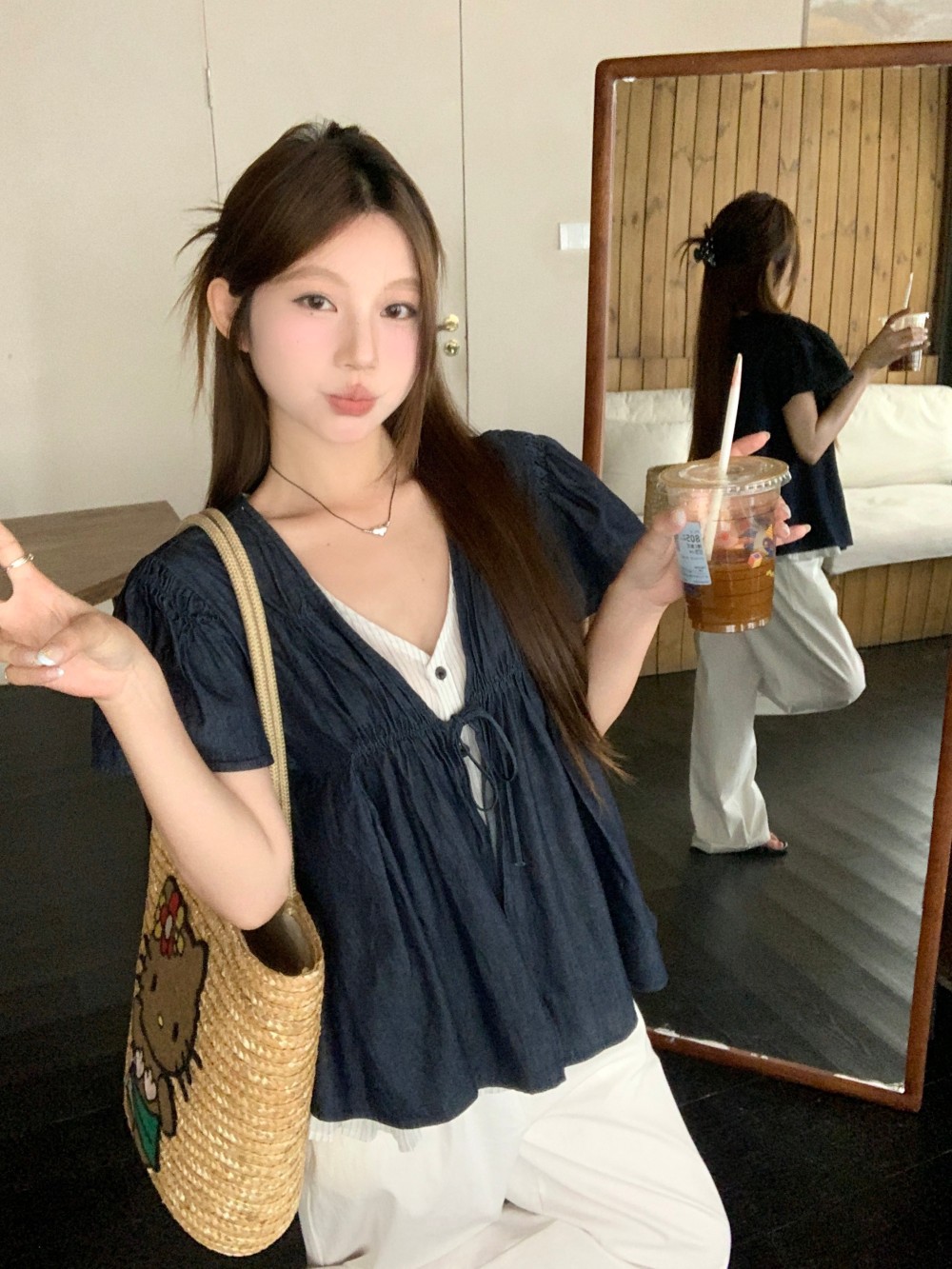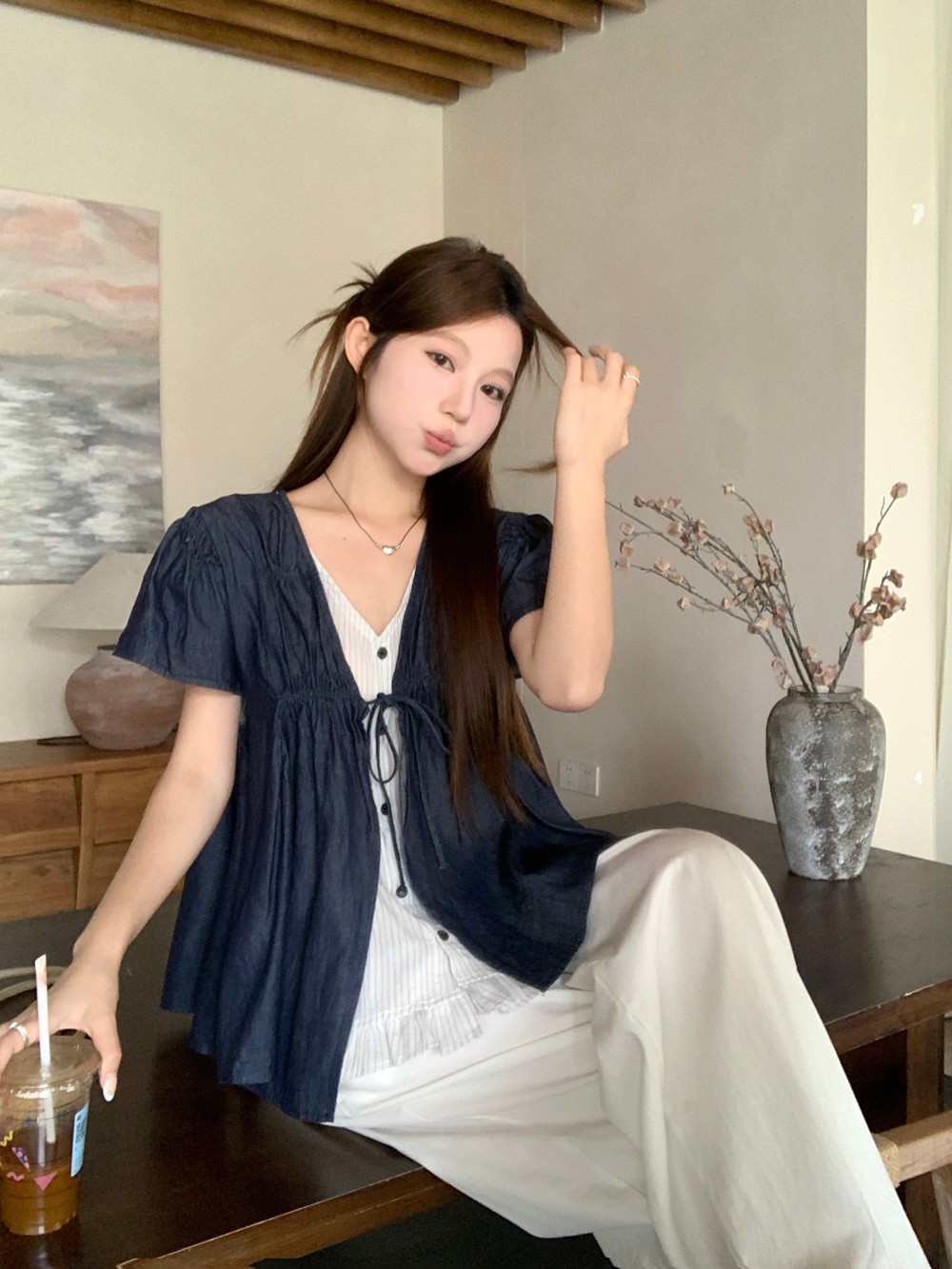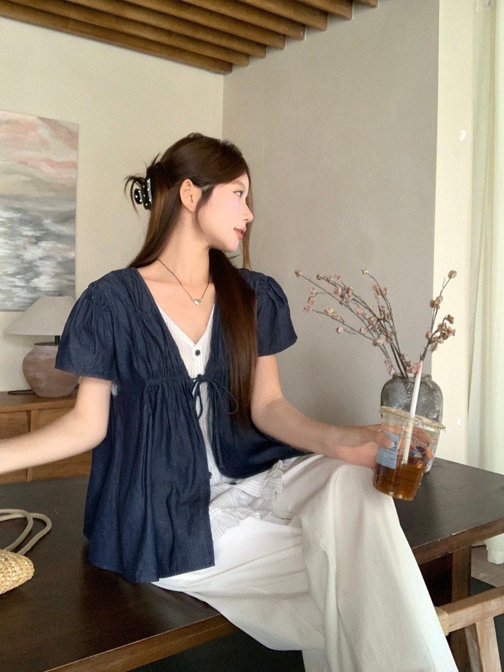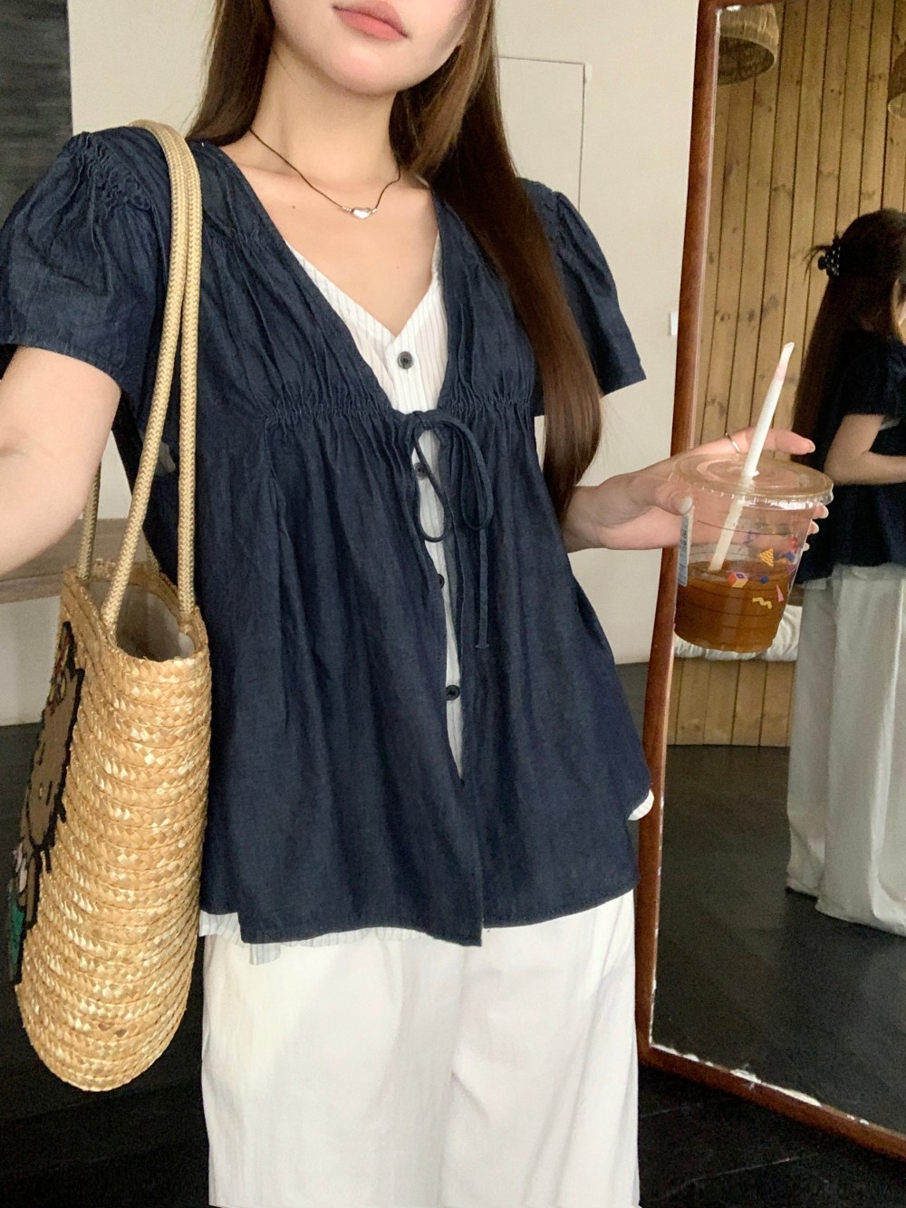 진짜 샷 여름 새로운 디자인 감각 중공업 레이스 스트라이프 데님 스티칭 스트라이프 가짜 투피스 셔츠 여성 82352