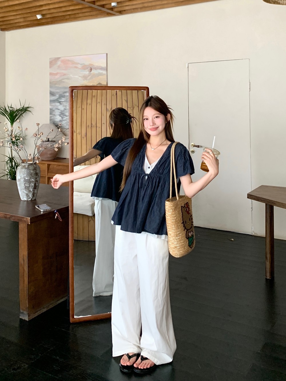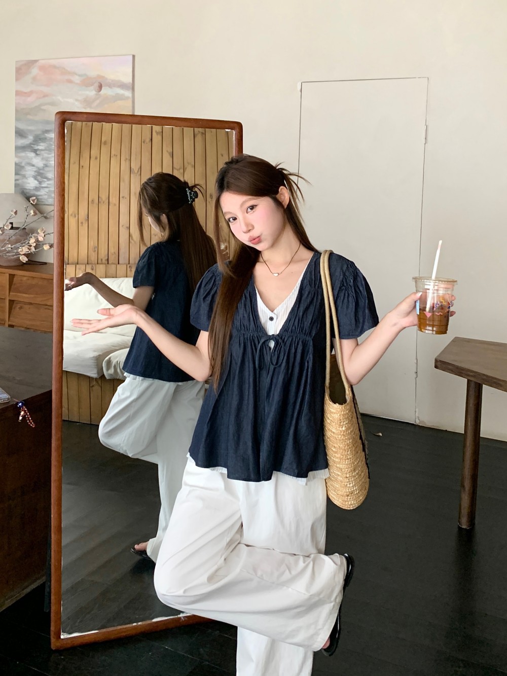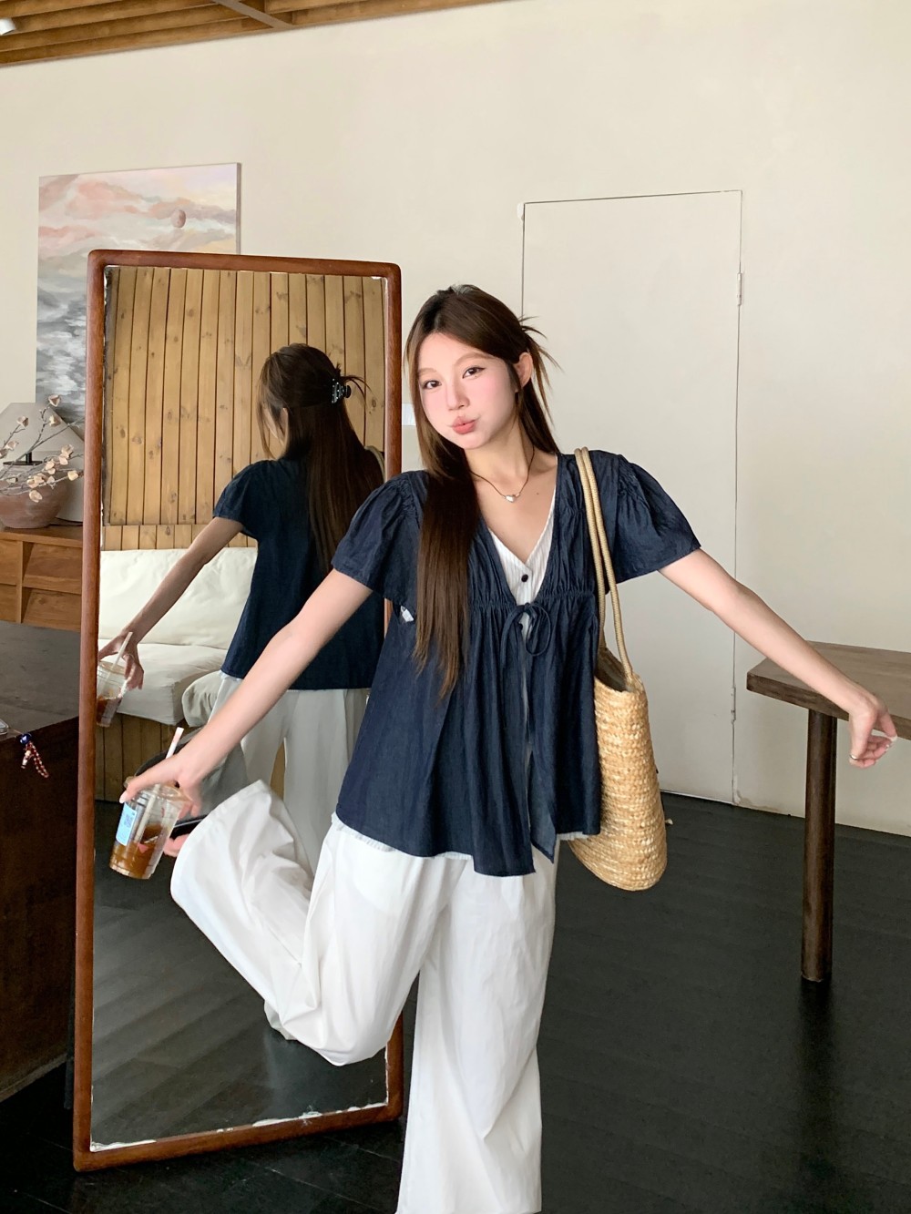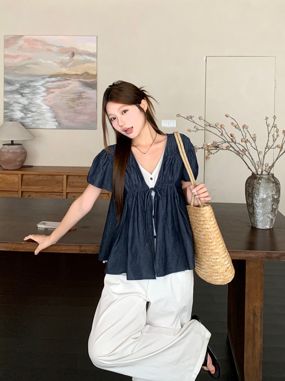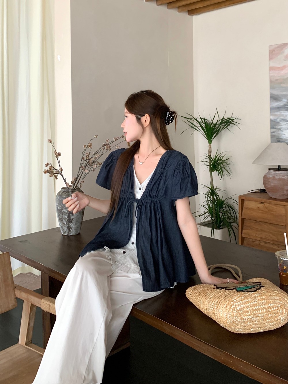 진짜 샷 여름 새로운 디자인 감각 중공업 레이스 스트라이프 데님 스티칭 스트라이프 가짜 투피스 셔츠 여성 82352