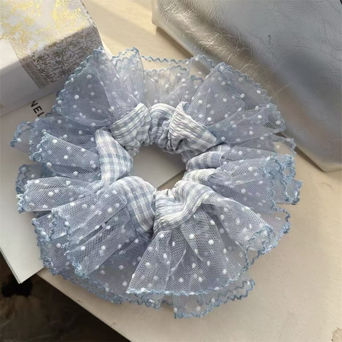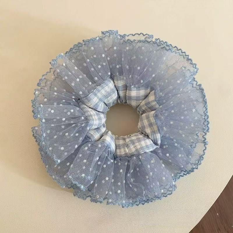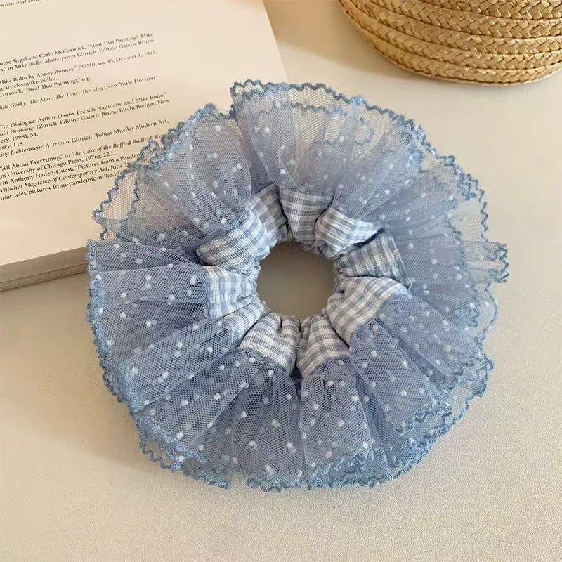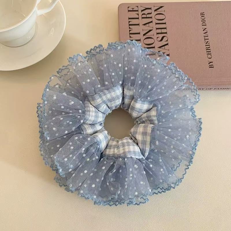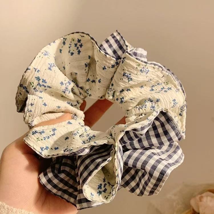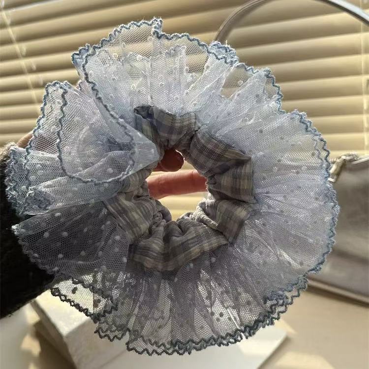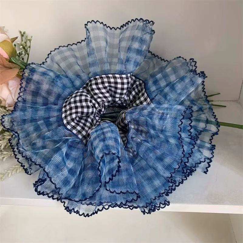 슈퍼 요정 한국 스타일 블루 격자 무늬 원사 가장자리 공주 큰 장내 헤어 링 여성의 아름다운 우아한 하이 엔드 센스 새로운 패션 격자 무늬 헤어 로프스토어 가기