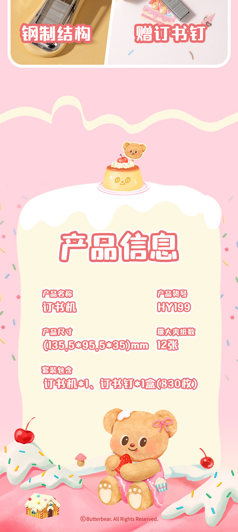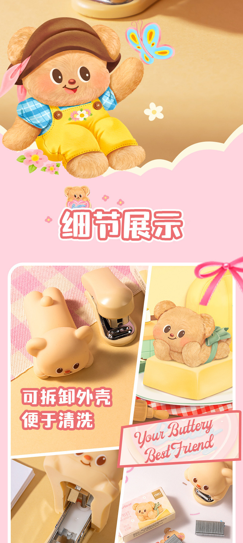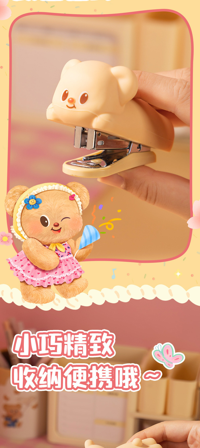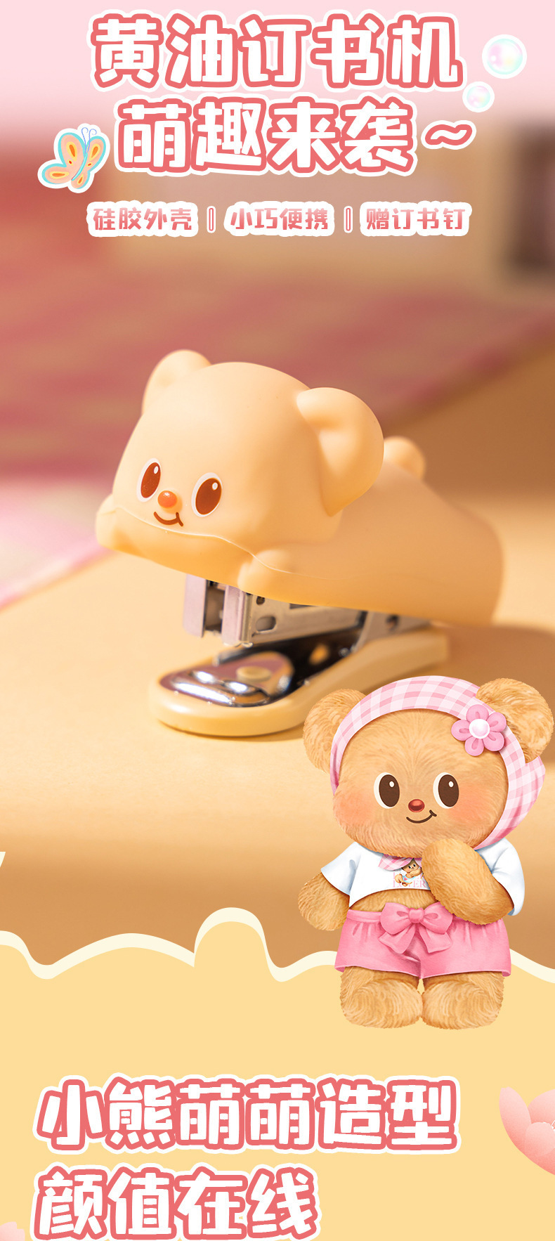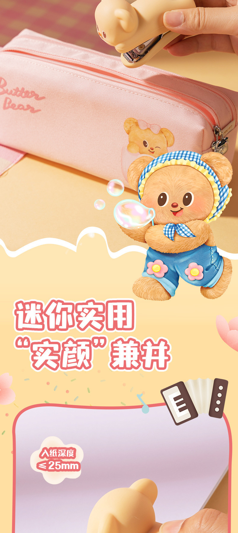 델리 HY199 버터 베어 미니 스테이플러 세트 학생 휴대용 만화 사무실 문서 바인딩 기계