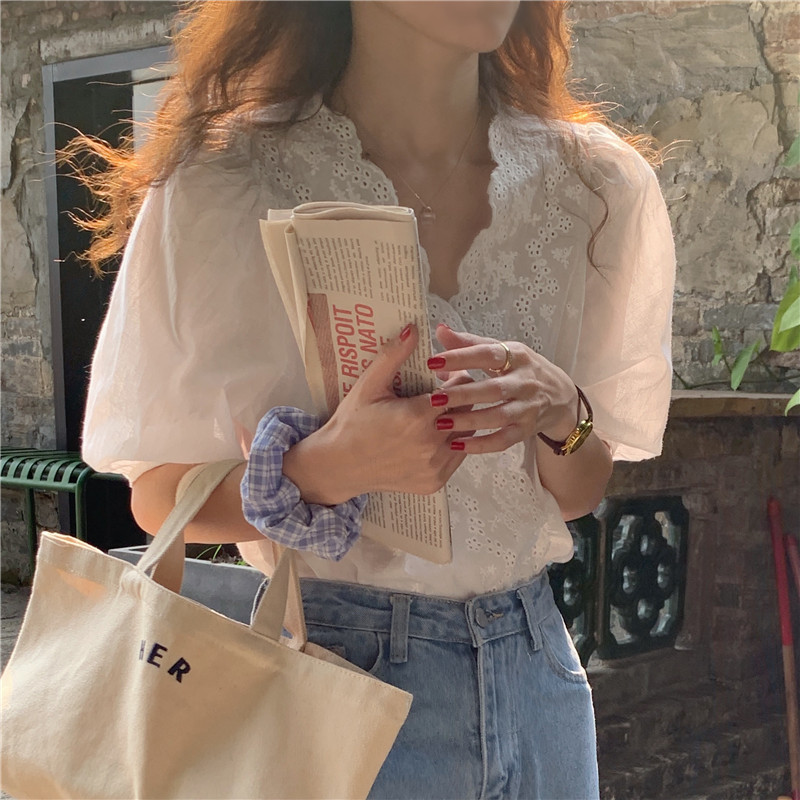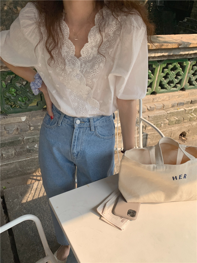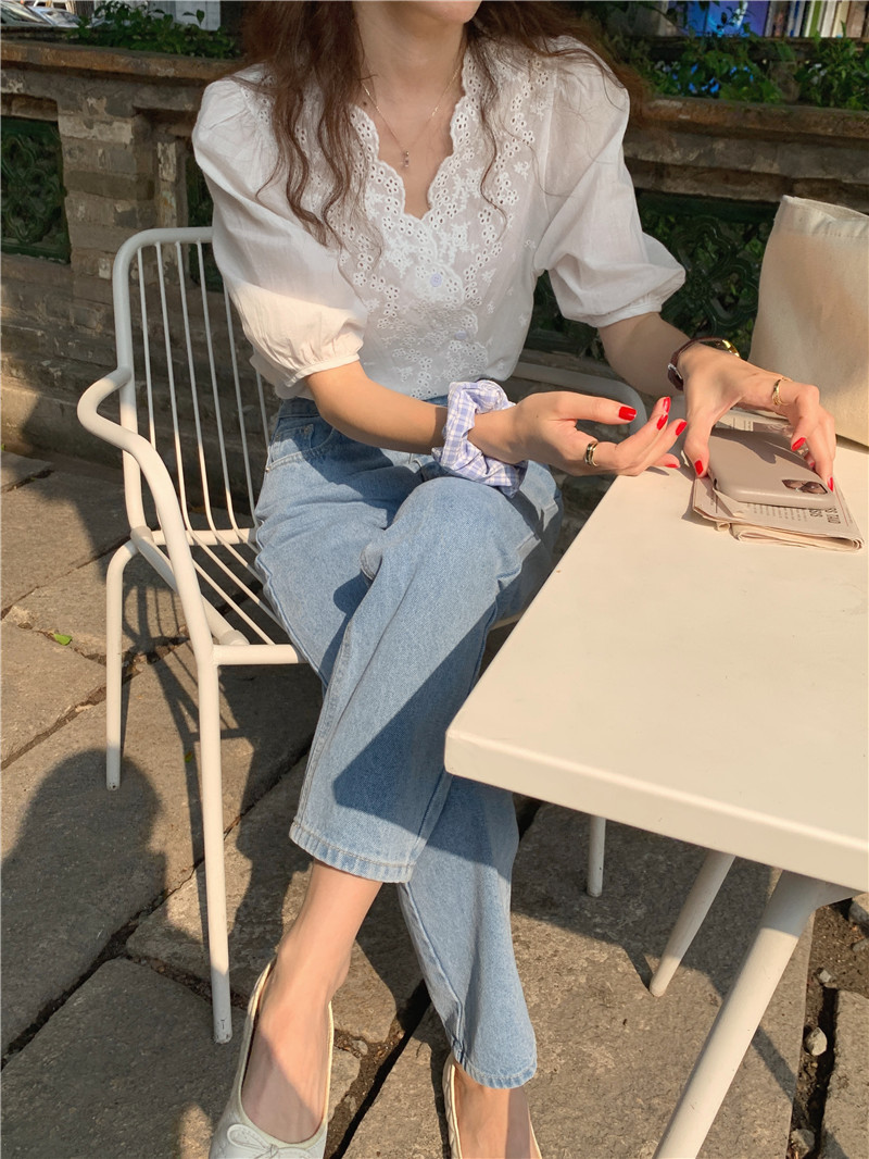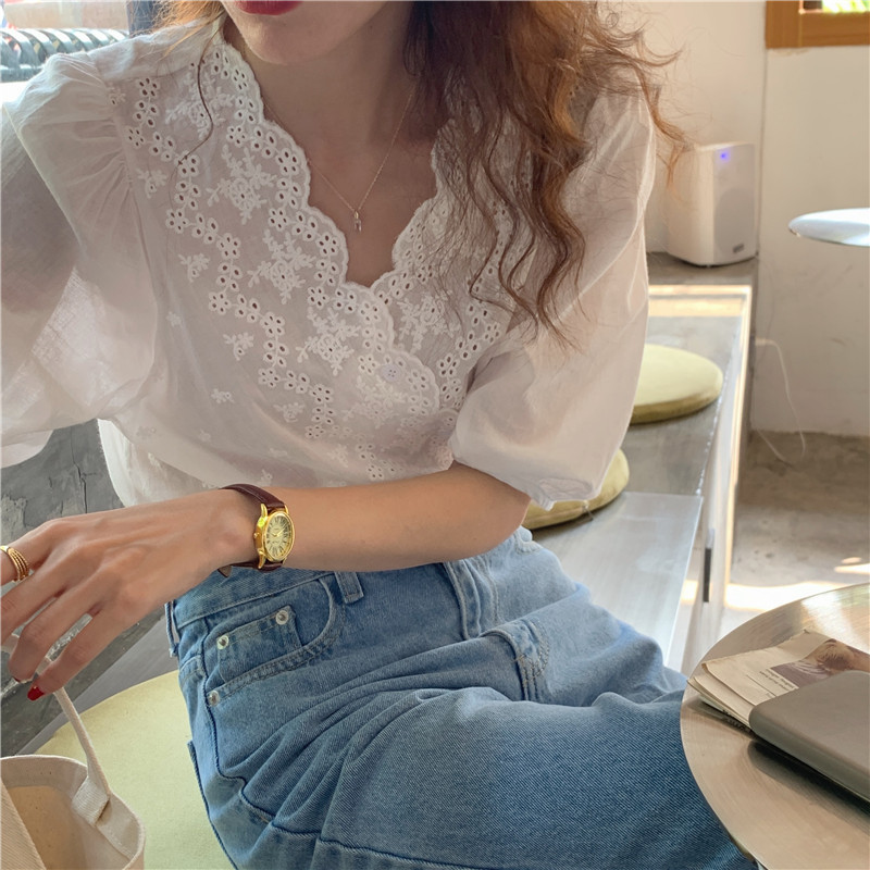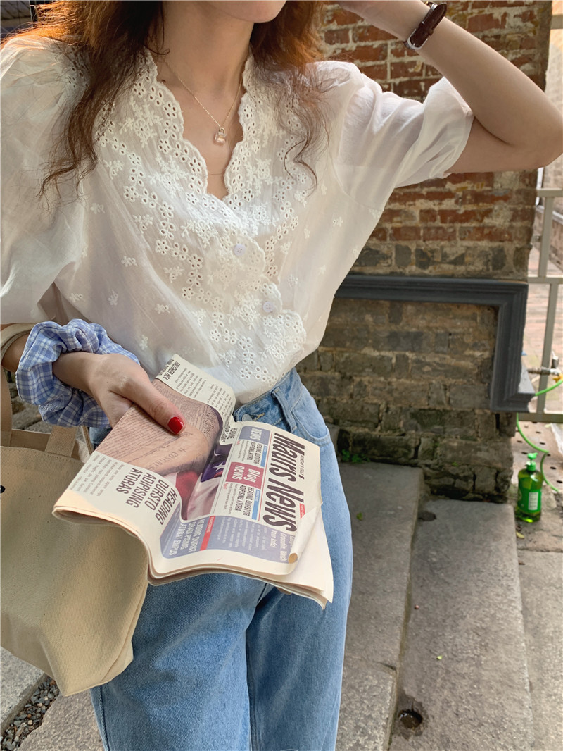 한국 세련된 여름 나이 감소 신선한 스타일 V 넥 자수 레이스 비스듬한 버튼 느슨한 여성을위한 모든 경기 퍼프 슬리브 셔츠스토어 가기
