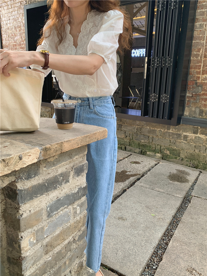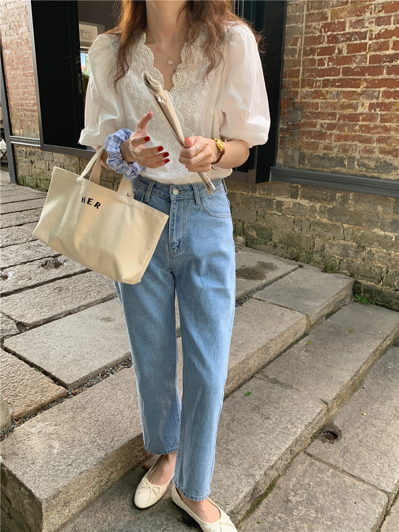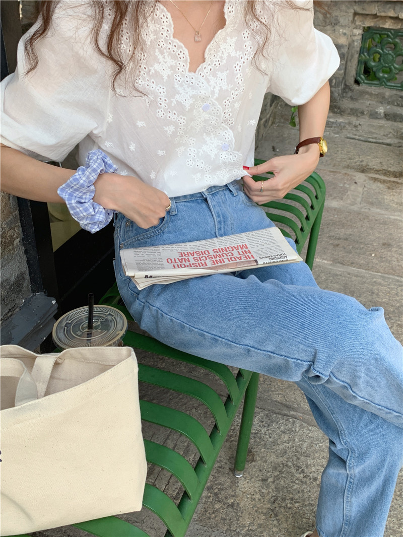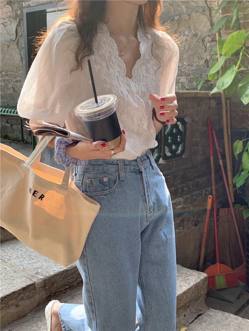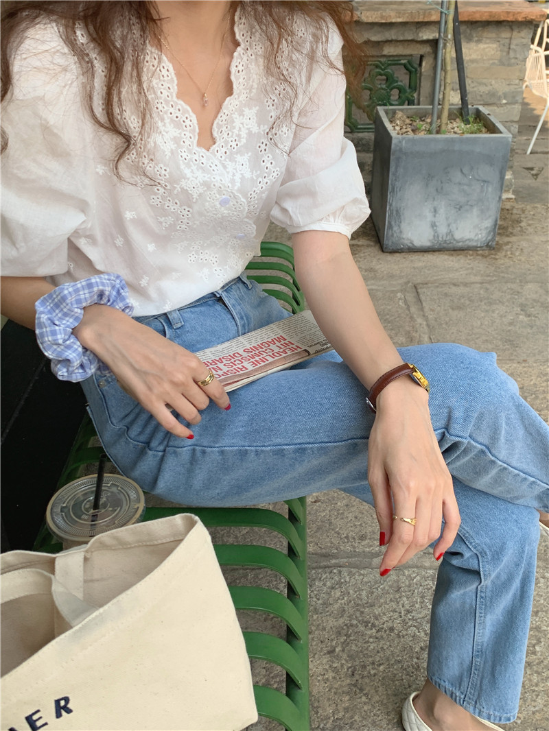 한국 세련된 여름 나이 감소 신선한 스타일 V 넥 자수 레이스 비스듬한 버튼 느슨한 여성을위한 모든 경기 퍼프 슬리브 셔츠스토어 가기