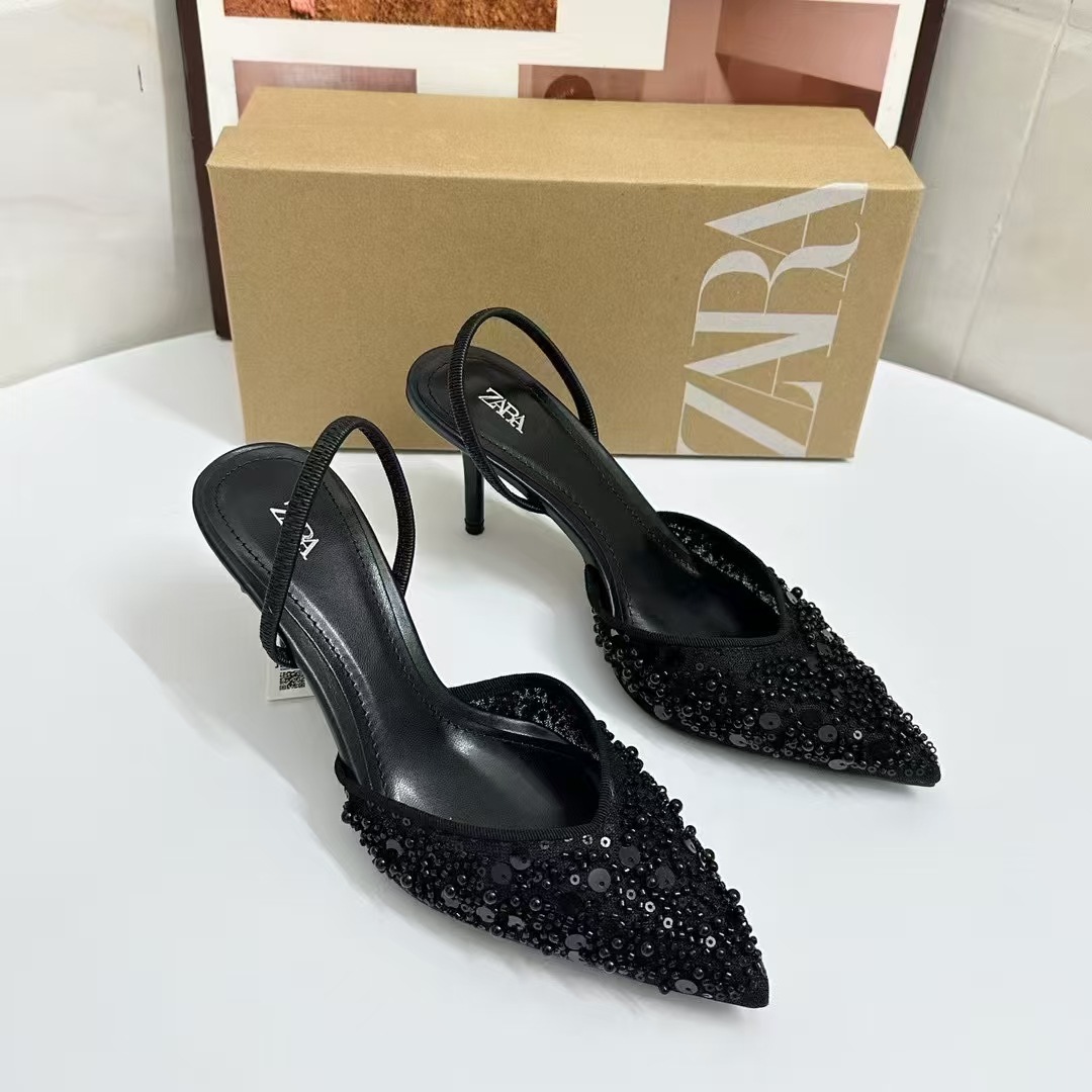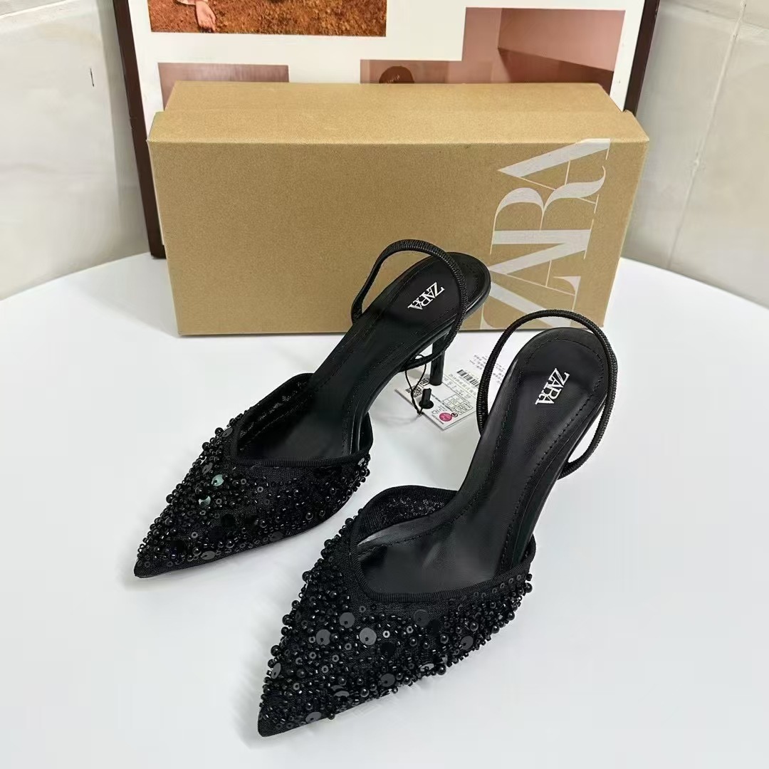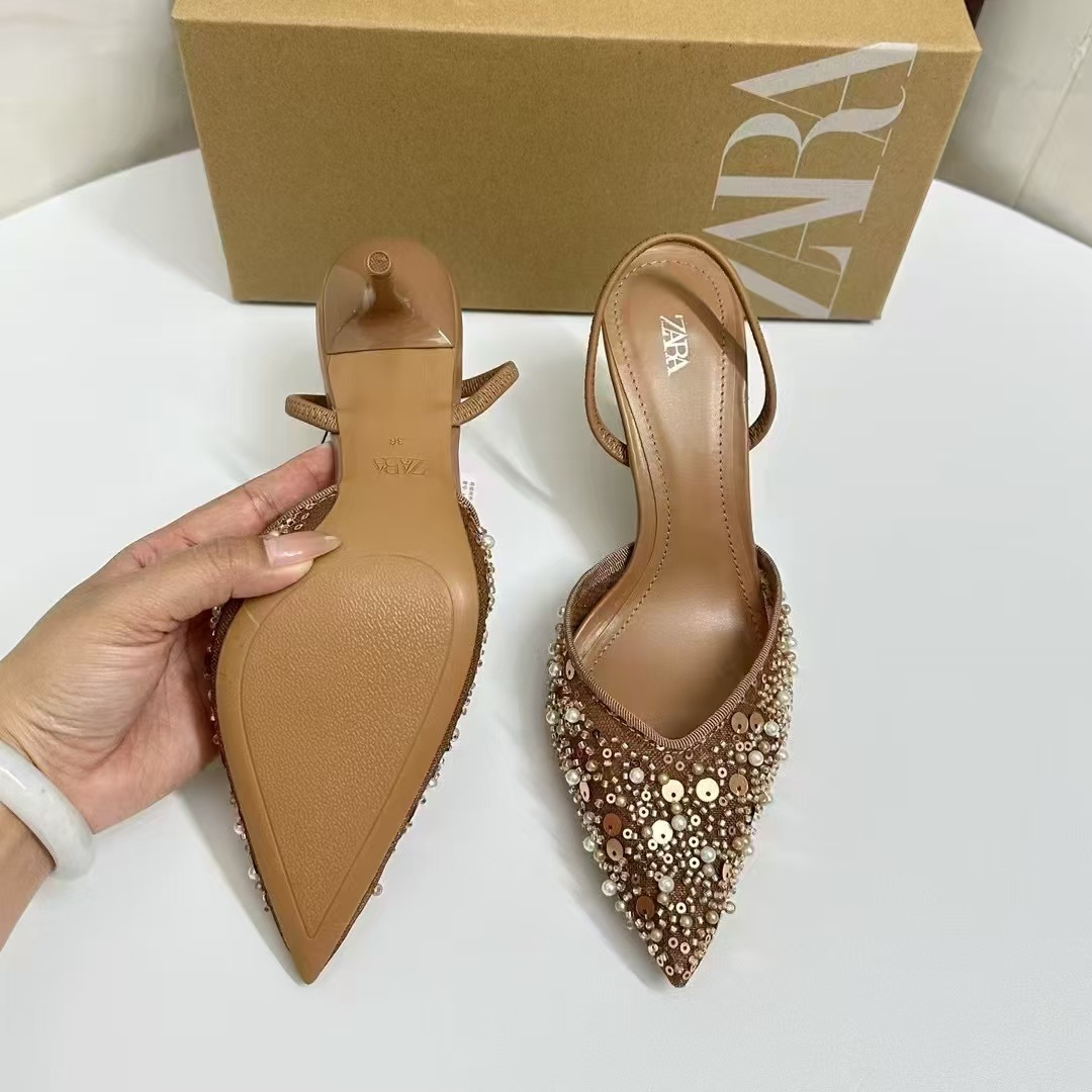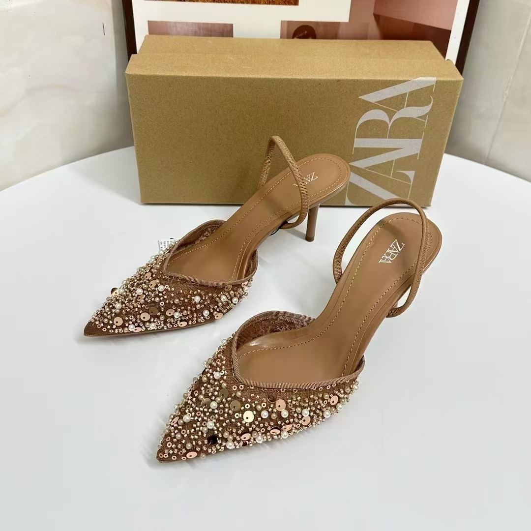 봄 2025 새로운 하이힐 여성 신발 밝은 워터 다이아몬드 장식품 살구색 메쉬 패션 우아한 듀발 뮬러 하이힐스토어 가기