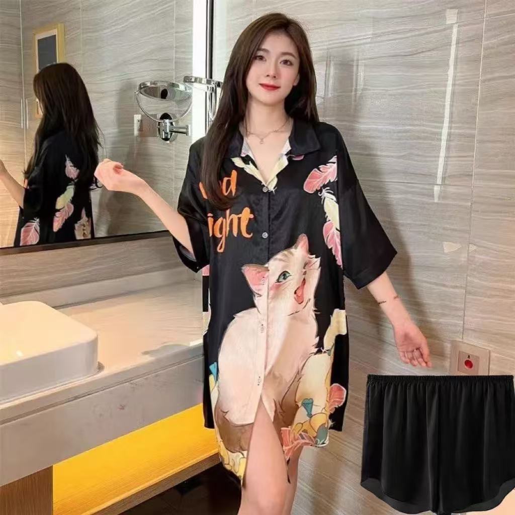 • 뺨 지원 고양이/얼음 실크 잠옷 + 반바지