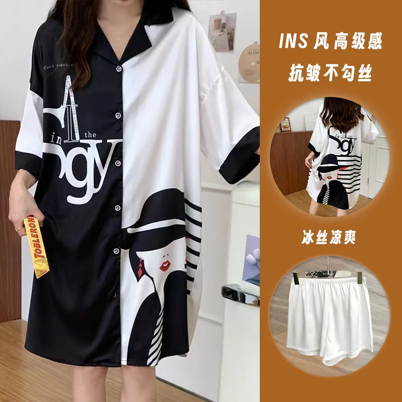 • 흑백 소녀/얼음 실크 잠옷 + 반바지