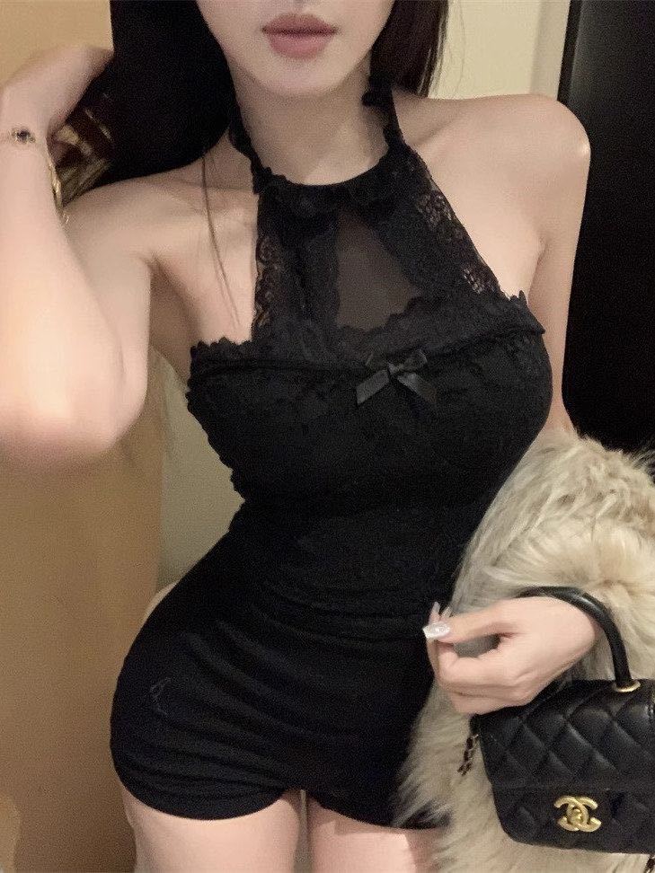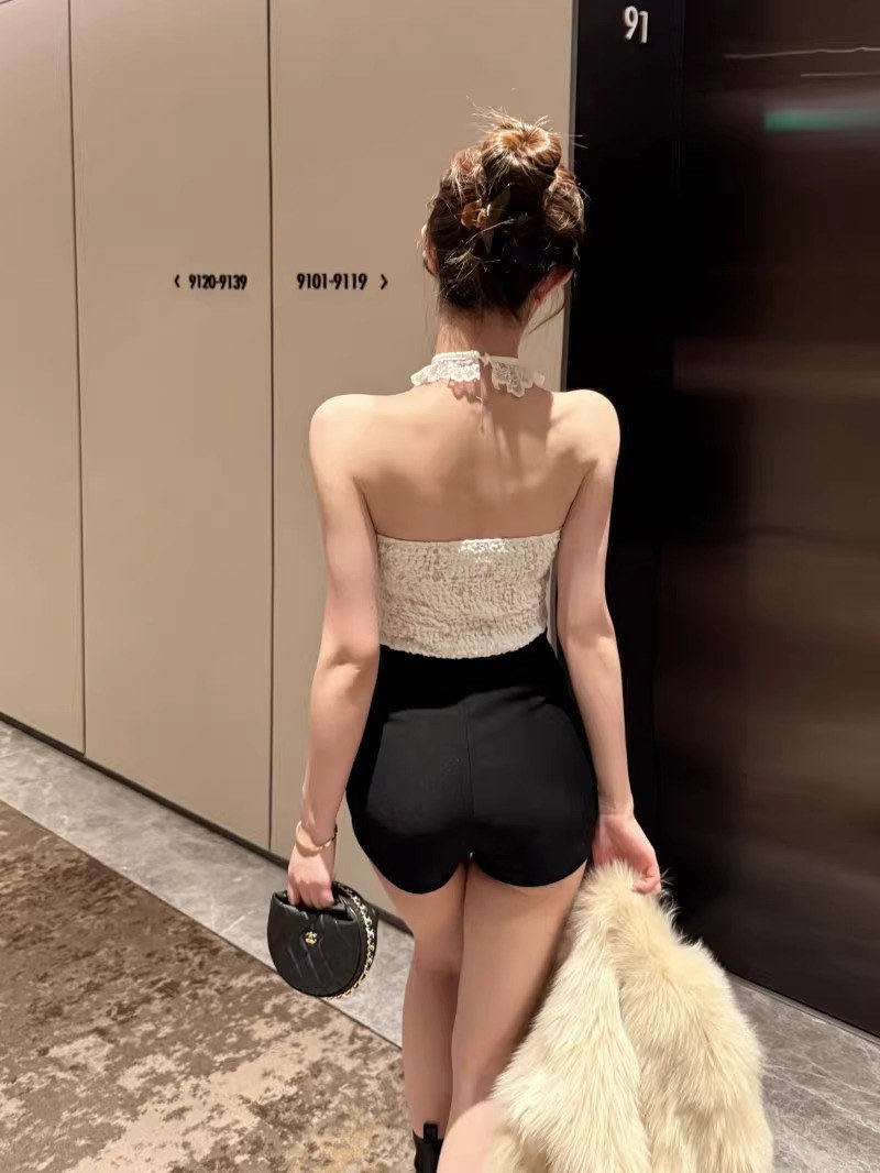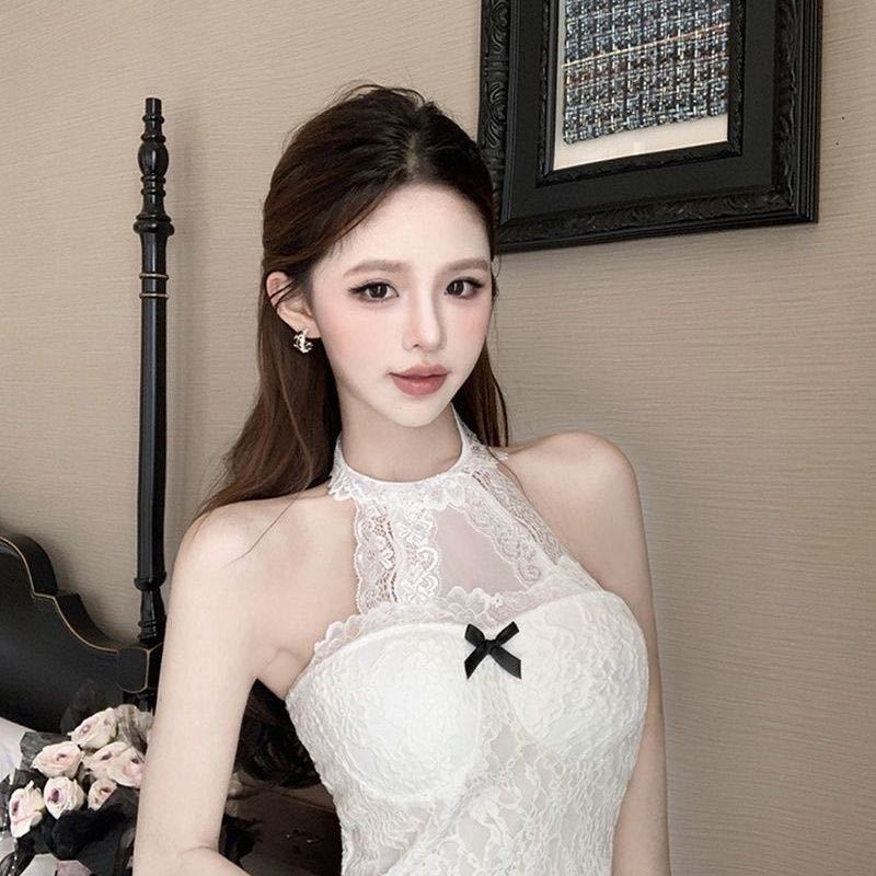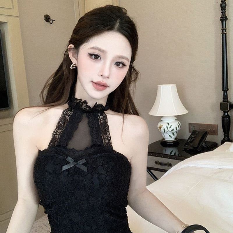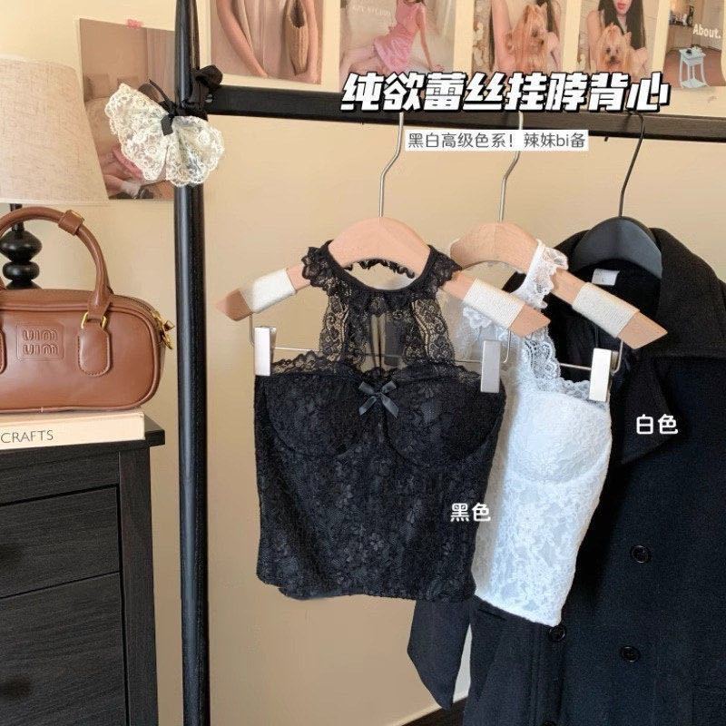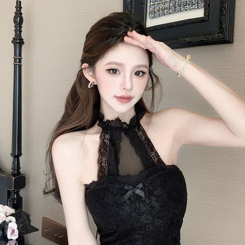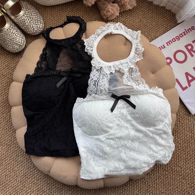 3301 # 가슴 패드가 있는 홀터넥 레이스 섹시 캐미솔 슬림핏 짧은 핫걸 밑단 민소매 탑스토어 가기