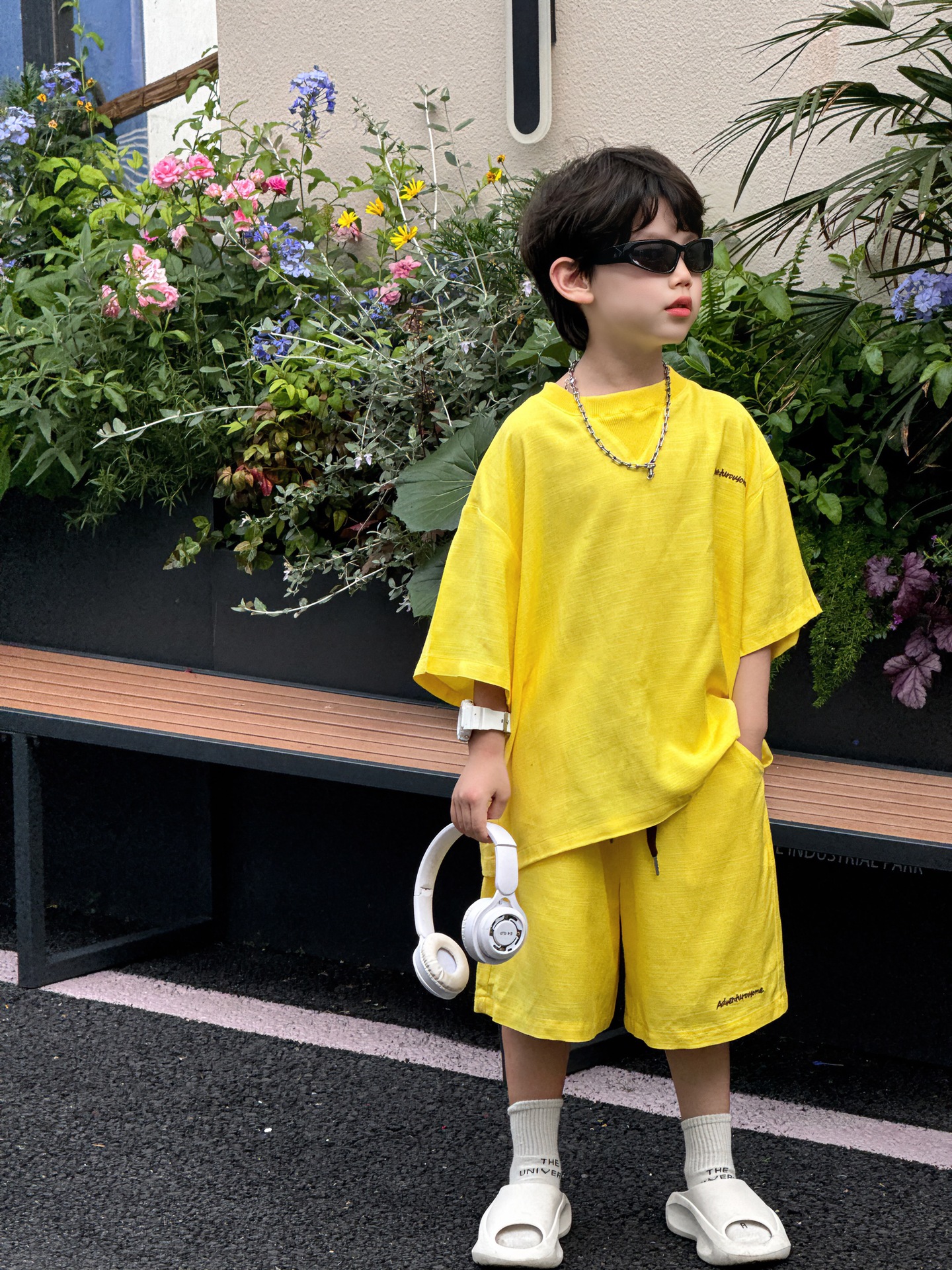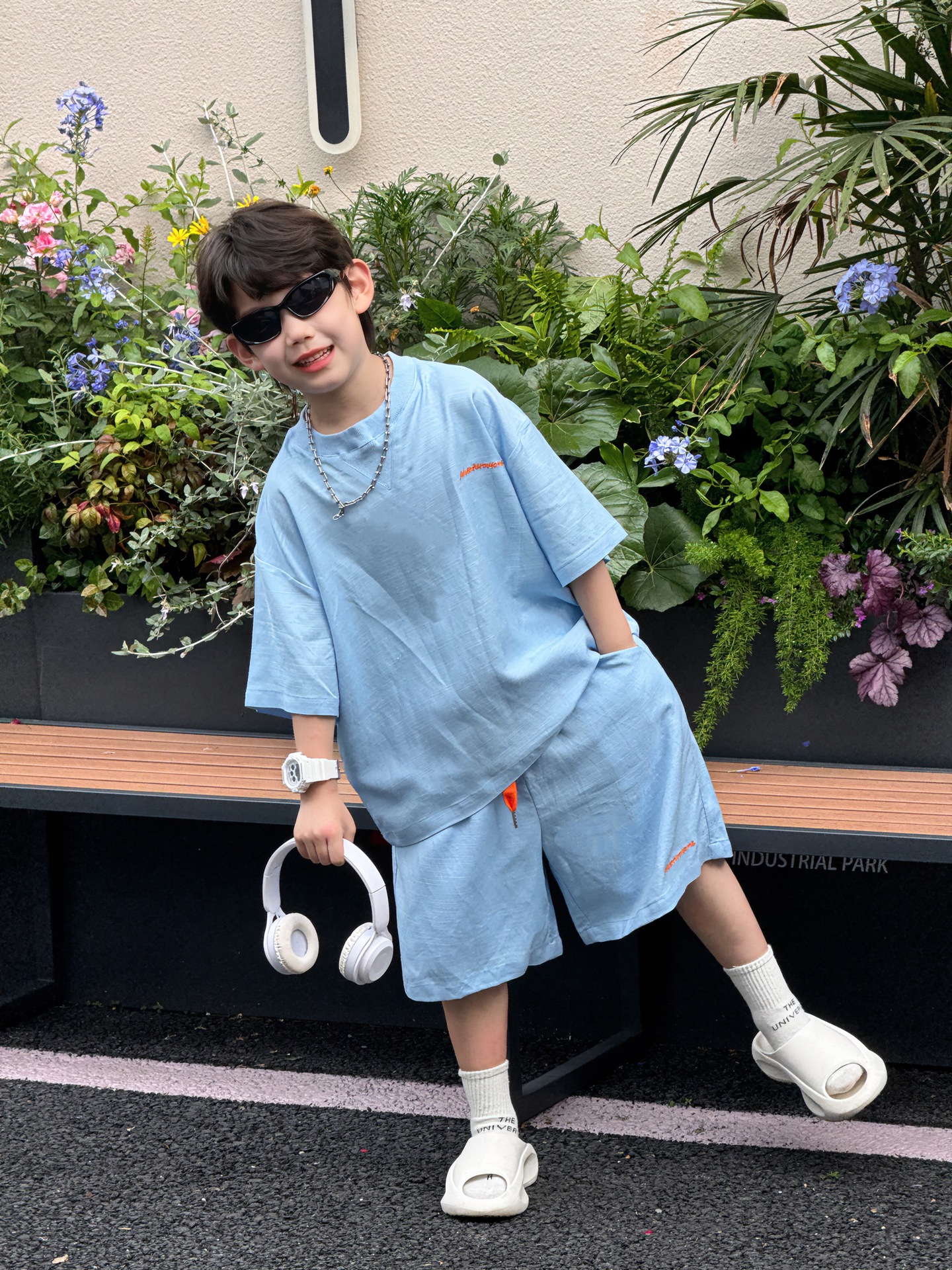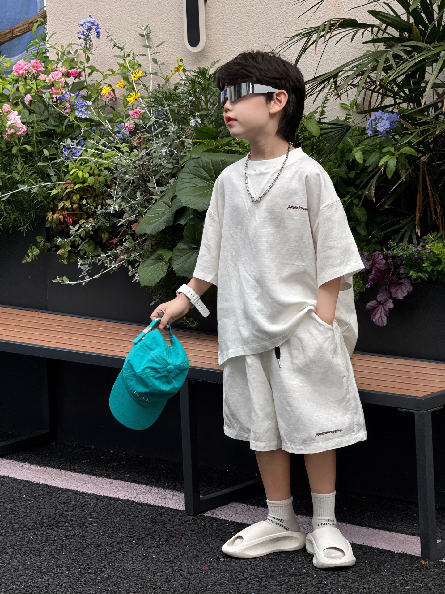 Tairu 2025 여름 새로운 한국 스타일 소년 패션 대마 코튼 통기성 세트 어린이 반팔 티셔츠 올 매치 반바지스토어 가기