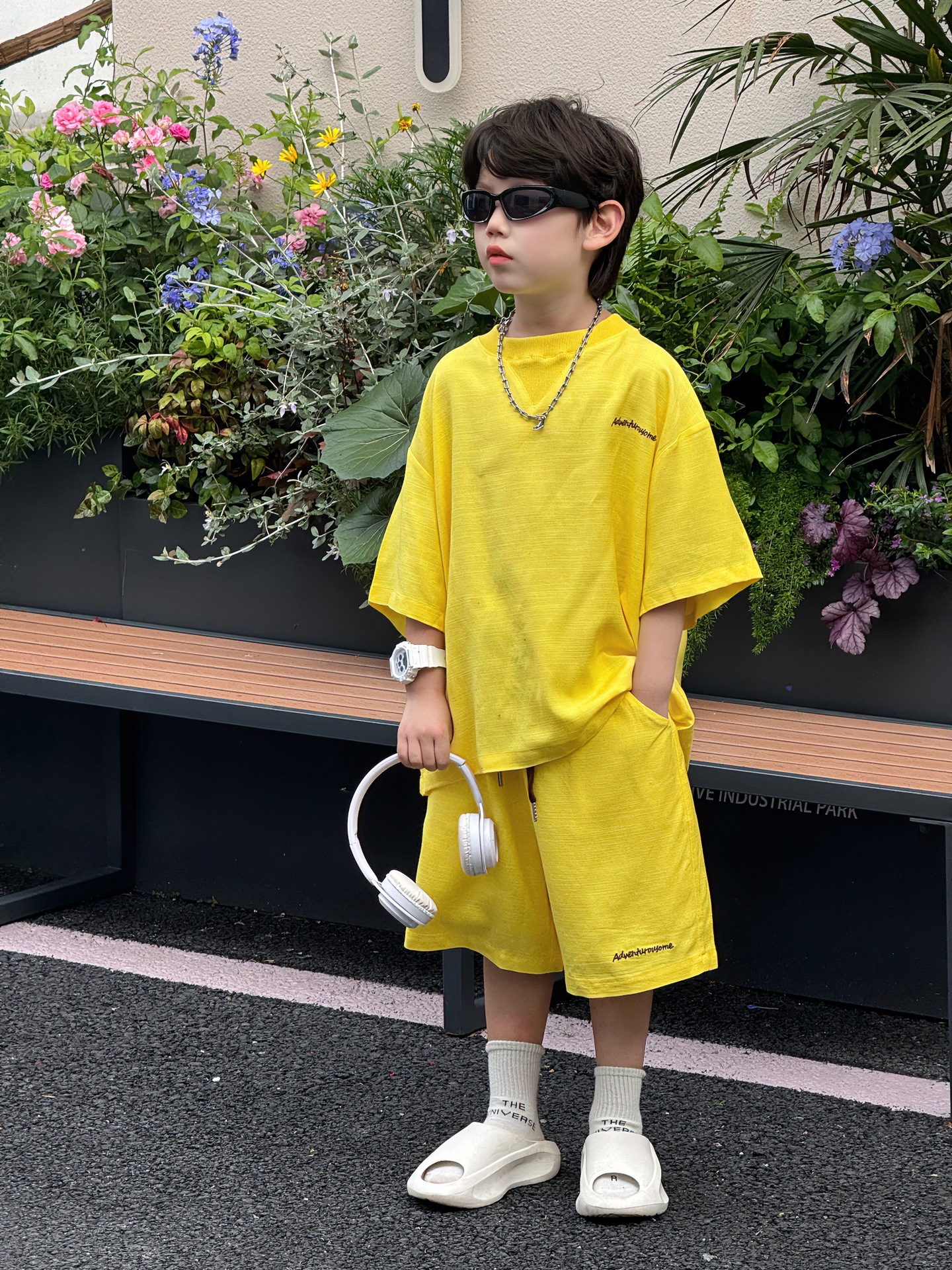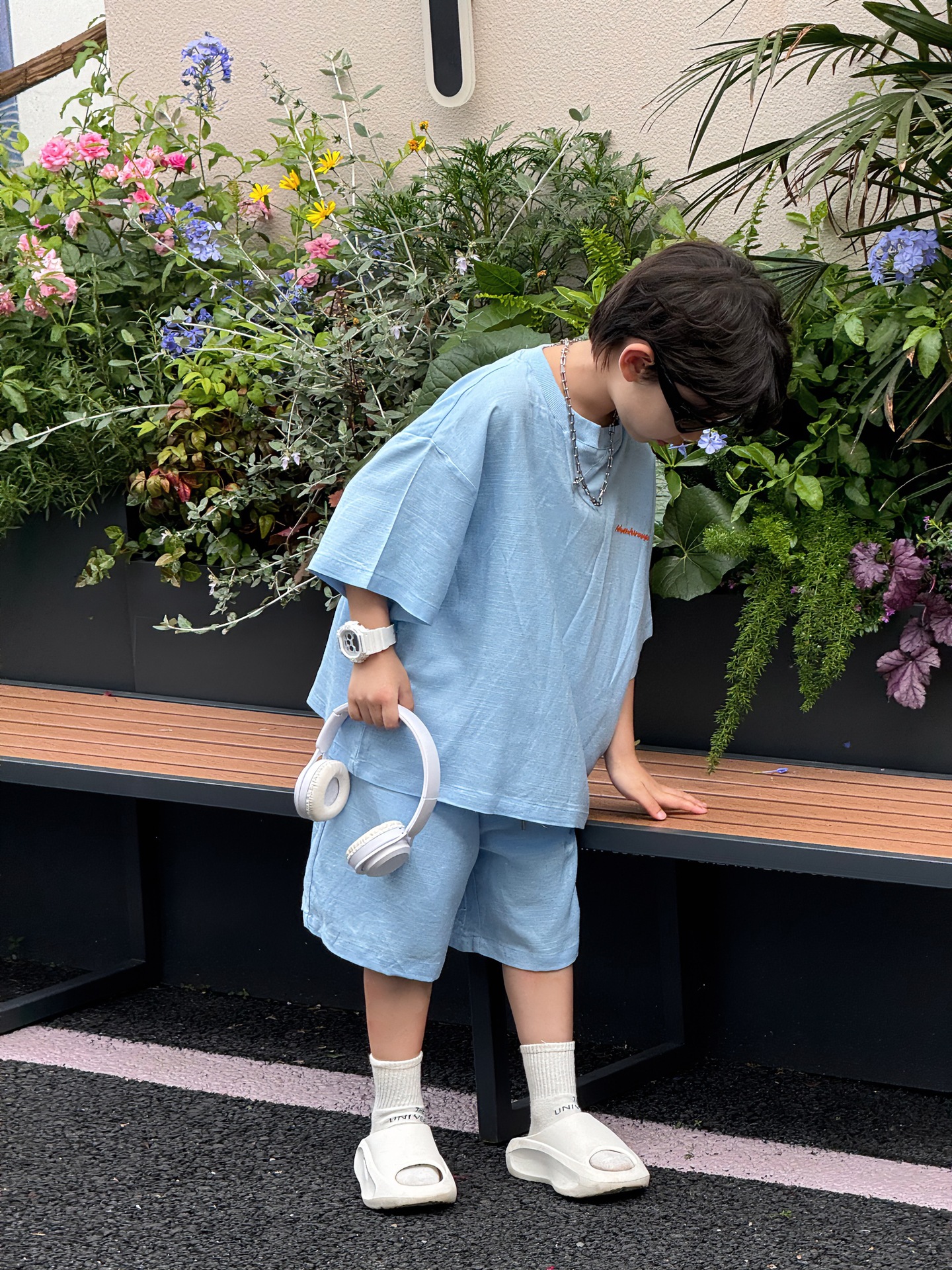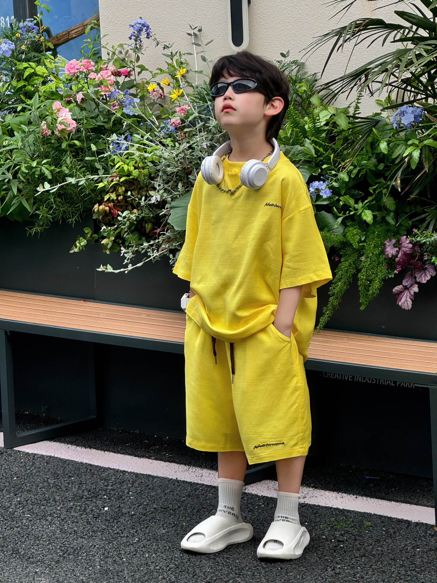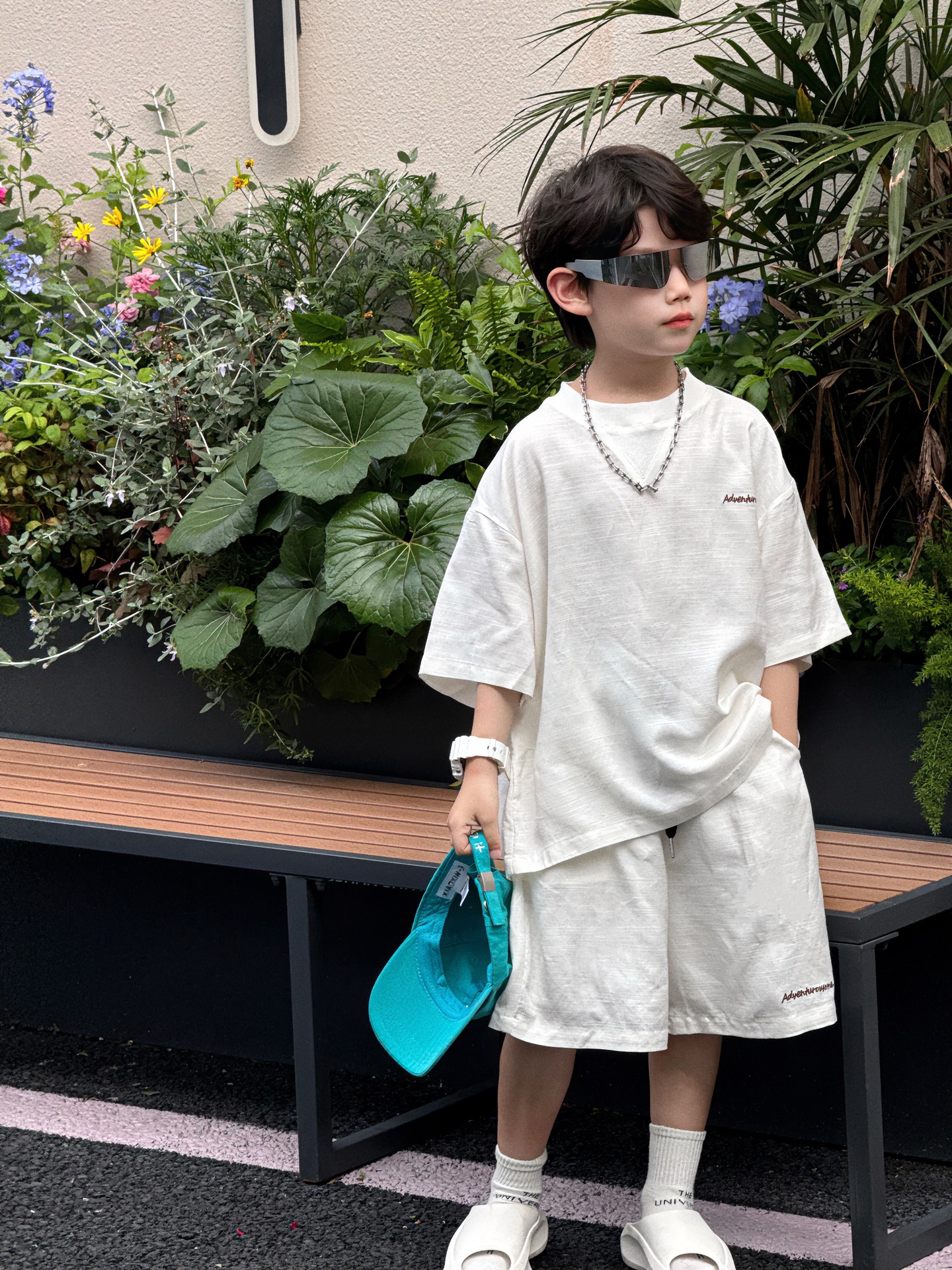 Tairu 2025 여름 새로운 한국 스타일 소년 패션 대마 코튼 통기성 세트 어린이 반팔 티셔츠 올 매치 반바지스토어 가기