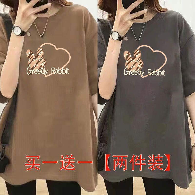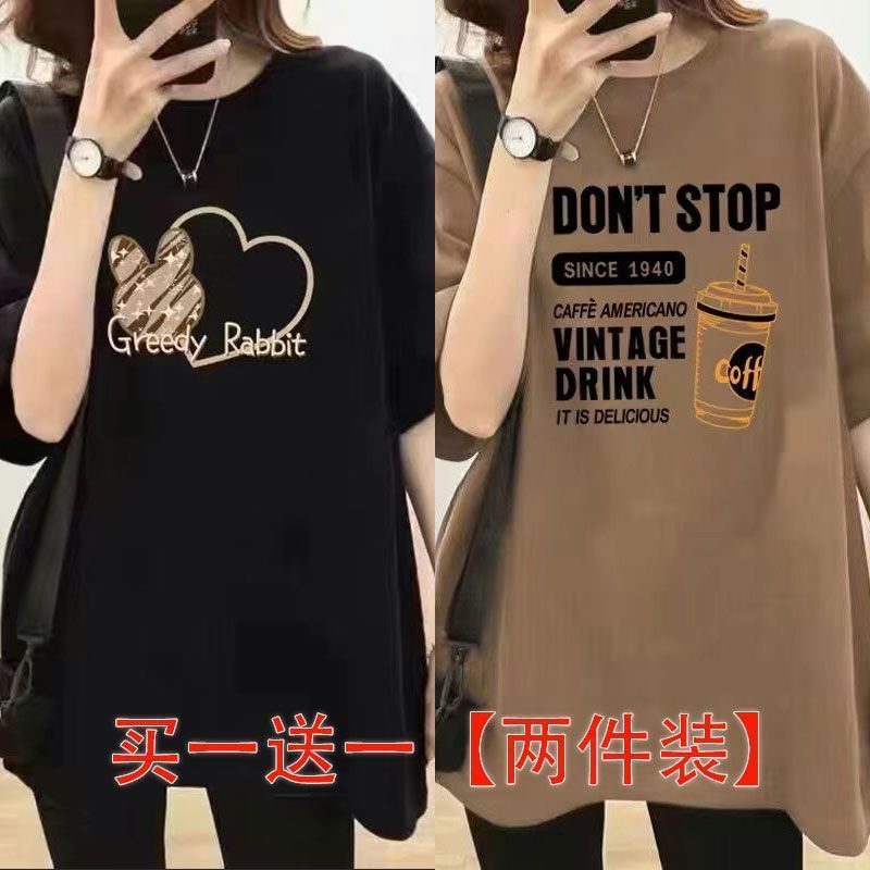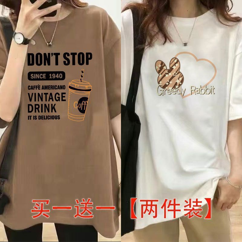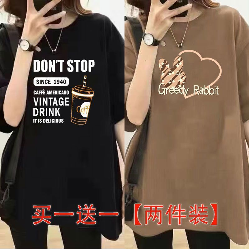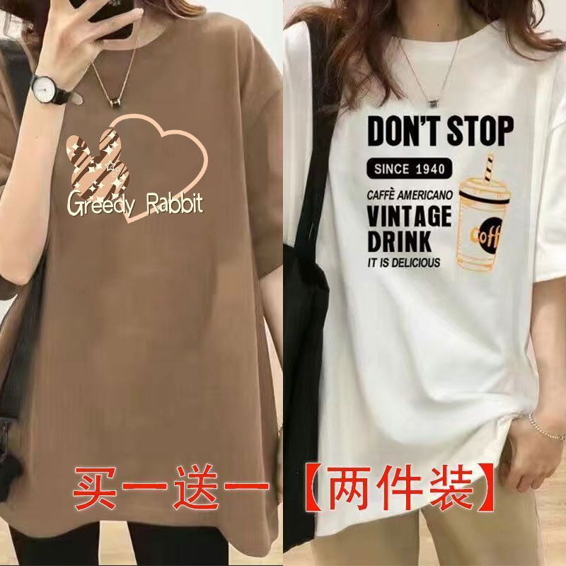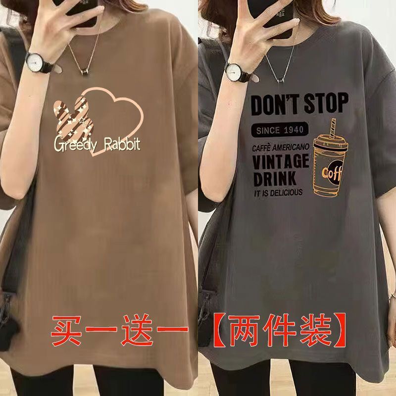 하나 사면 하나 무료로 여성용 중간 길이 반팔 티셔츠, 루즈하고 슬림한 디자인, 외국 스타일, 연령 감소, 게으른 스타일, 다용도 탑스토어 가기