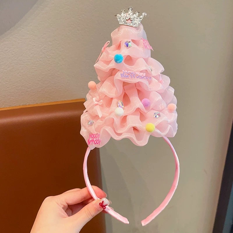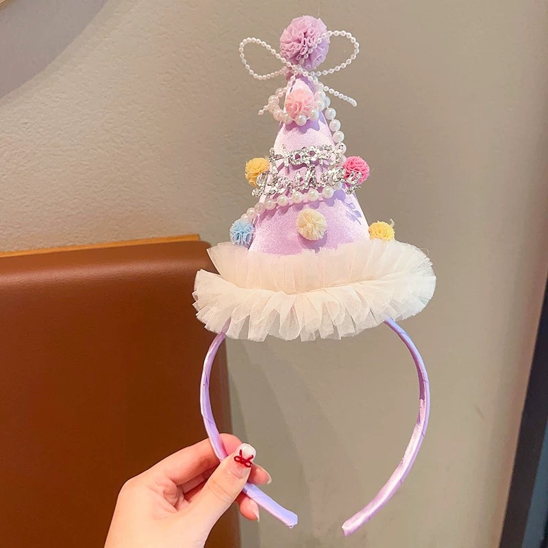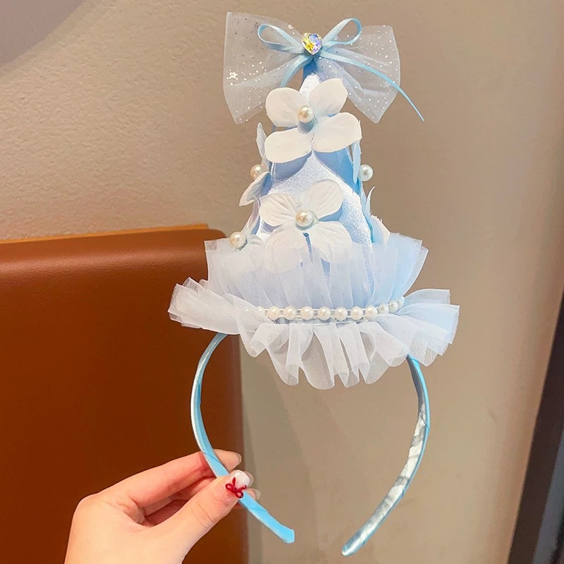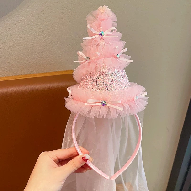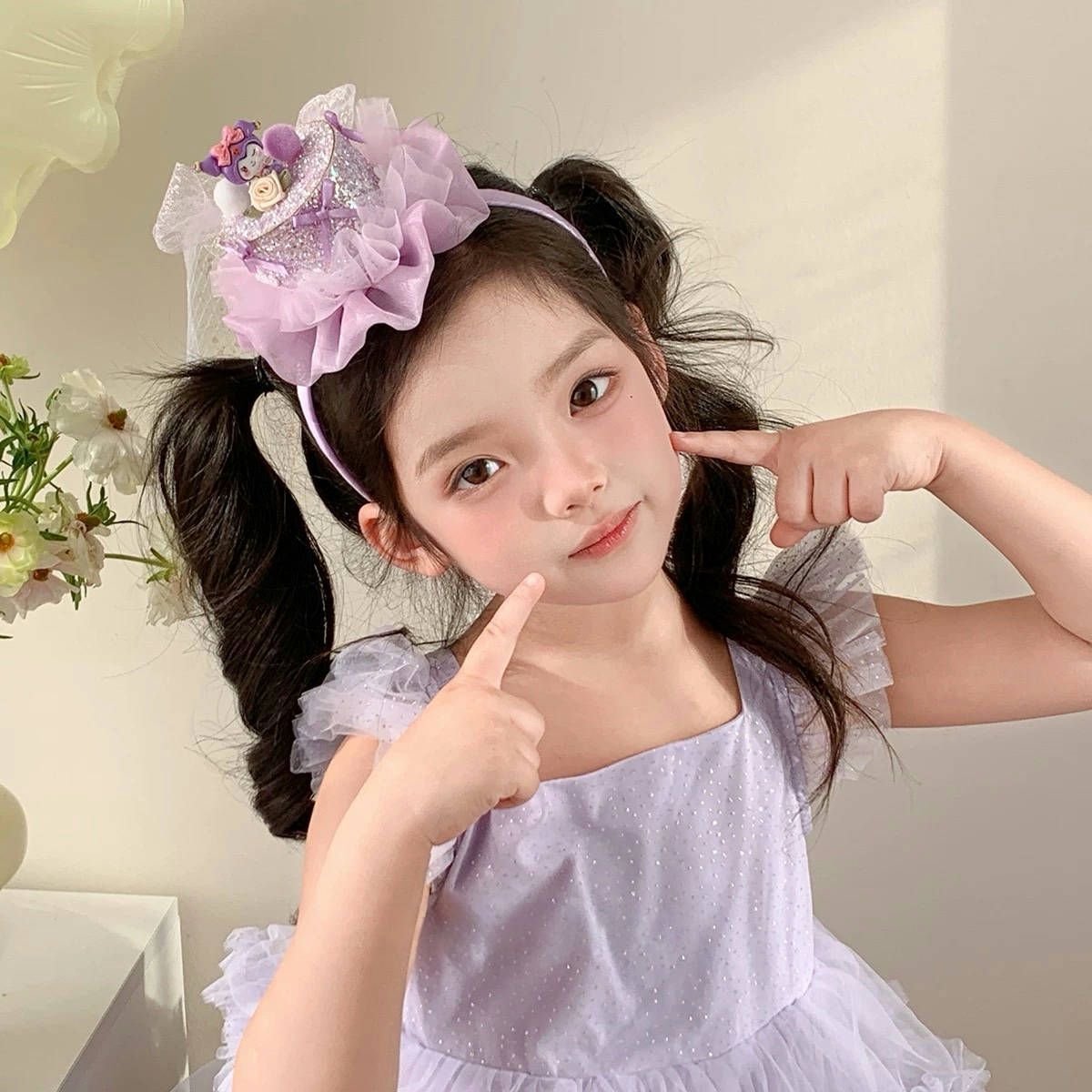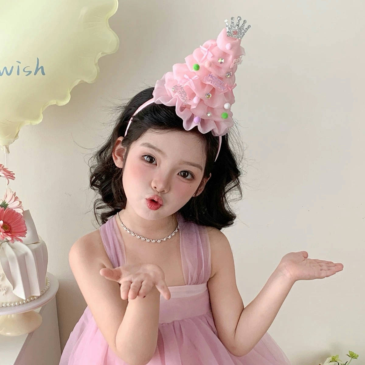 어린이 생일 케이크 글로우 머리띠 공주 진주 크라운 모자 머리띠 작은 소녀 귀여운 메쉬 헤어 액세서리