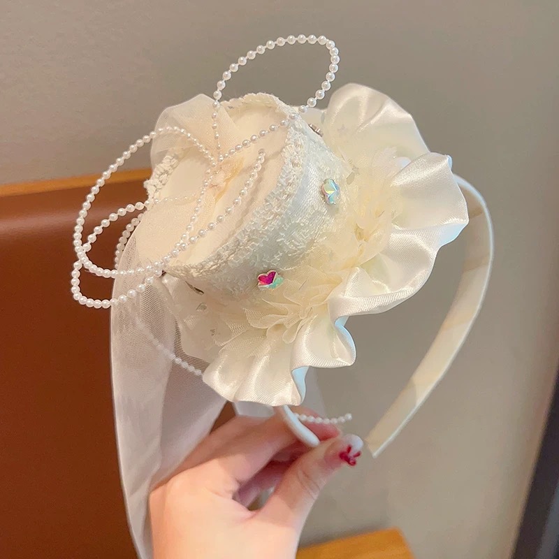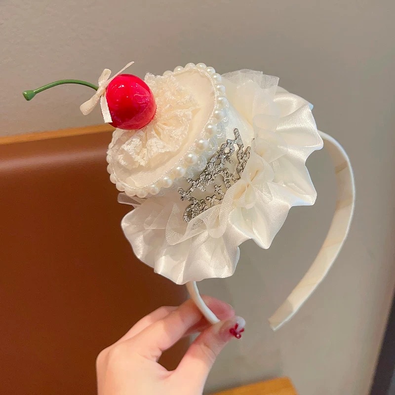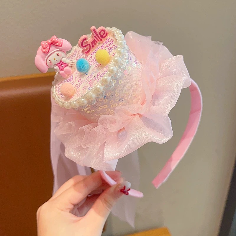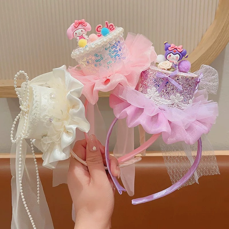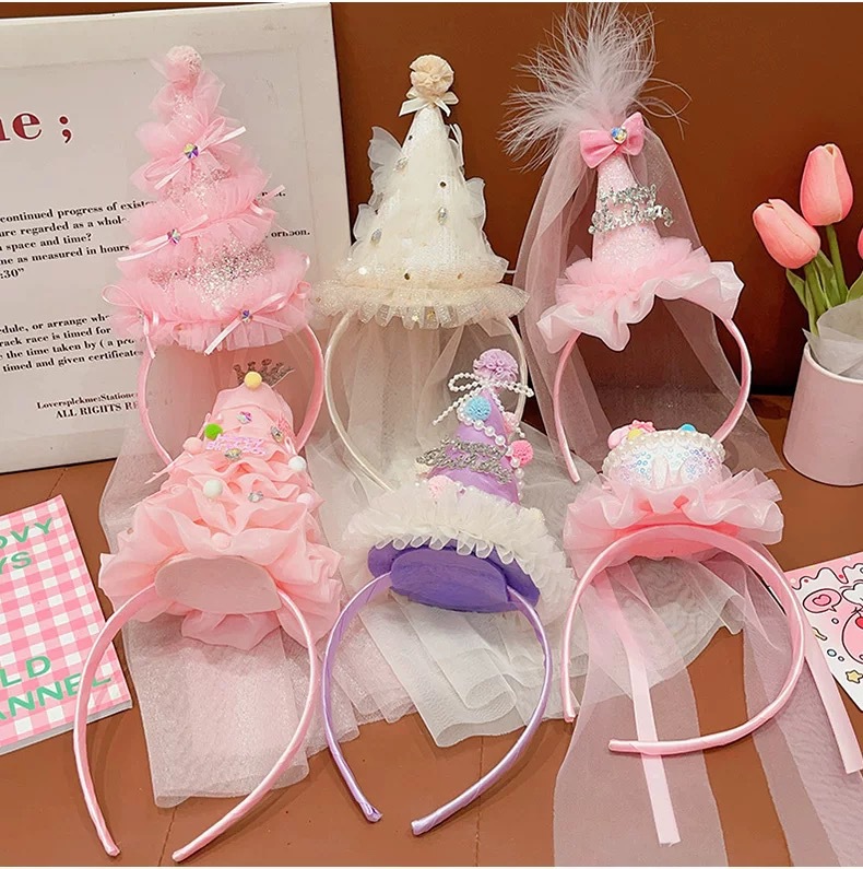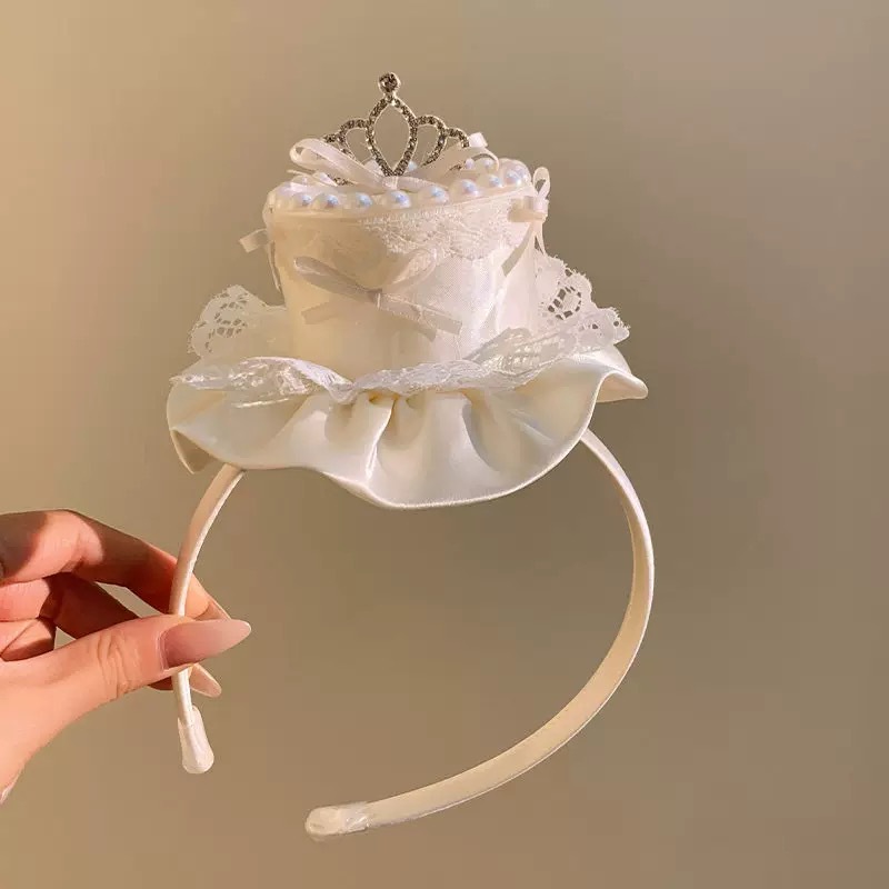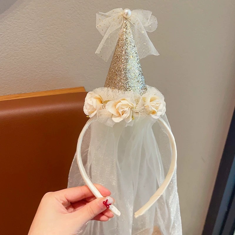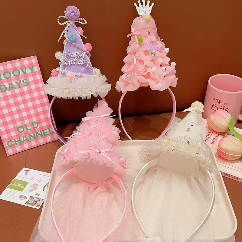 어린이 생일 케이크 글로우 머리띠 공주 진주 크라운 모자 머리띠 작은 소녀 귀여운 메쉬 헤어 액세서리