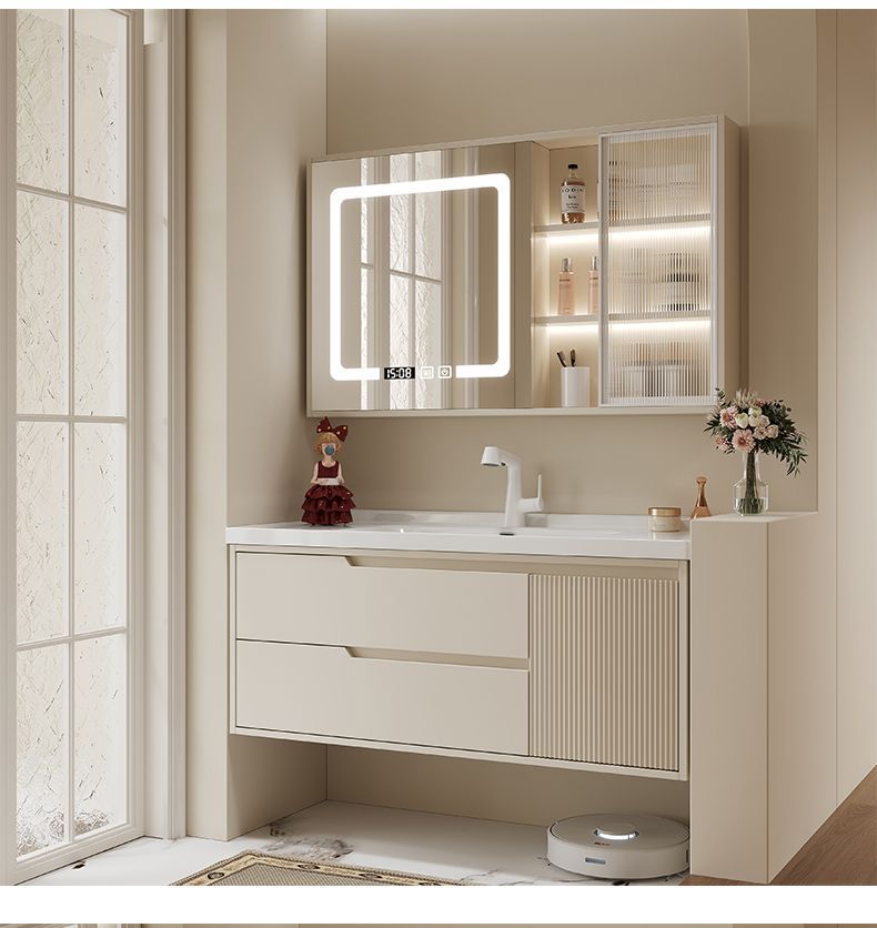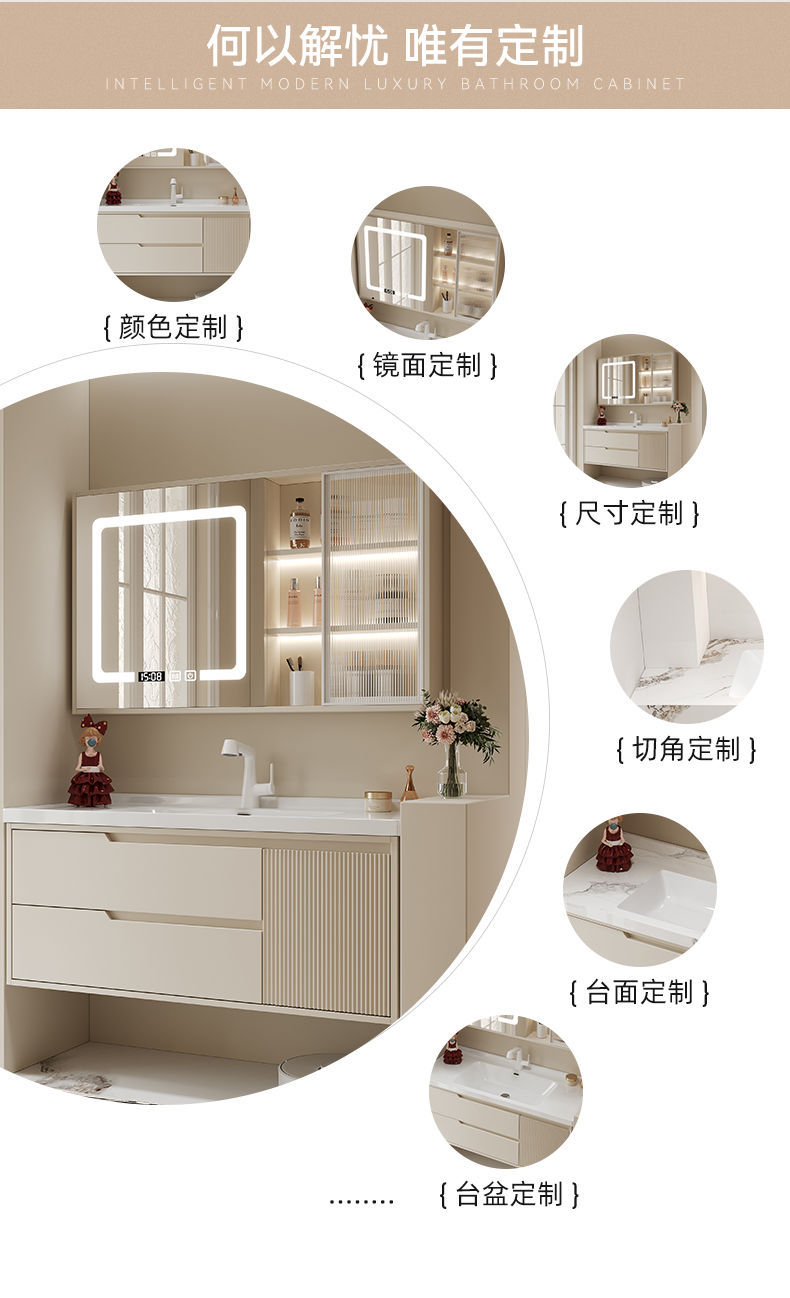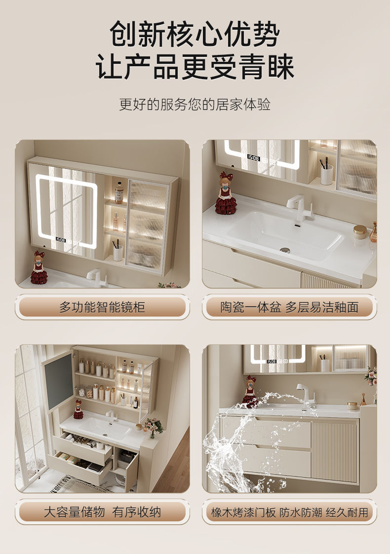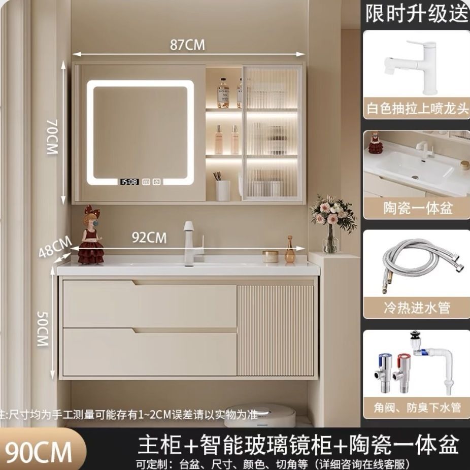 크림 스타일 단단한 참나무 욕실 캐비닛 통합 세라믹 세면대 욕실 세면대 조합 가정용 세면대스토어 가기