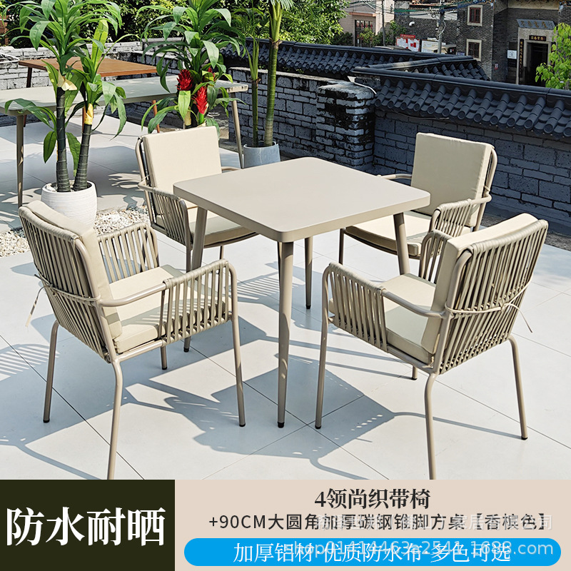 • 칼라가 있는 고급 웨빙 의자 4개 + 90CM 대형 둥근 모서리 두꺼운 탄소강 원추형 다리 사각 테이블 [샴페인 색상]