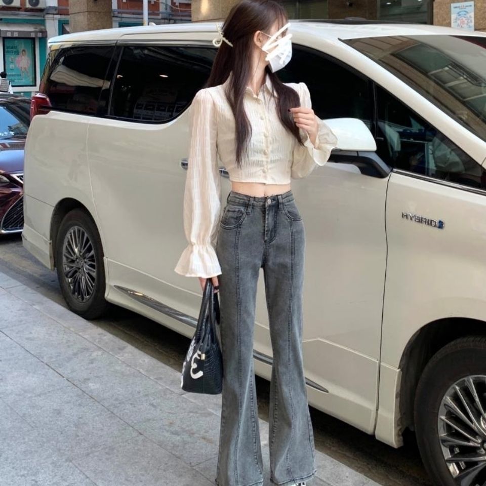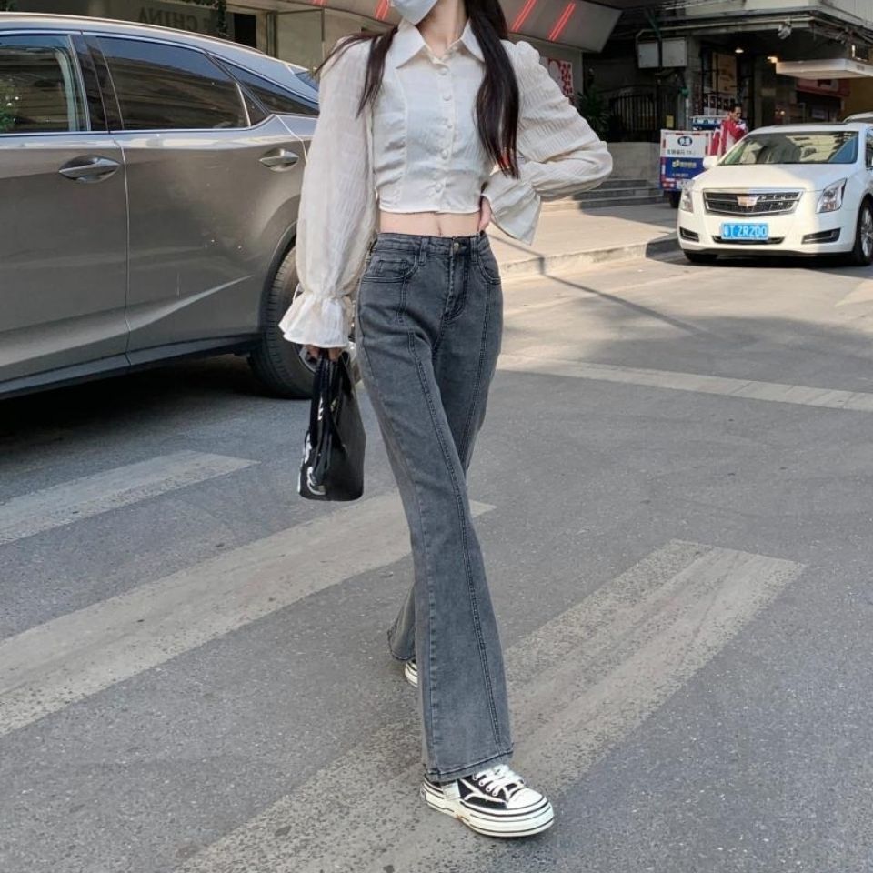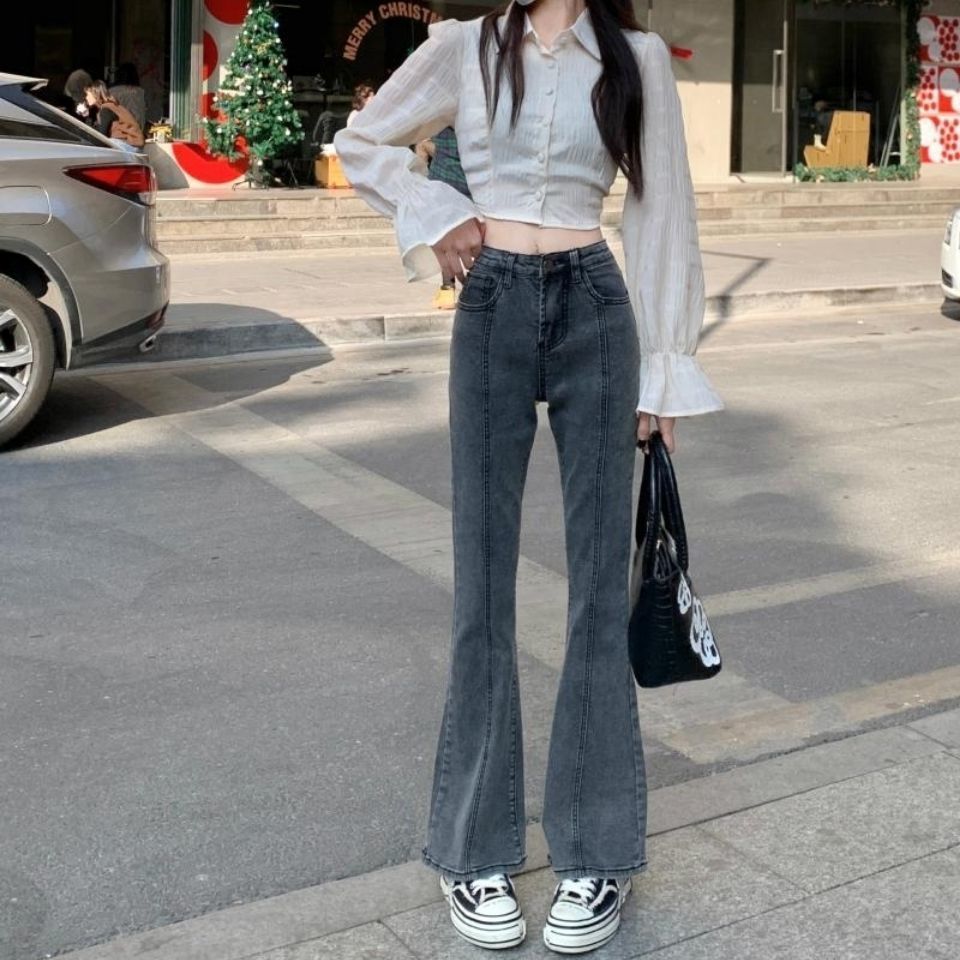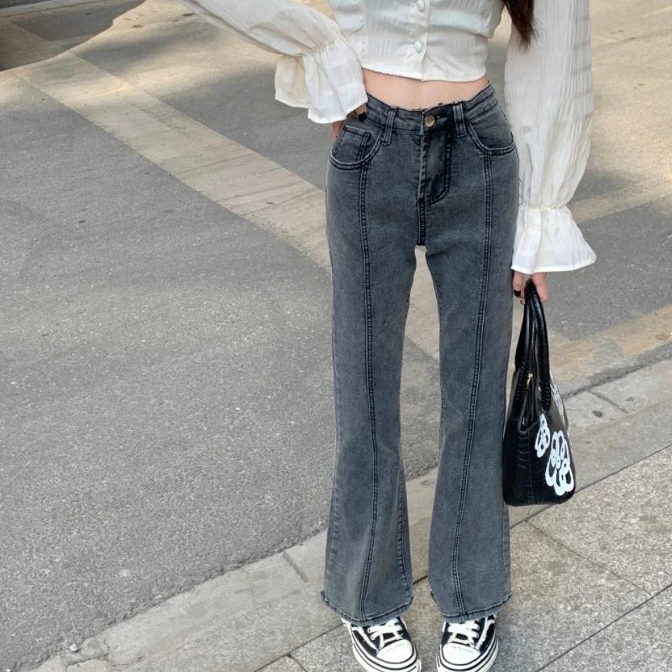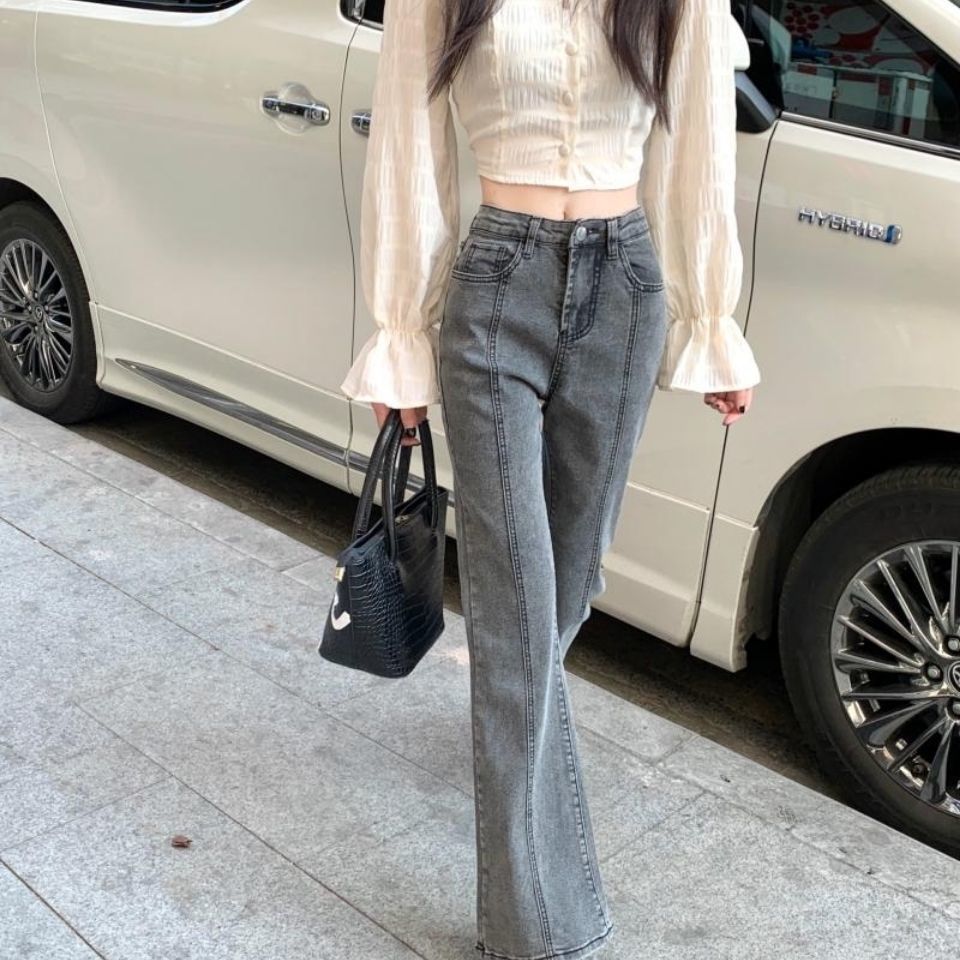 회색 청바지 여성의 2025 새로운 스타일 뜨거운 소녀 디자인 센스 틈새 높은 허리 슬리밍 트럼펫 바지 하이 스트리트 트렌디 인스토어 가기