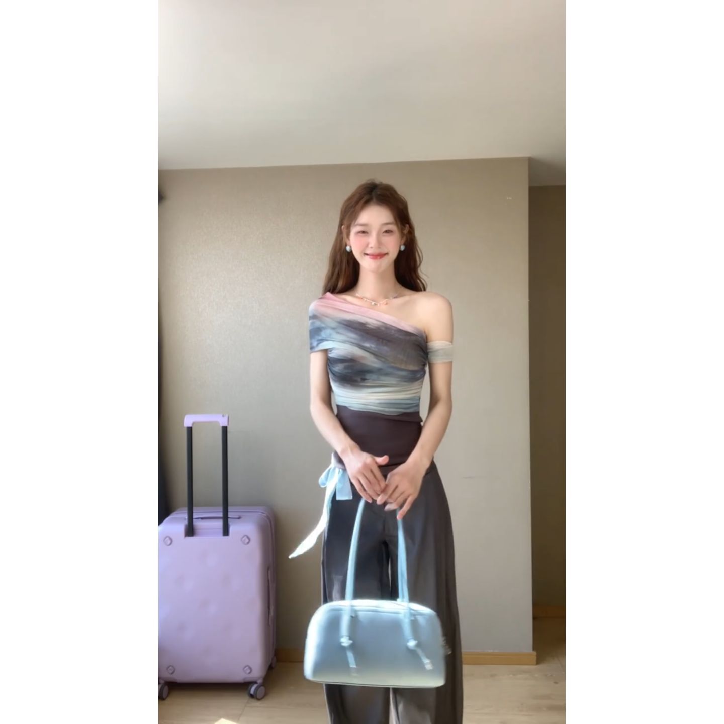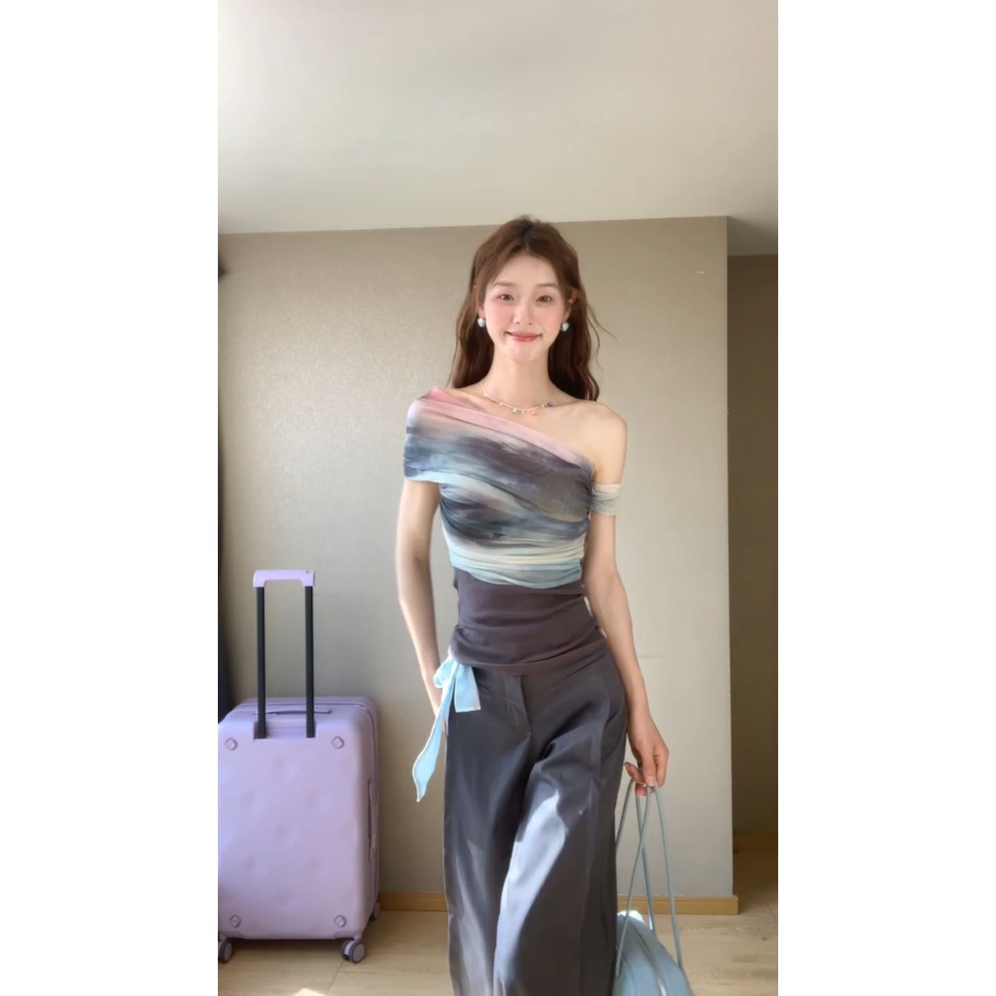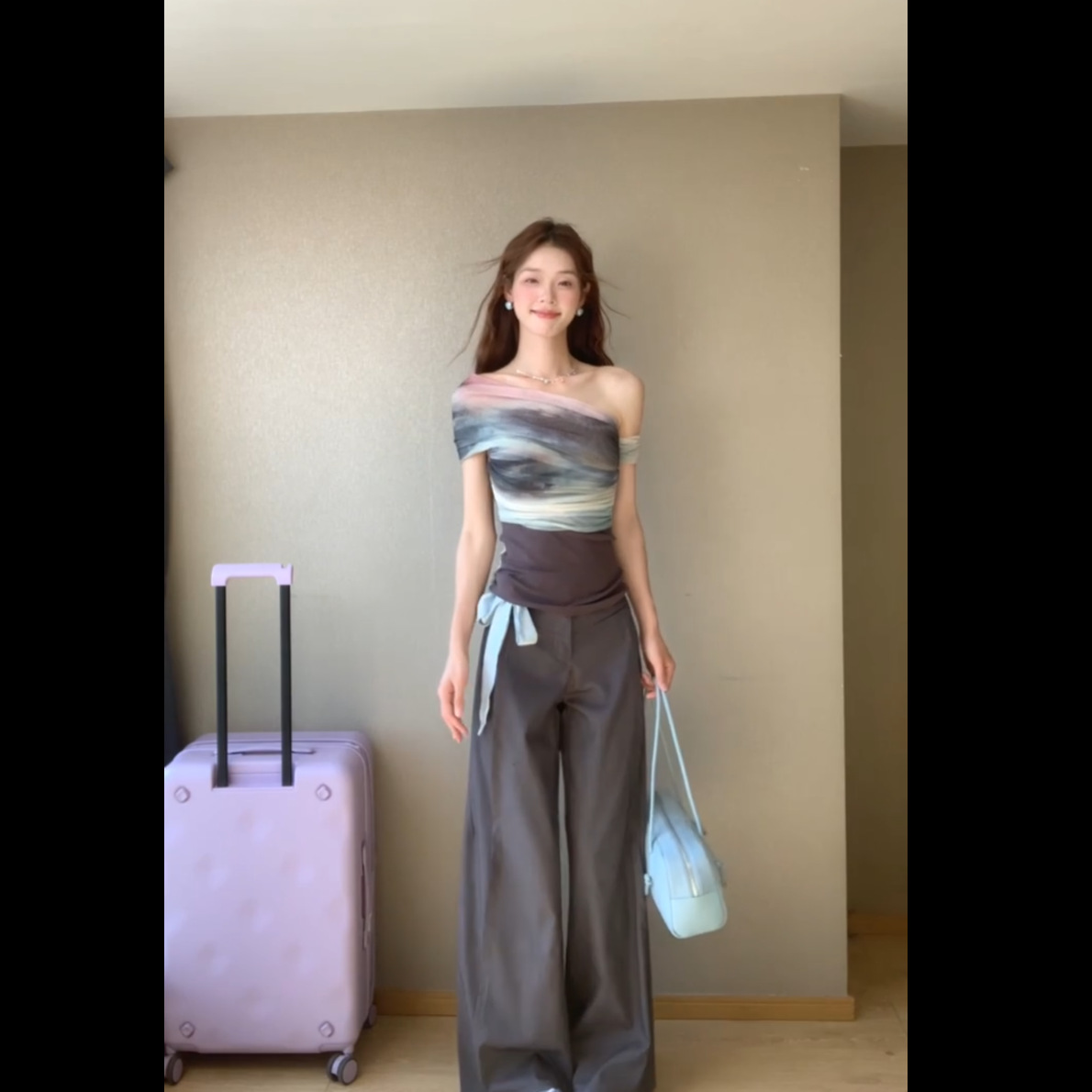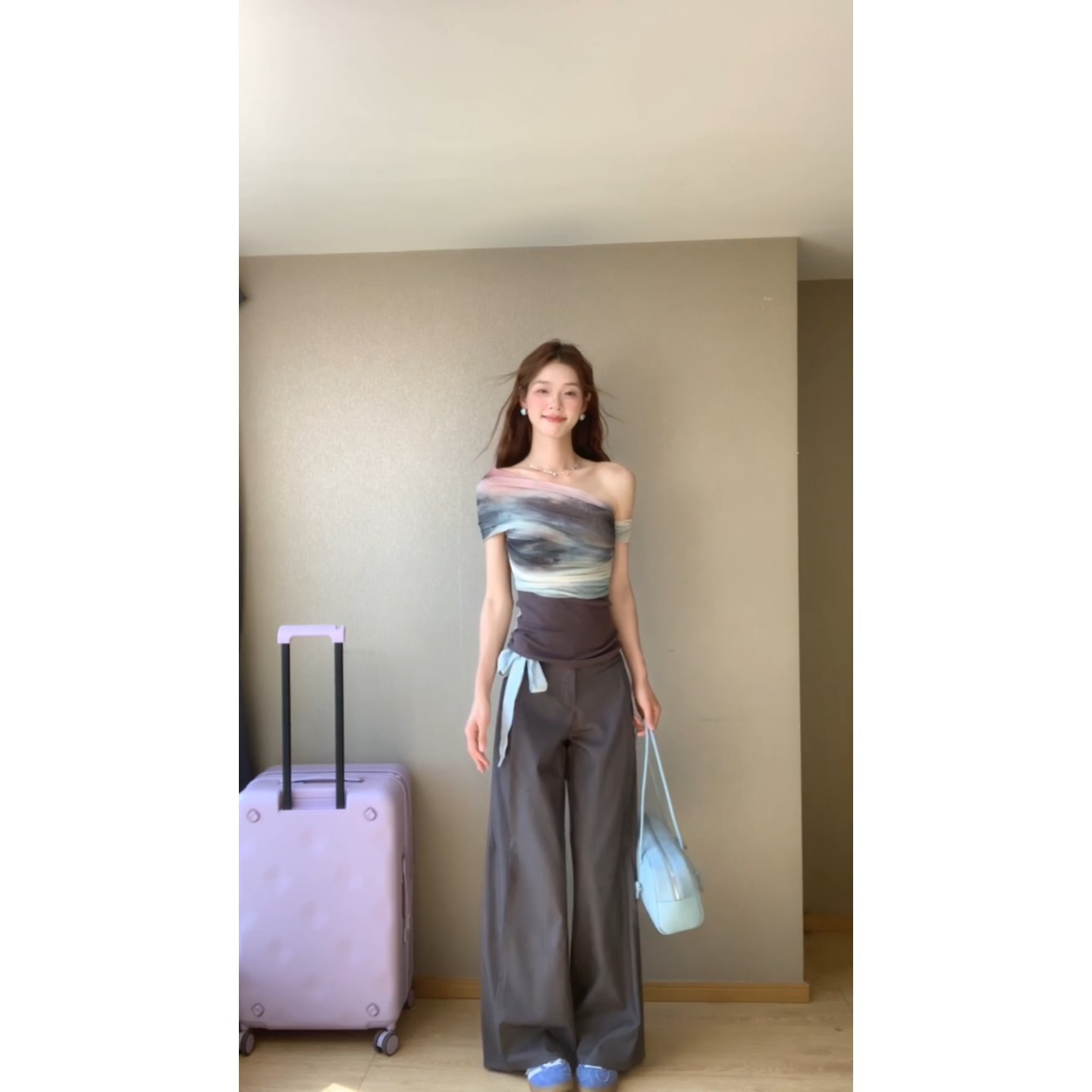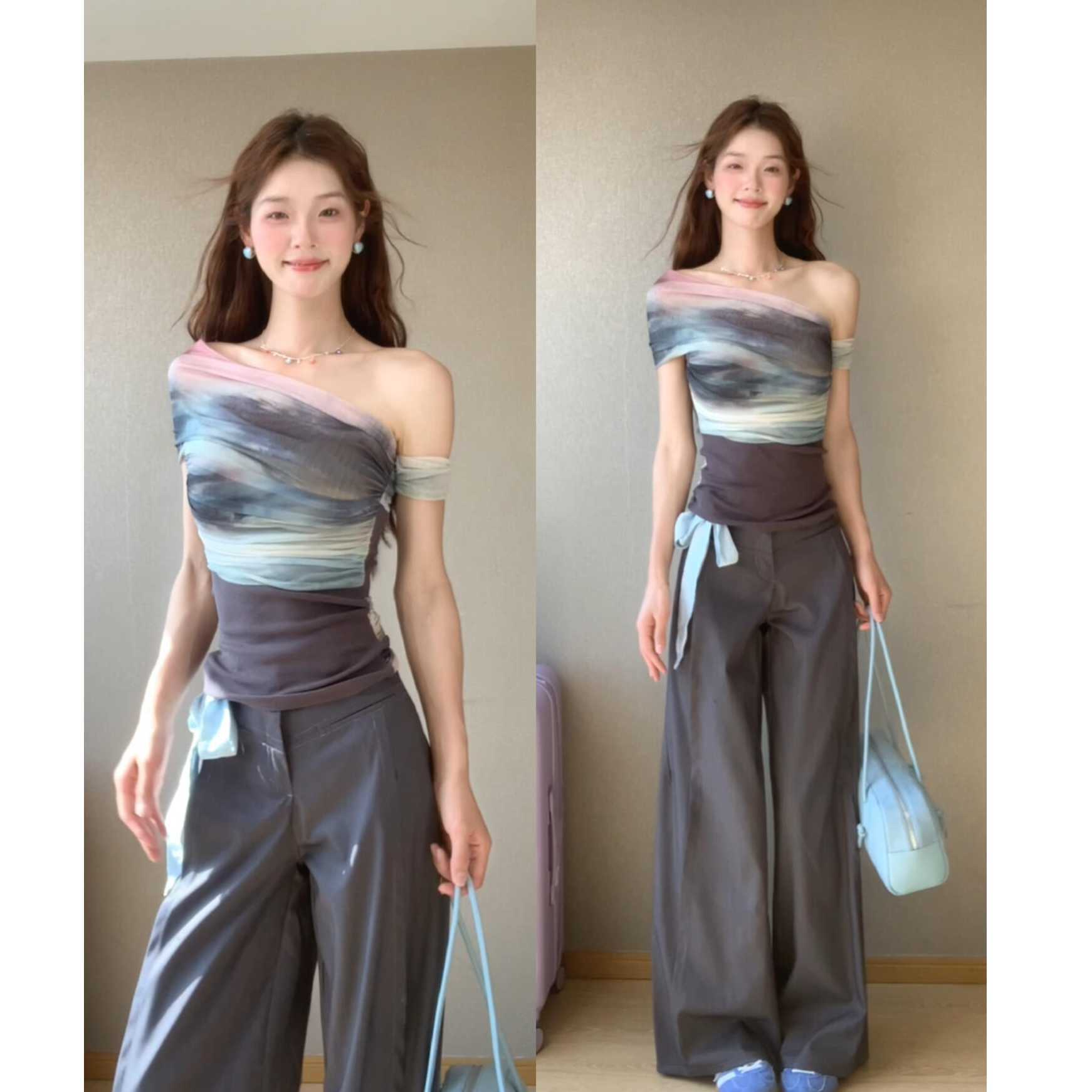 여름 잉크 발견 오프 숄더 틈새 메쉬 반팔 아메리칸 스타일 스파이스 소녀 스트레이트 레그 와이드 레그 캐주얼 바지 세트