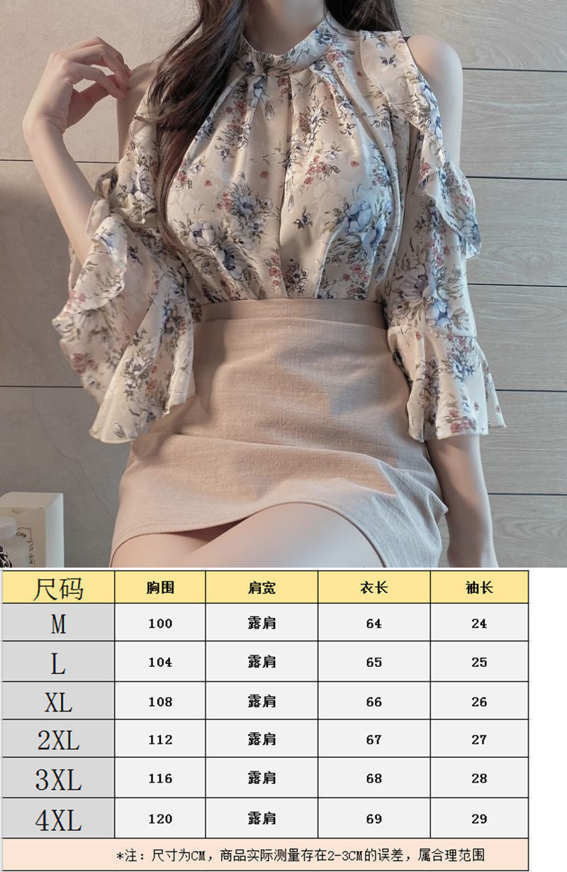 뚱뚱한 여자를 위한 플러스 사이즈 여름 프렌치 플로럴 러플 오프 숄더 쉬폰 셔츠, 루즈하고 활용도가 높은 오프 숄더 셔츠