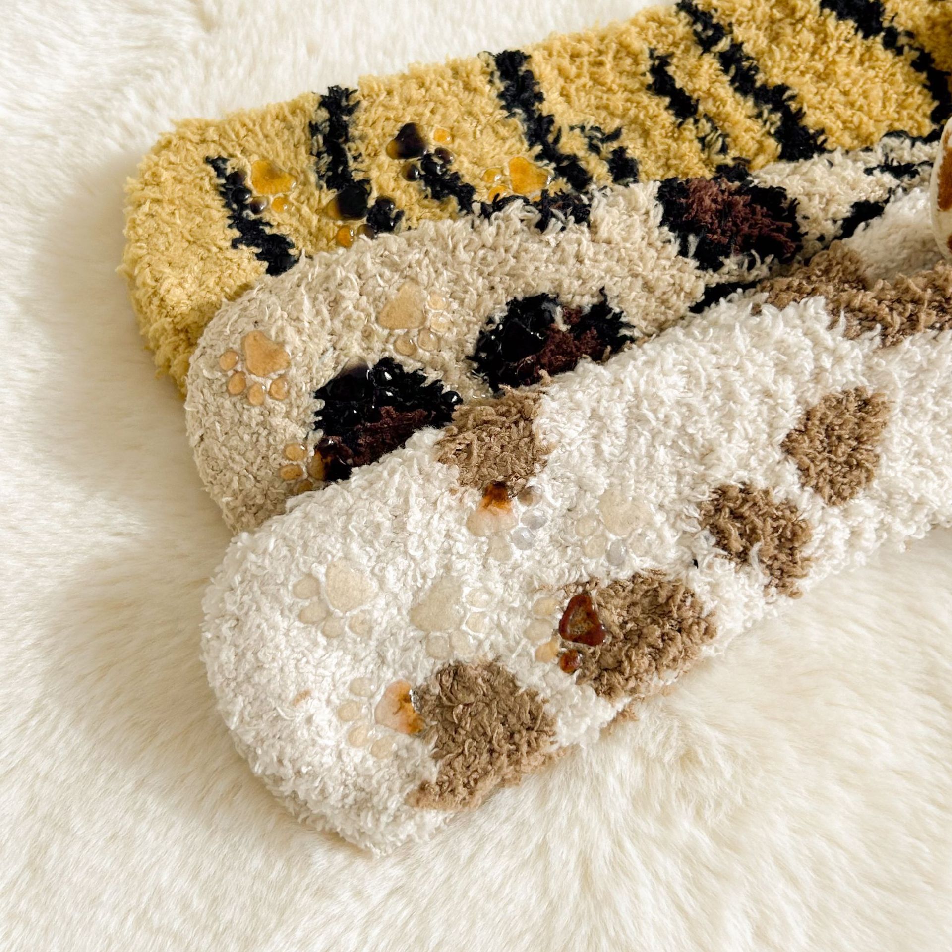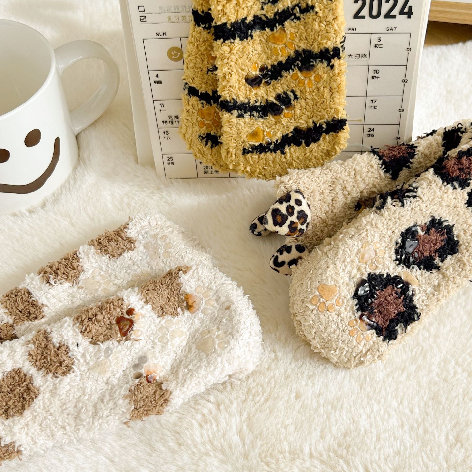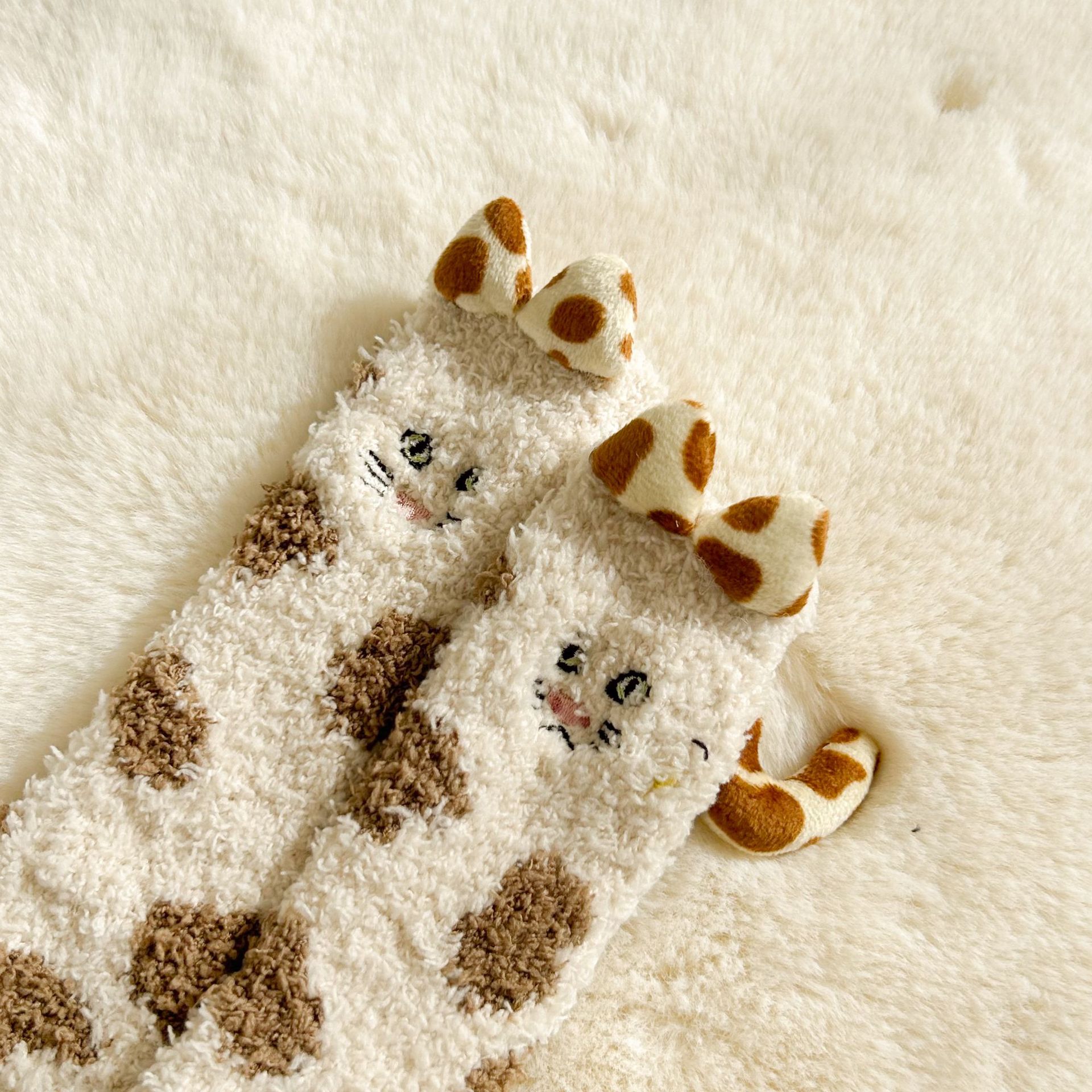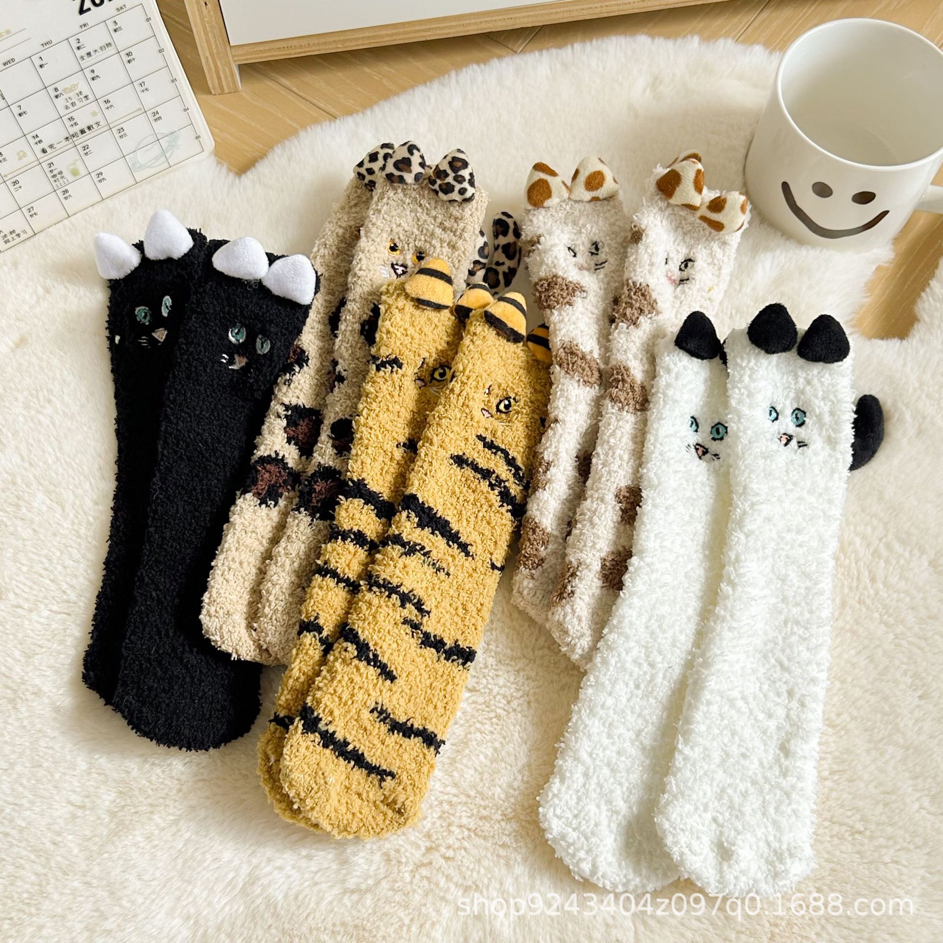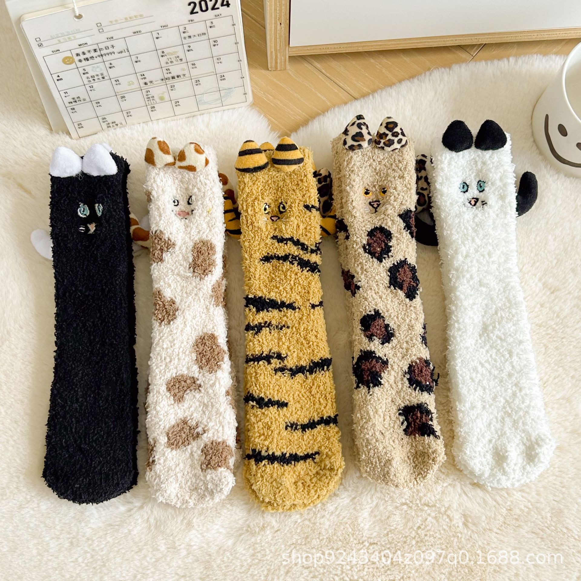 가을, 겨울 산호 벨벳 양말 바닥 양말 어린이 반 벨벳 수면 양말 겨울 두꺼운 따뜻한 중간 튜브 양말 만화 고양이스토어 가기