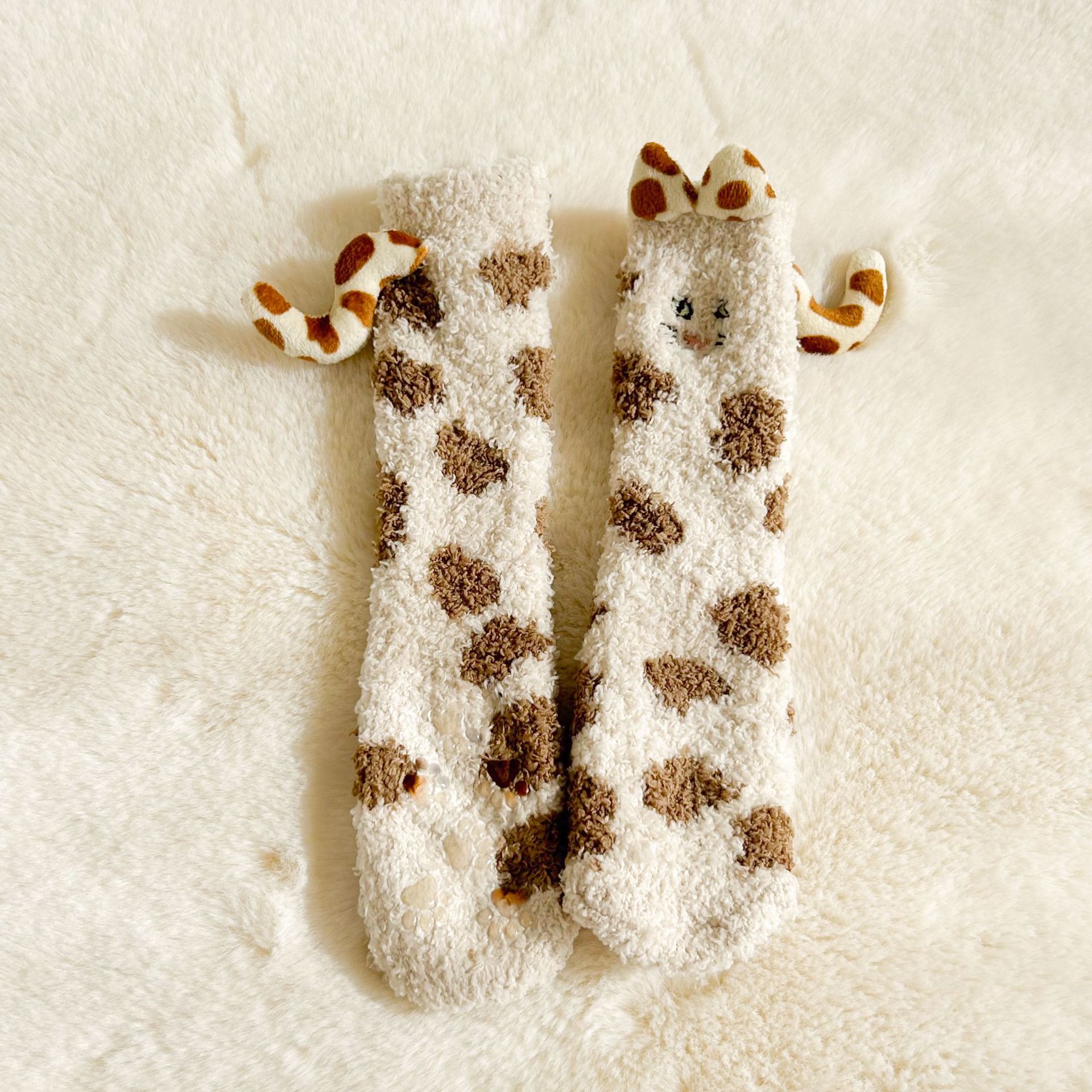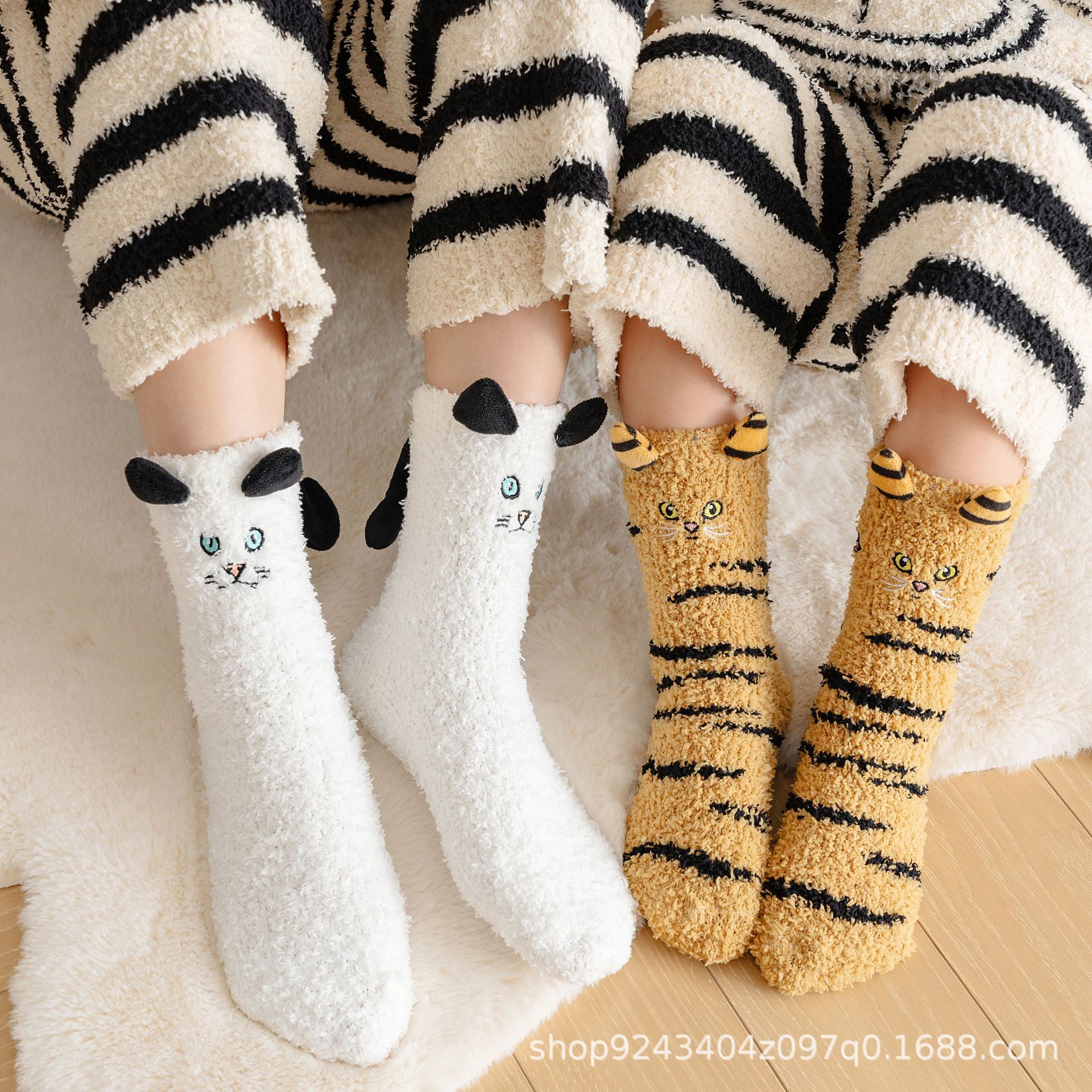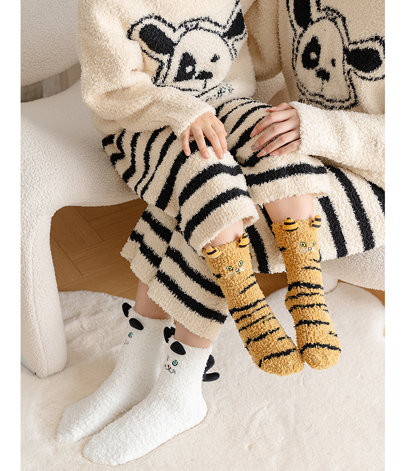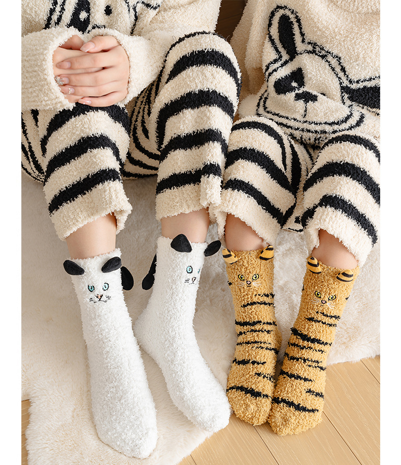 가을, 겨울 산호 벨벳 양말 바닥 양말 어린이 반 벨벳 수면 양말 겨울 두꺼운 따뜻한 중간 튜브 양말 만화 고양이