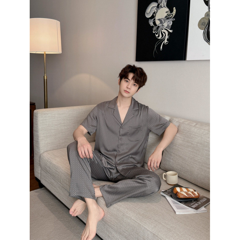 심플하고 가벼운 럭셔리 자카드 남성용 잠옷 봄 여름 아이스 실크 새틴 긴팔 편안한 양복은 집 밖에서 입을 수 있습니다스토어 가기