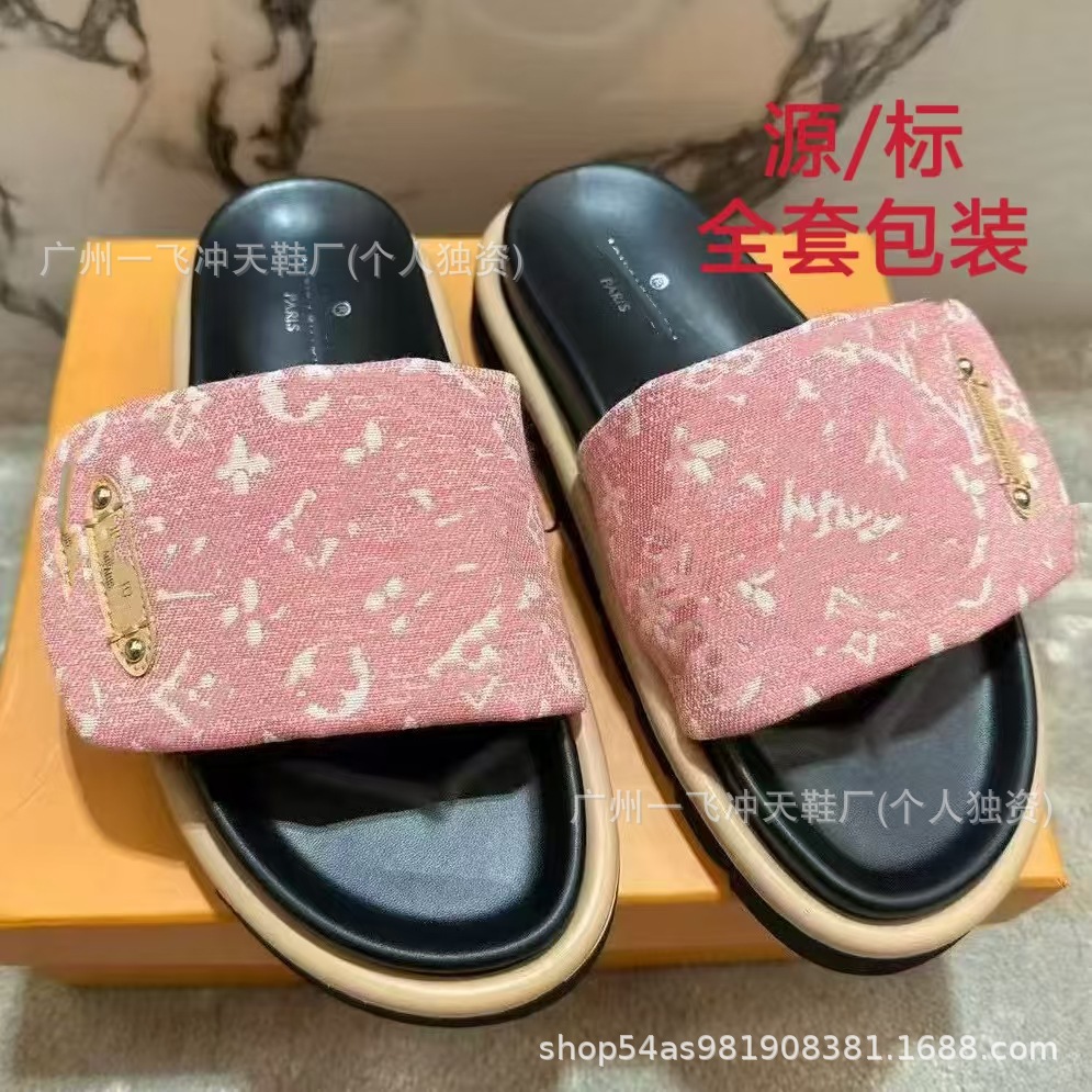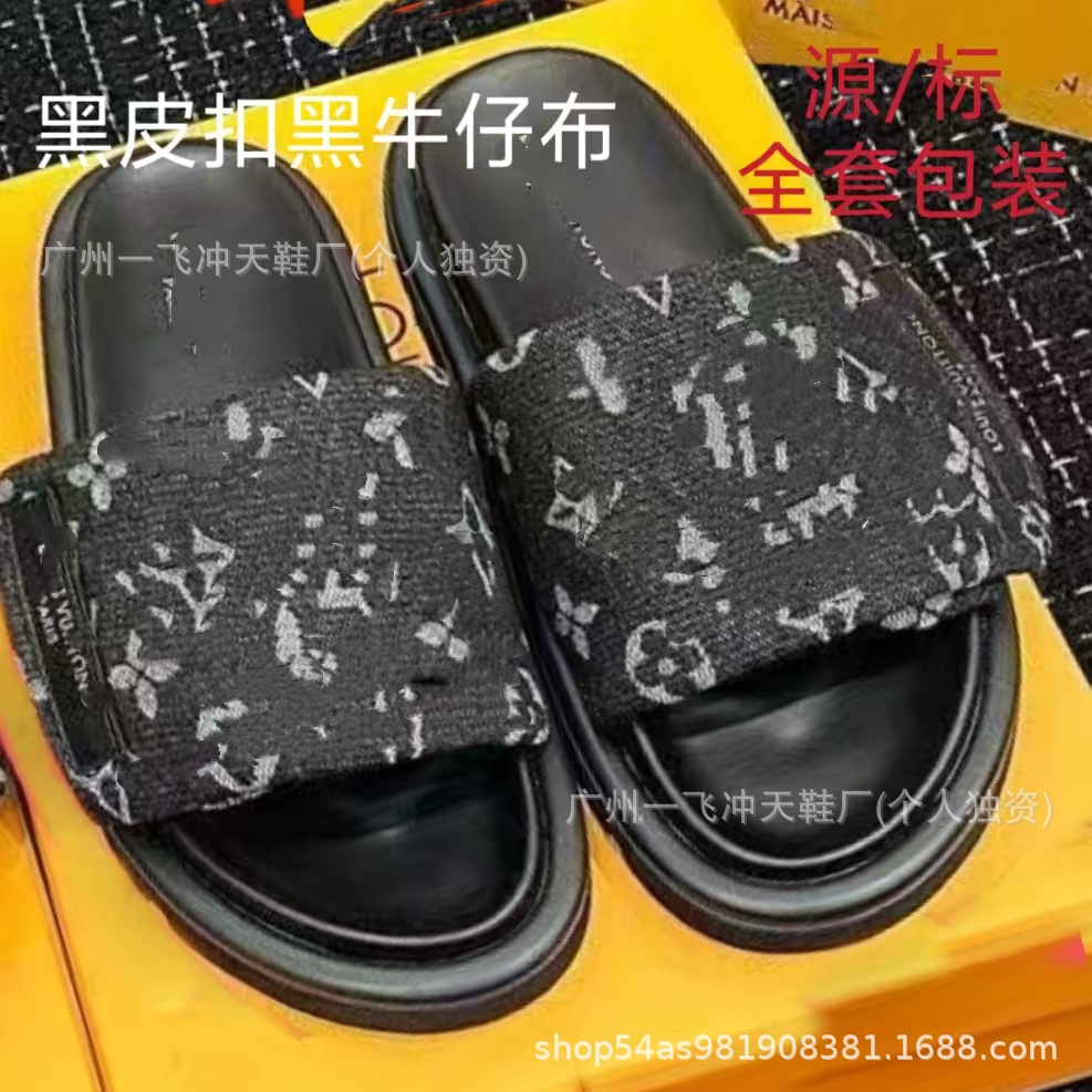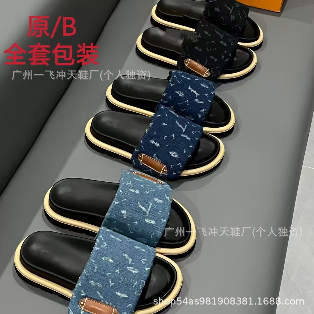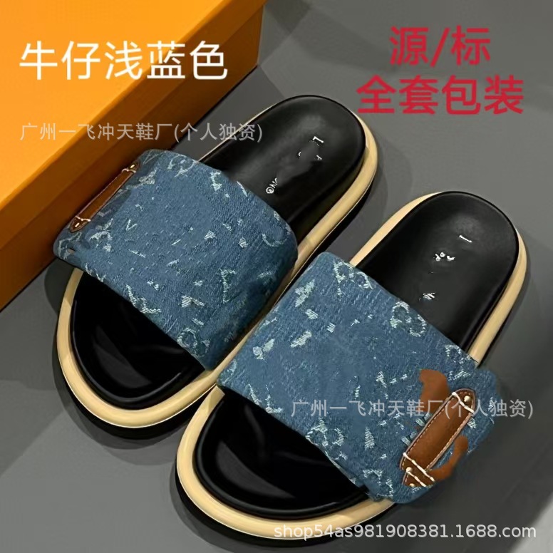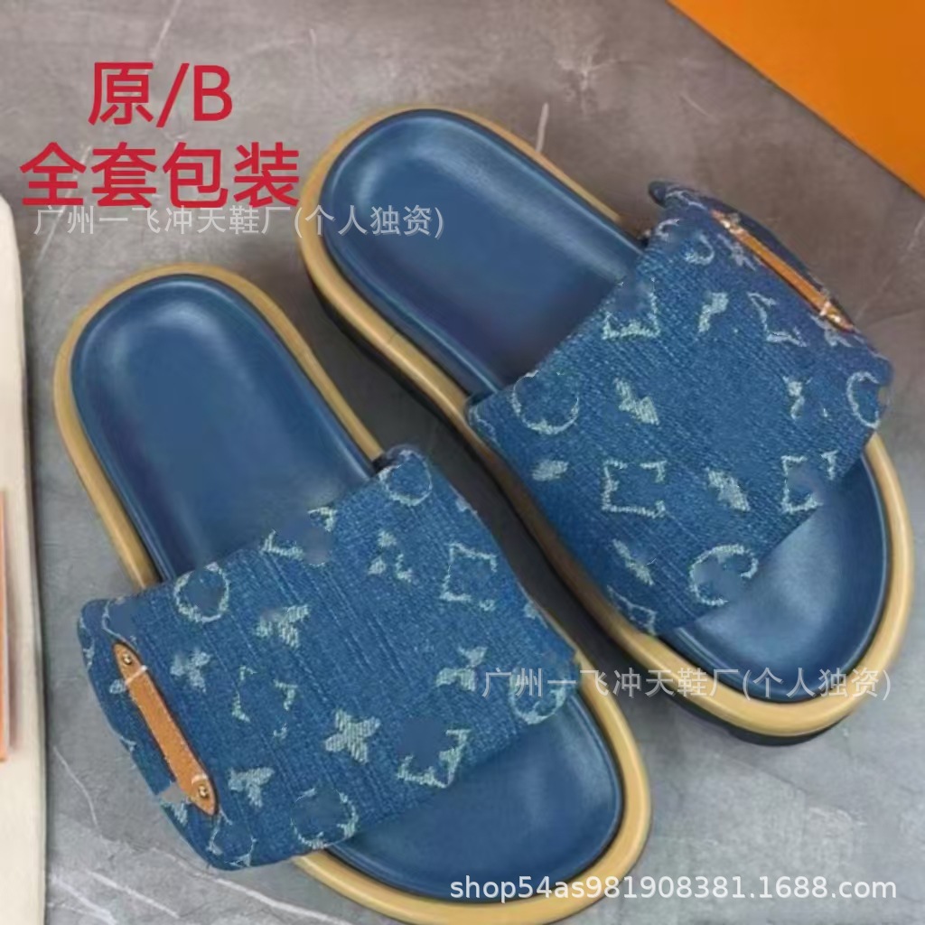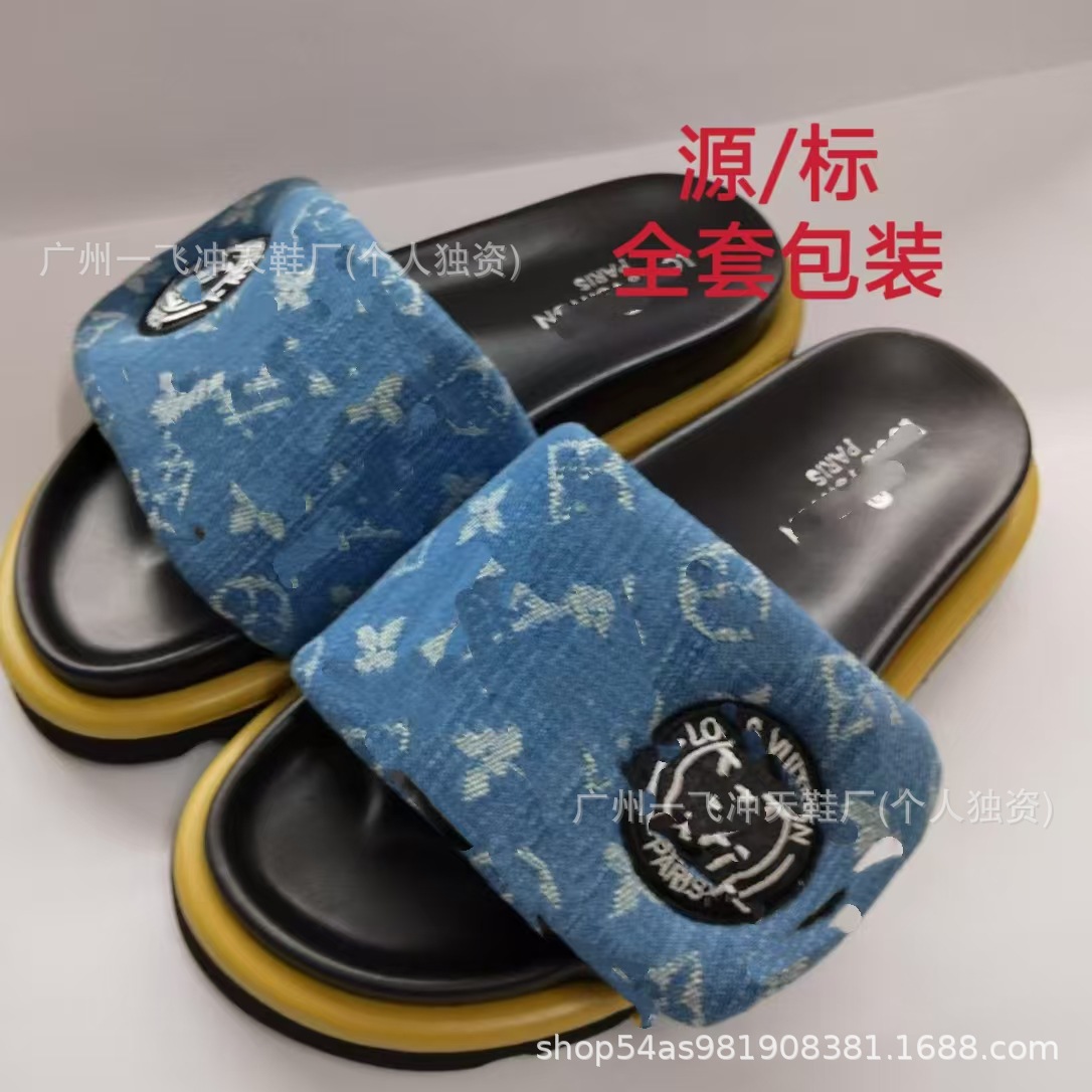 V 가족 두꺼운 바닥 벨크로 슬리퍼 여성의 2024 캐주얼 의상 유행 비 슬립 데님 편지 여성 신발스토어 가기