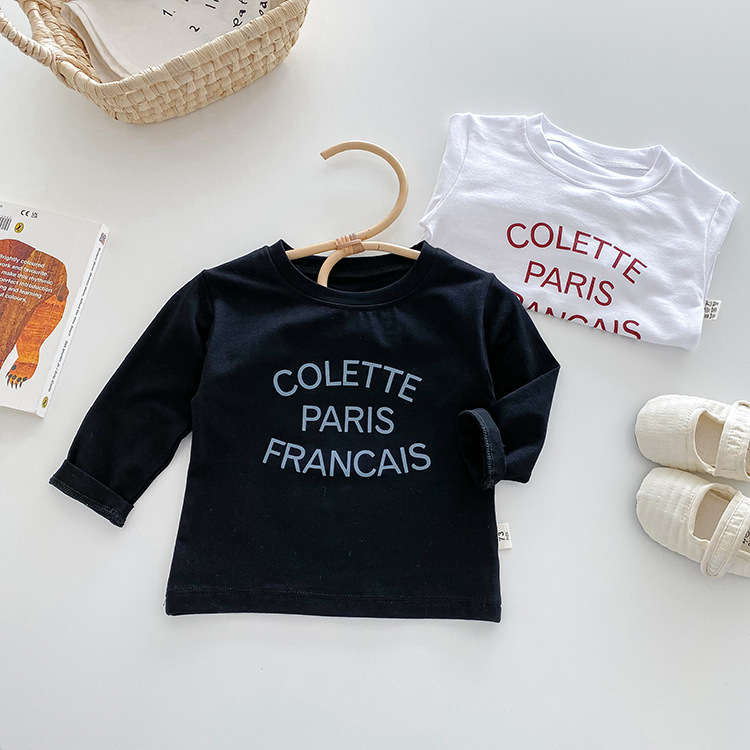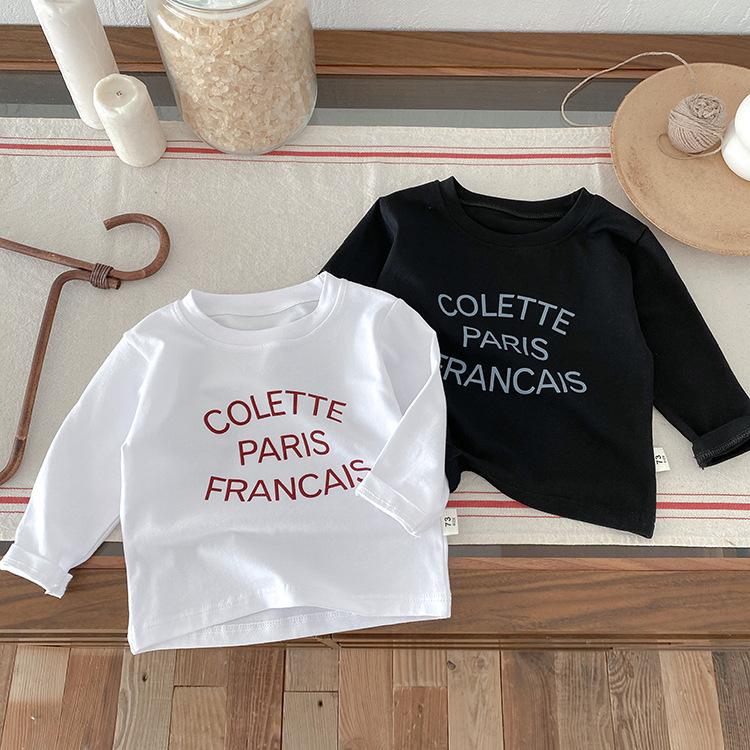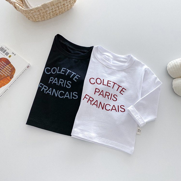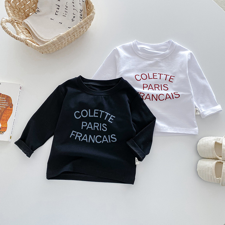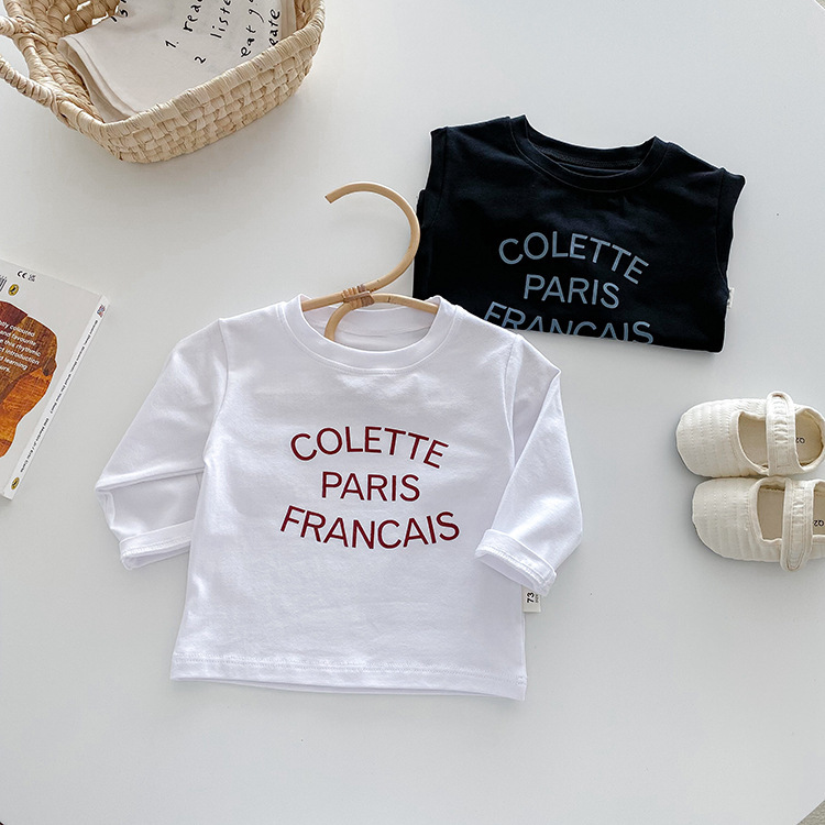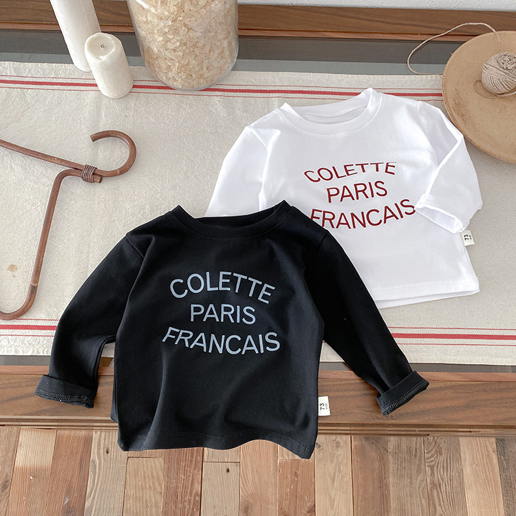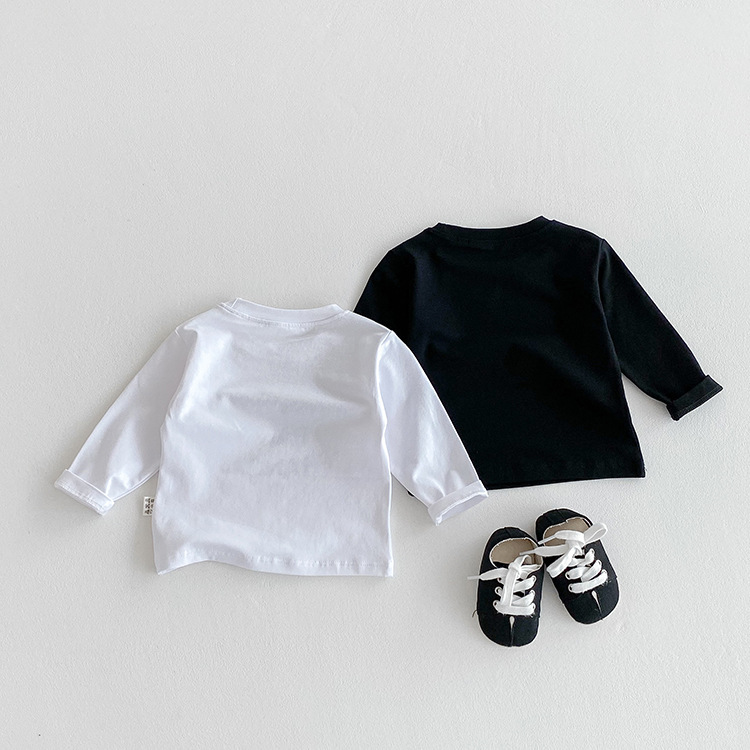 2025 봄, 가을 새로운 스타일 유아 및 아동 의류 흑백 문자 순수 코튼 캐주얼 긴팔 티셔츠 봄, 가을스토어 가기