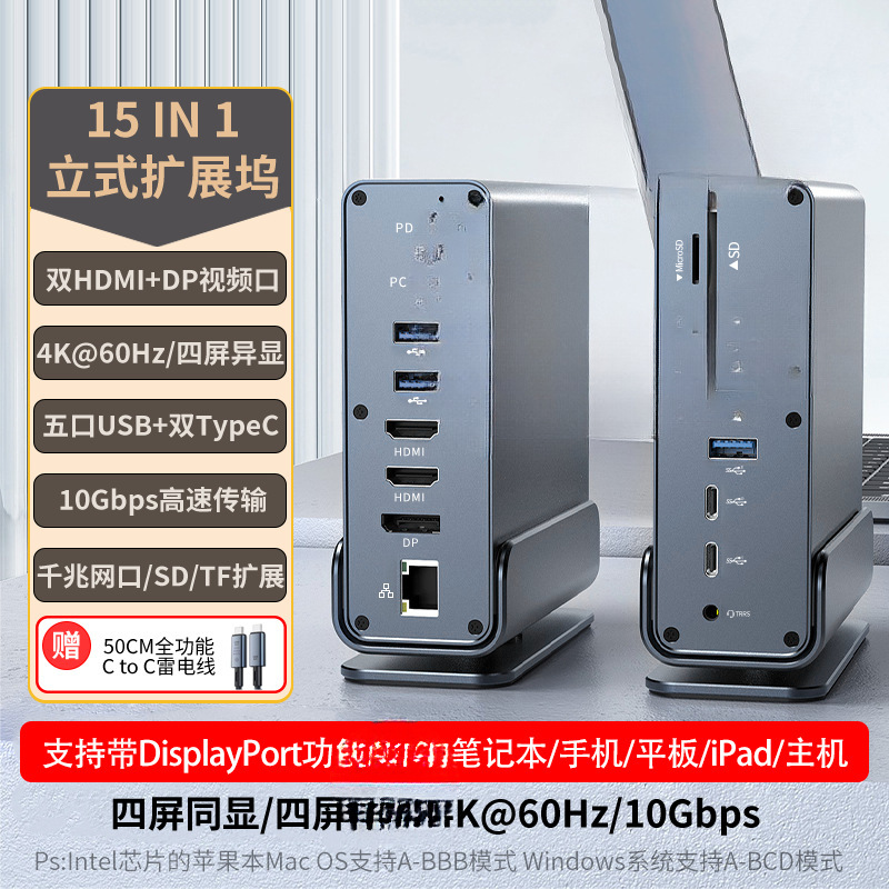 • 15-in-1 데스크탑 도킹 스테이션[4화면 독립 디스플레이 + 4K@60Hz + 기가비트 이더넷 포트 + USB] Win 4화면 독립 디스플레이/Mac 듀얼 화면 독립 디스플레이