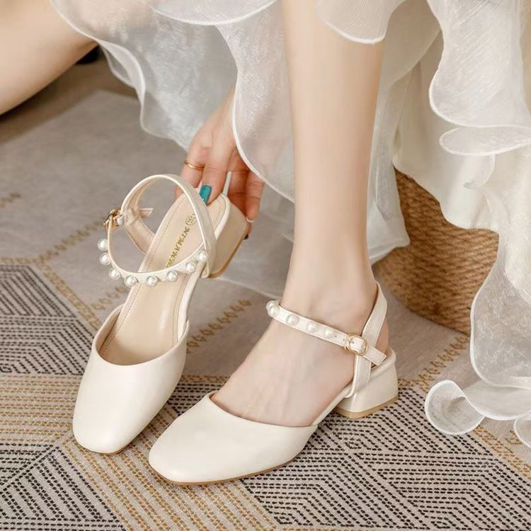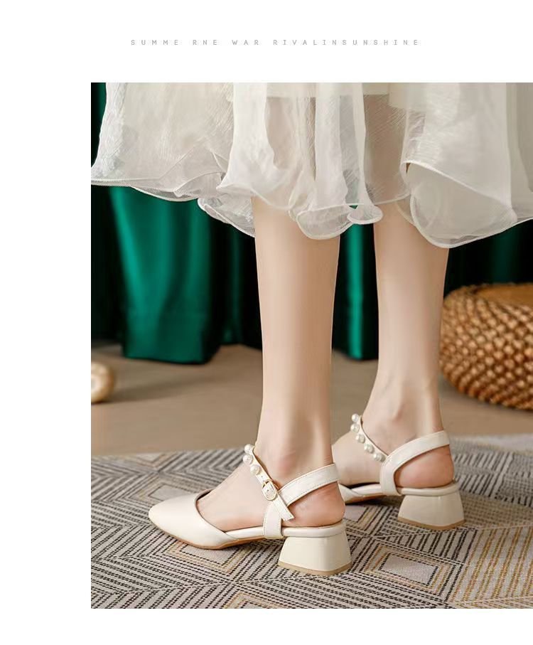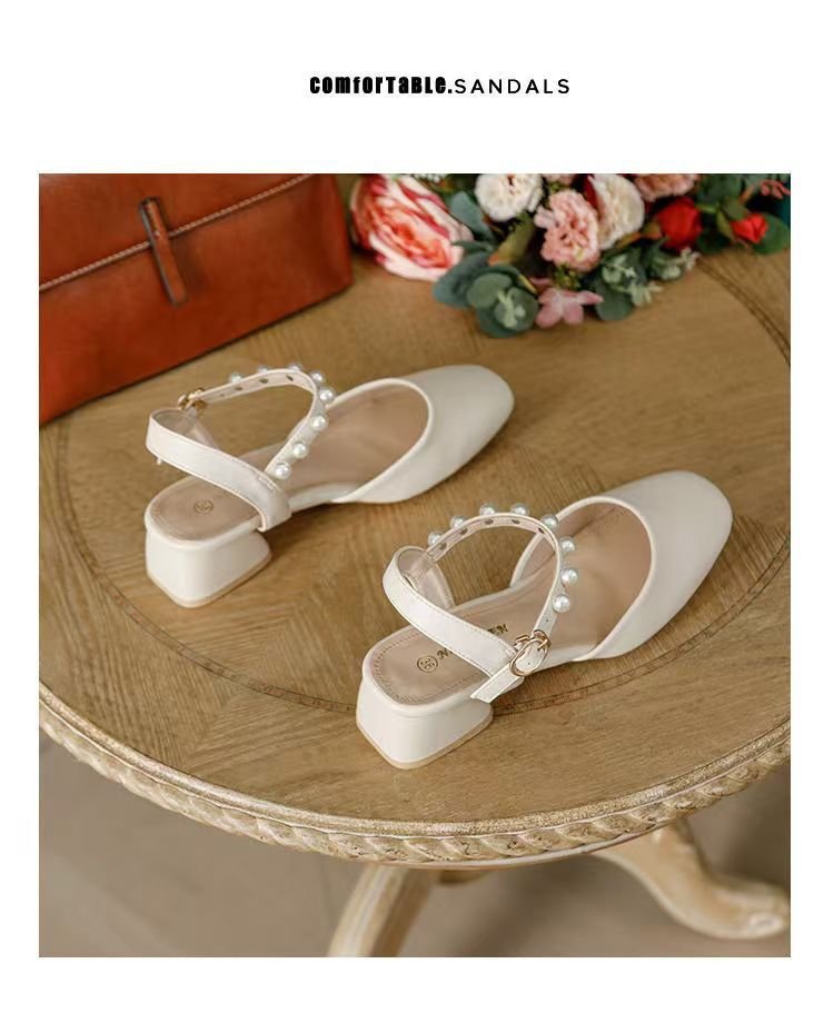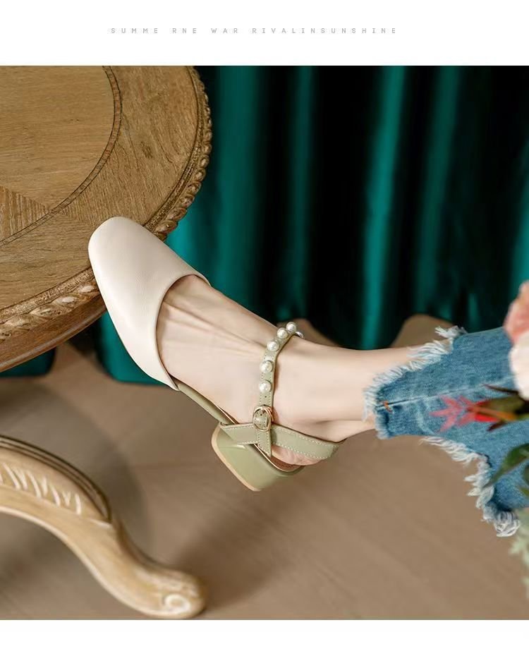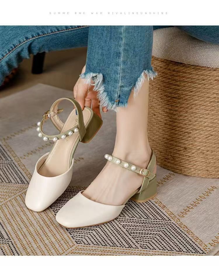 2025년 여름 여성을 위한 샌들 새로운 스타일의 스퀘어 토 버클 스트랩 두꺼운 굽 중간 굽 토 펄 젠틀 로마 스타일 여성 신발스토어 가기