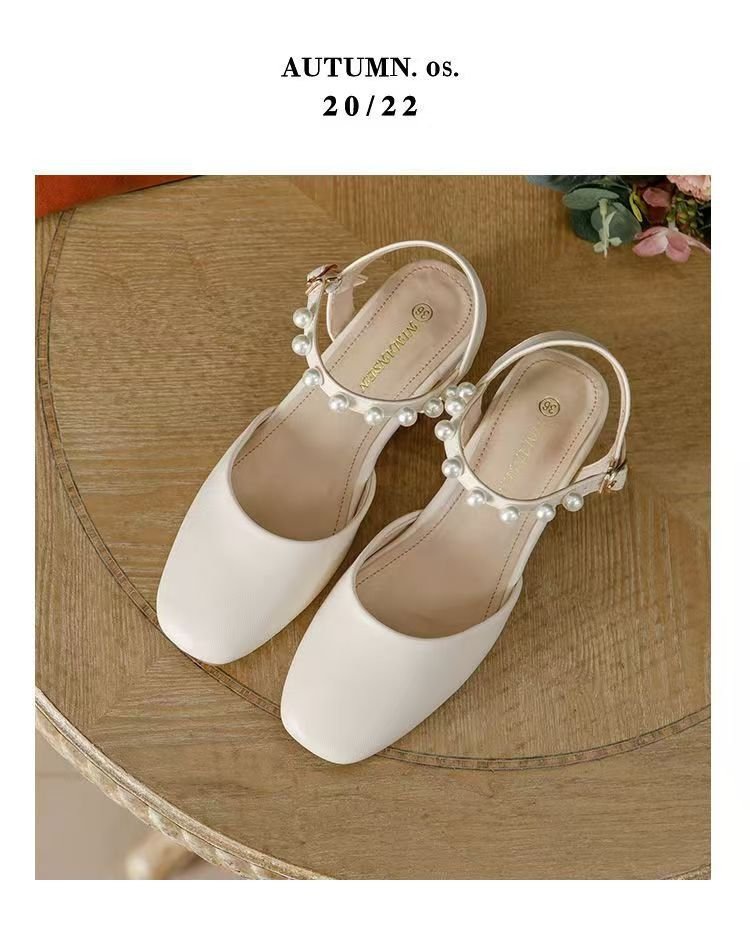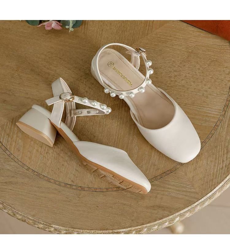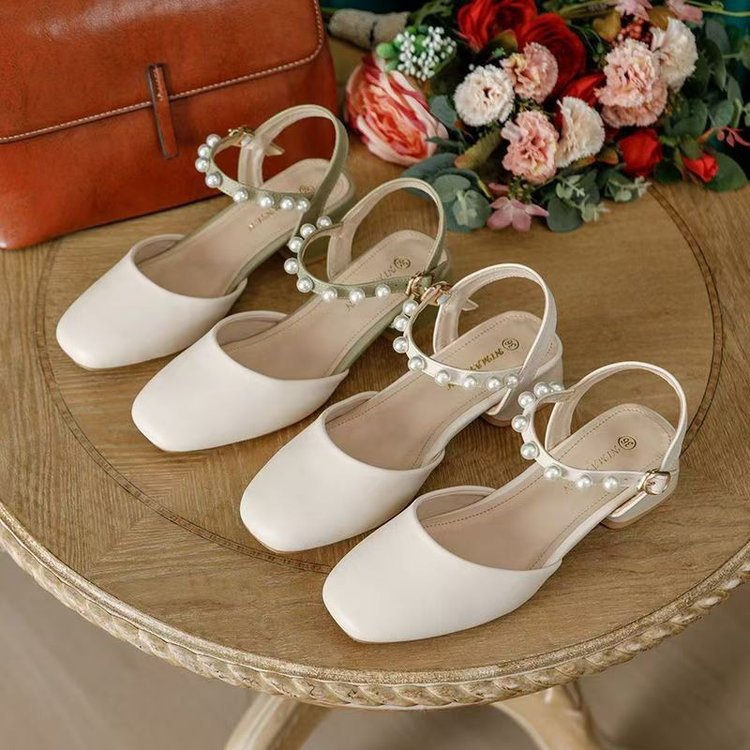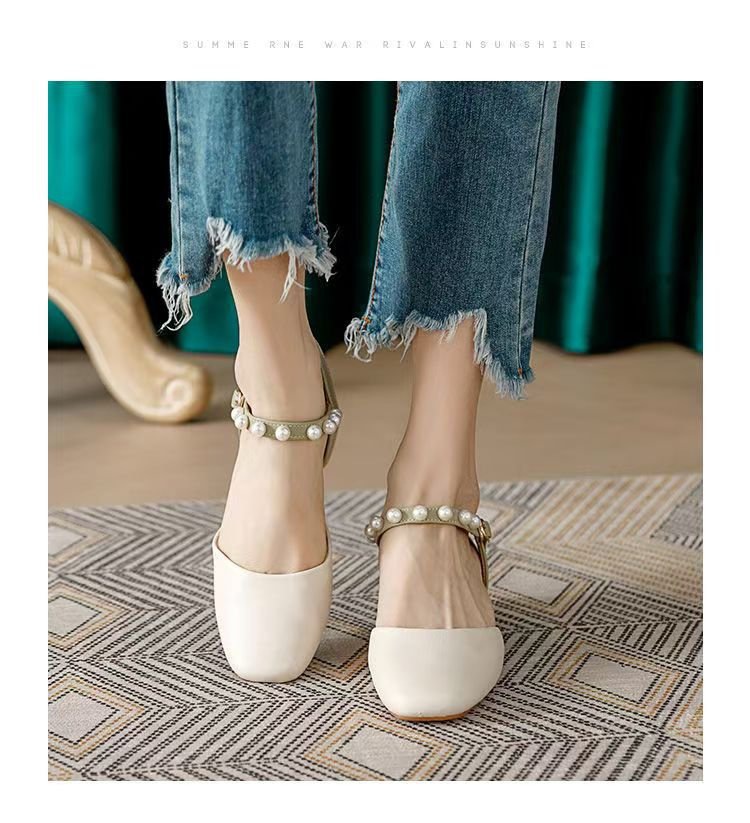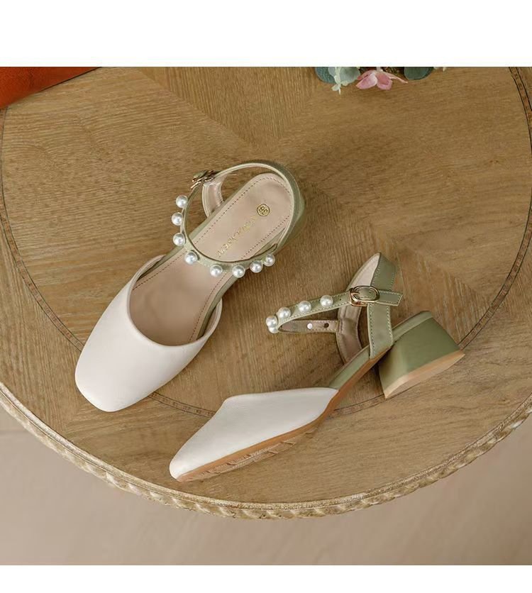 2025년 여름 여성을 위한 샌들 새로운 스타일의 스퀘어 토 버클 스트랩 두꺼운 굽 중간 굽 토 펄 젠틀 로마 스타일 여성 신발스토어 가기