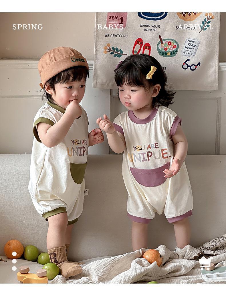 아기 귀여운 만화 가방 여름 얇은 반팔 가운 남성과 여성 아기 시원하고 통기성이 뛰어난 캐주얼 짧은 크롤링 옷스토어 가기