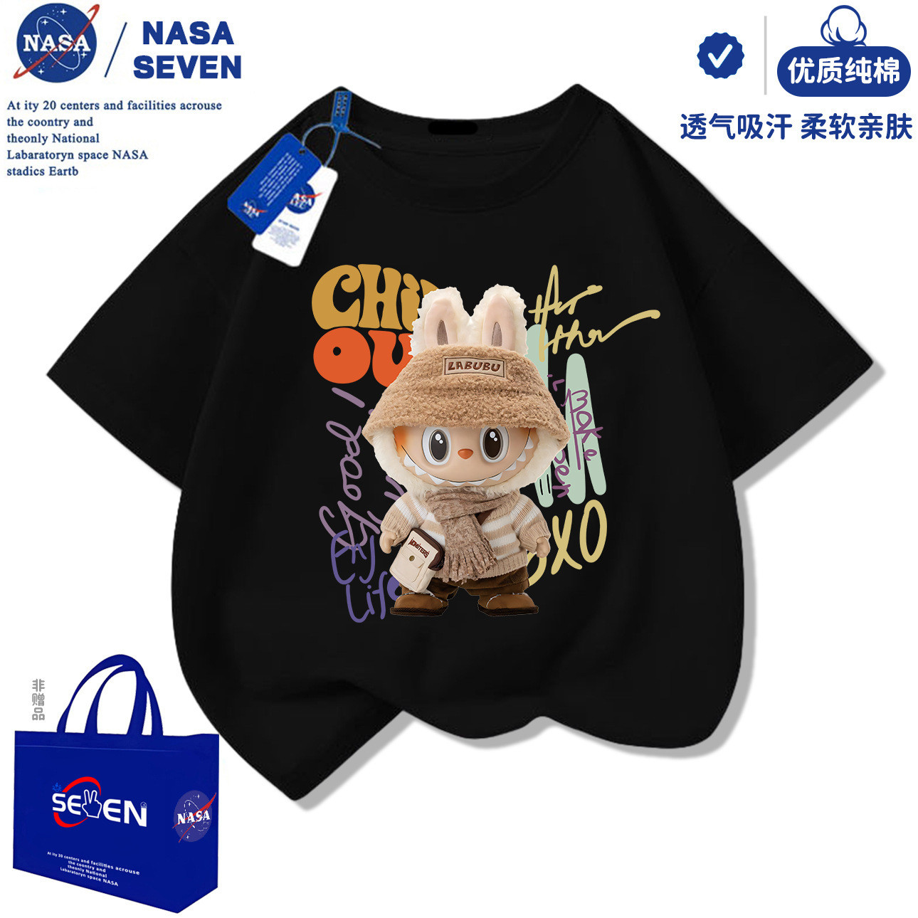 NASA 만화 labubu 순수 코튼 티셔츠 반팔 소년과 소녀 여름 새로운 labubu 반팔 캐주얼 중대형 어린이스토어 가기