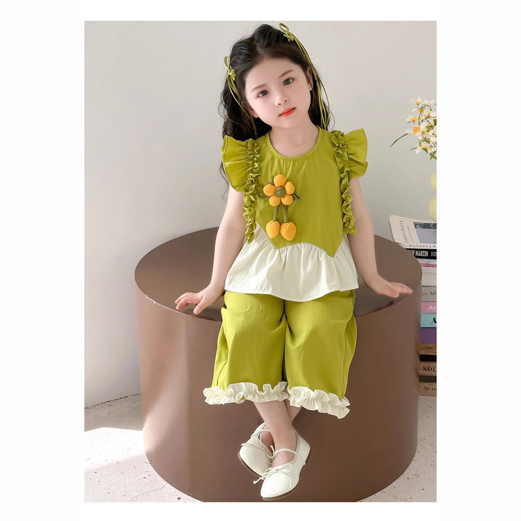 여자 여름 정장 2025 새로운 스타일 어린 소녀의 세련된 입체 꽃 플라잉 슬리브 레이스 탑과 바지 투피스 세트