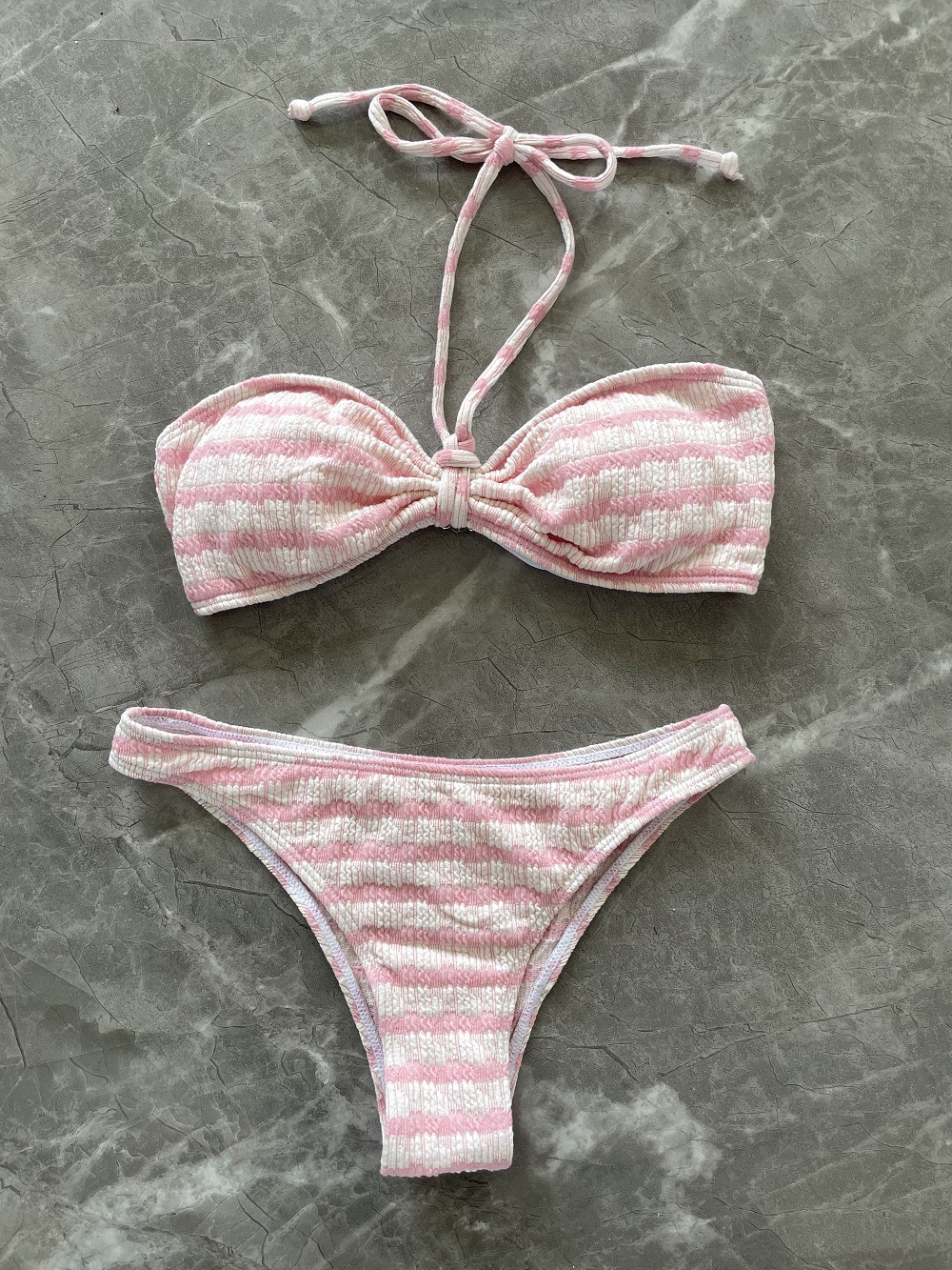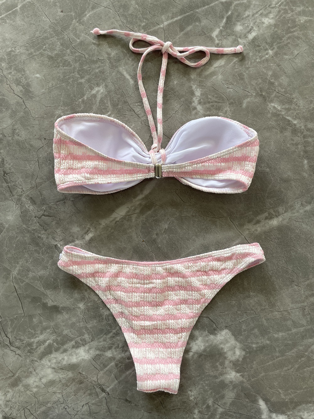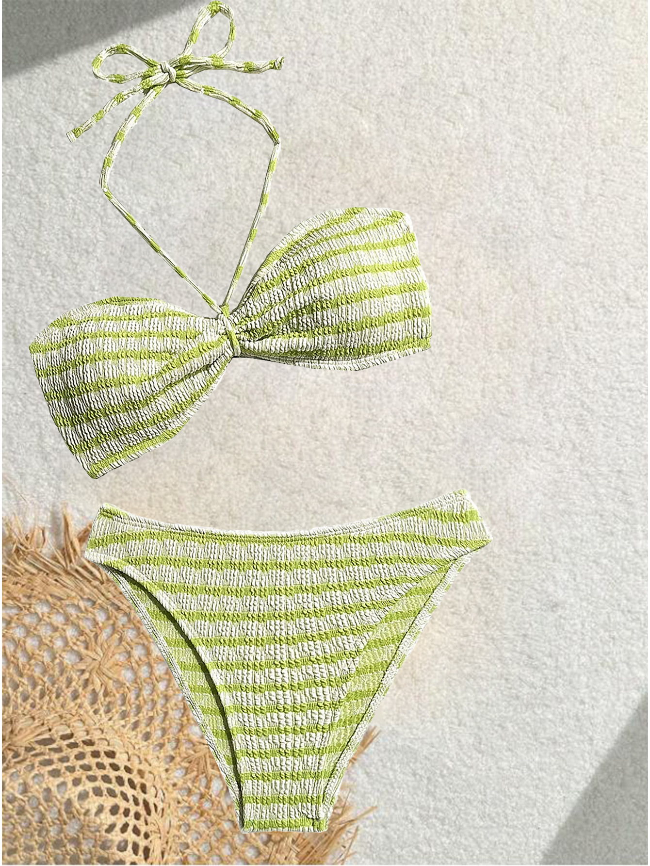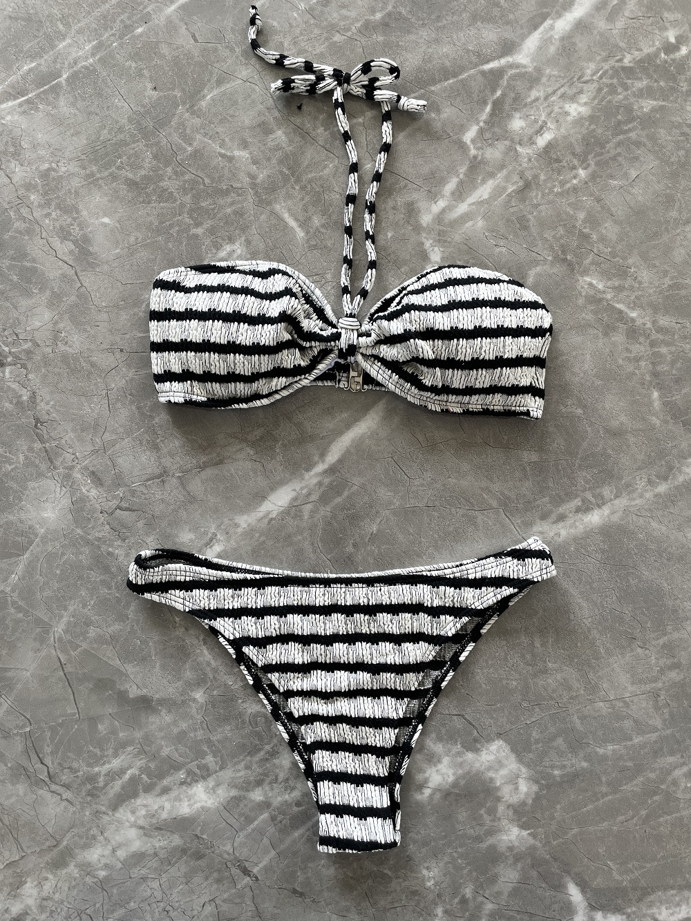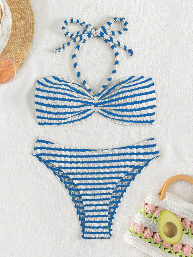 2025 새로운 줄무늬 스플릿 수영복 여성 고급 온천 유럽과 미국의 내구성 레이스 업 ins 대외 무역 수영복스토어 가기