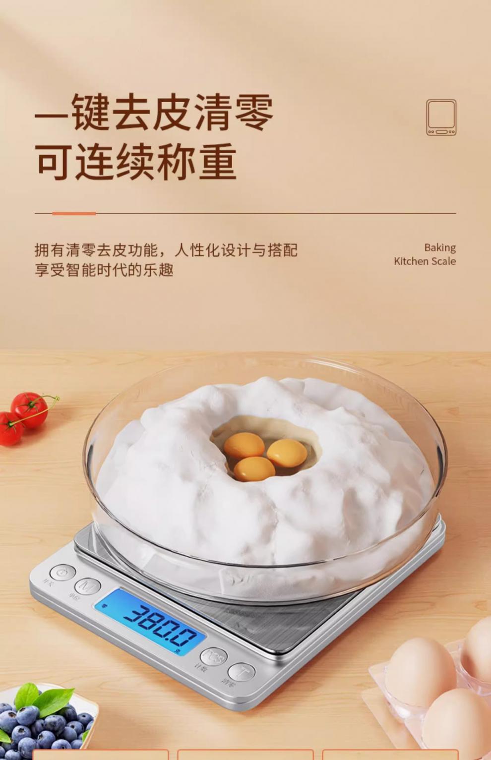 • 충전식 삼용모델 500g/0.01g 무게 + 저울그릇 + 이중트레이 + 계량컵 + 방수스티커