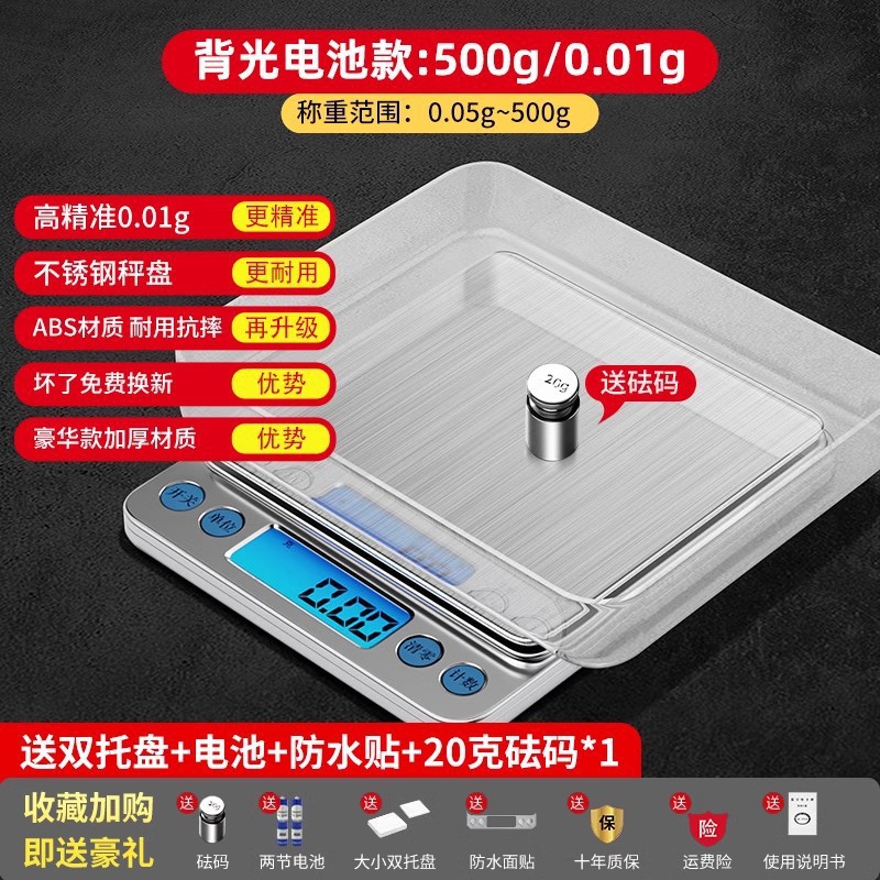 • 배터리 모델 백라이트/500g/0.01g에는 더블 트레이 + 배터리 + 8가지 멋진 선물이 함께 제공됩니다.